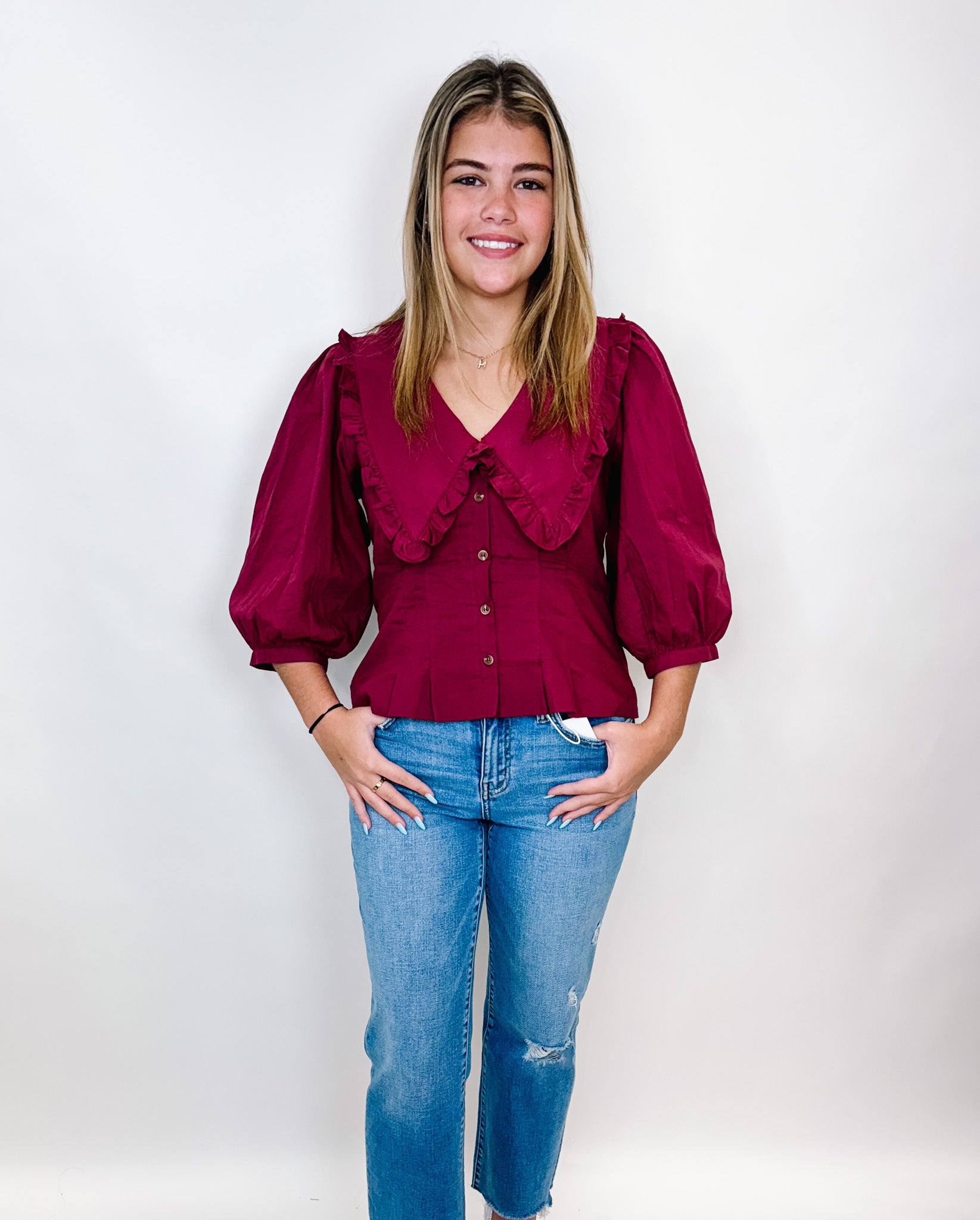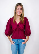 Indulge in exquisite elegance with our STL Peter Top. With a fashionable half sleeve and darling Peter Pan collar, this button down blouse exudes sophistication and style. Perfect for any occasion, elevate your wardrobe with this luxurious piece.