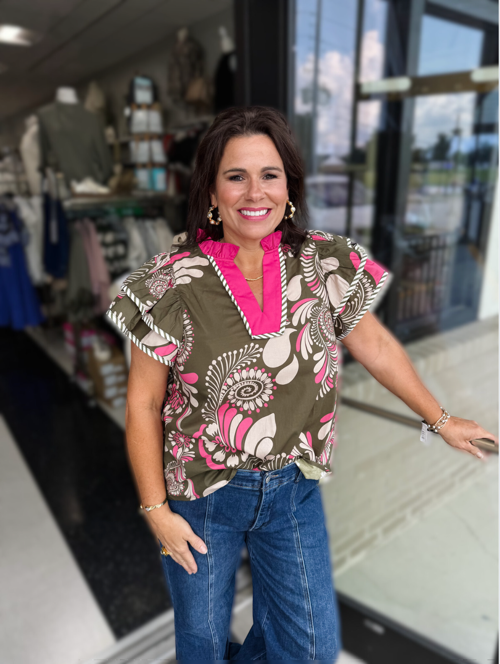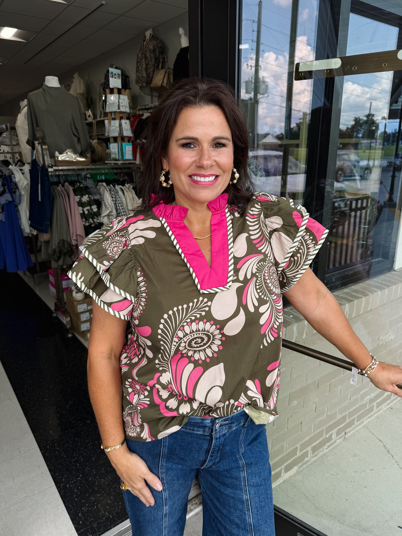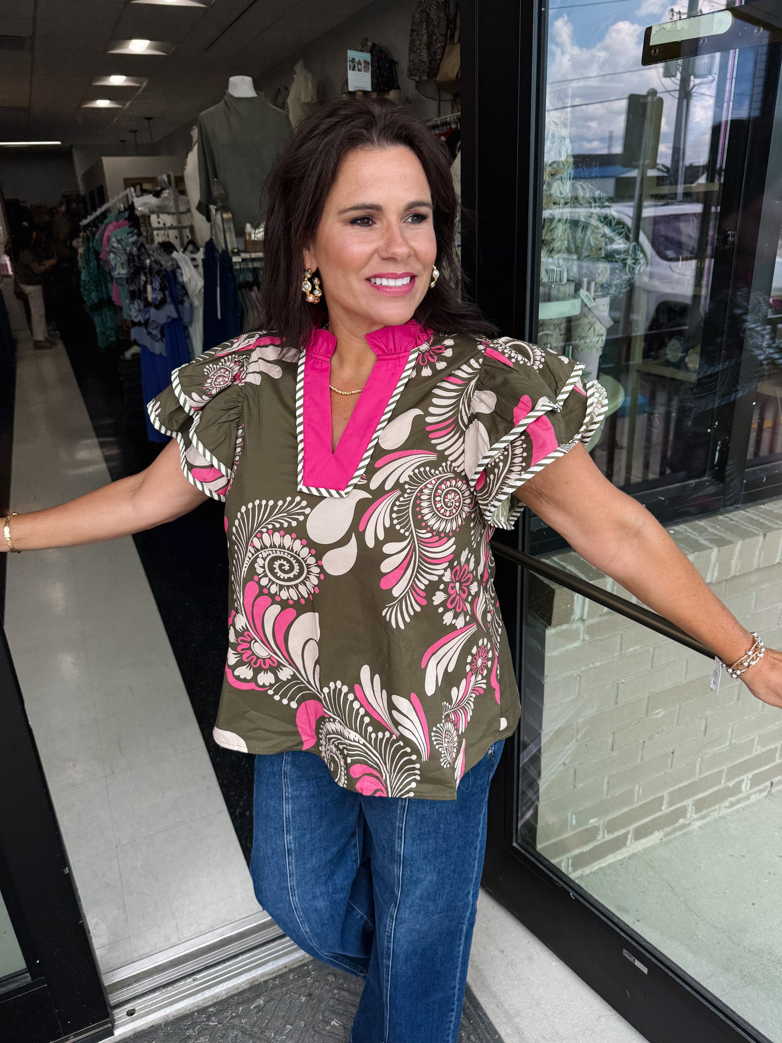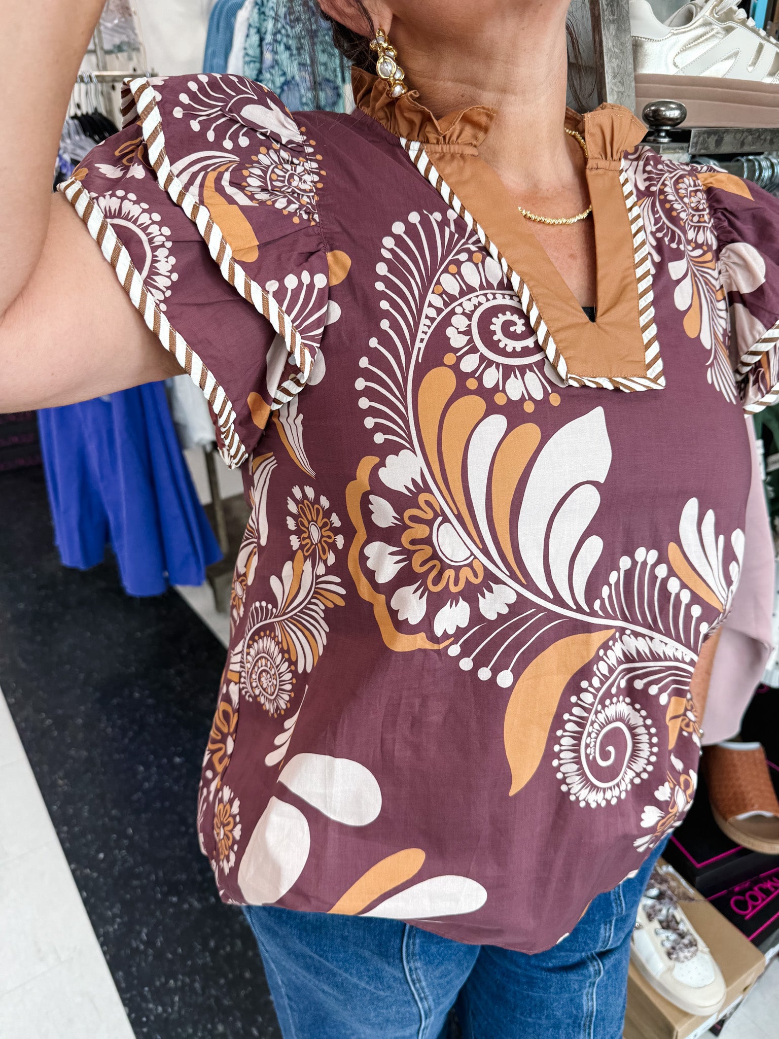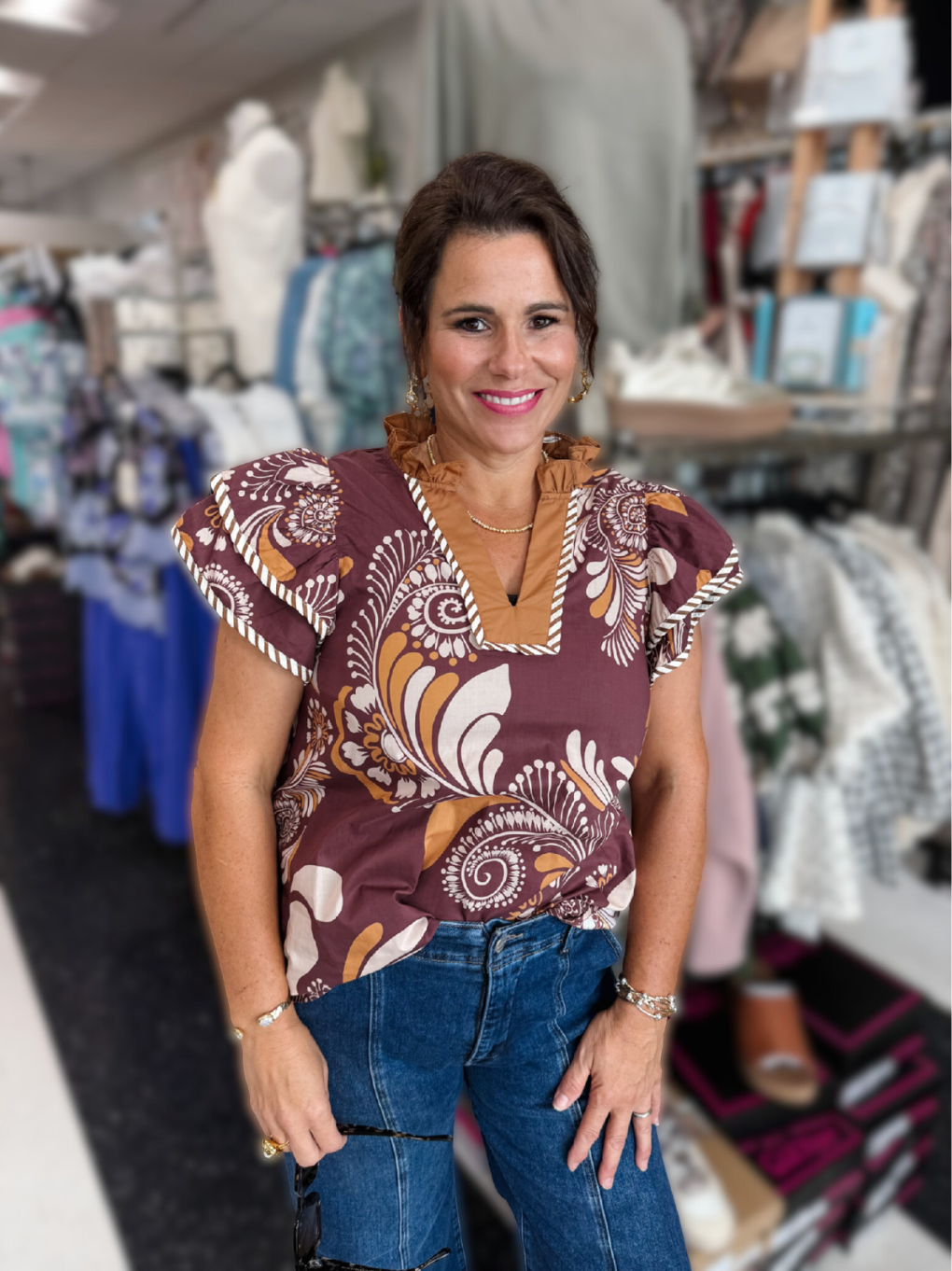 This paisley print top combines elegance with delicate design, featuring tiered flutter sleeves and a contrast ruffle accent along the V-neckline. Crafted from lightweight woven fabric, it offers a comfortable, non-sheer fit without lining, perfect for a refined yet effortless look.