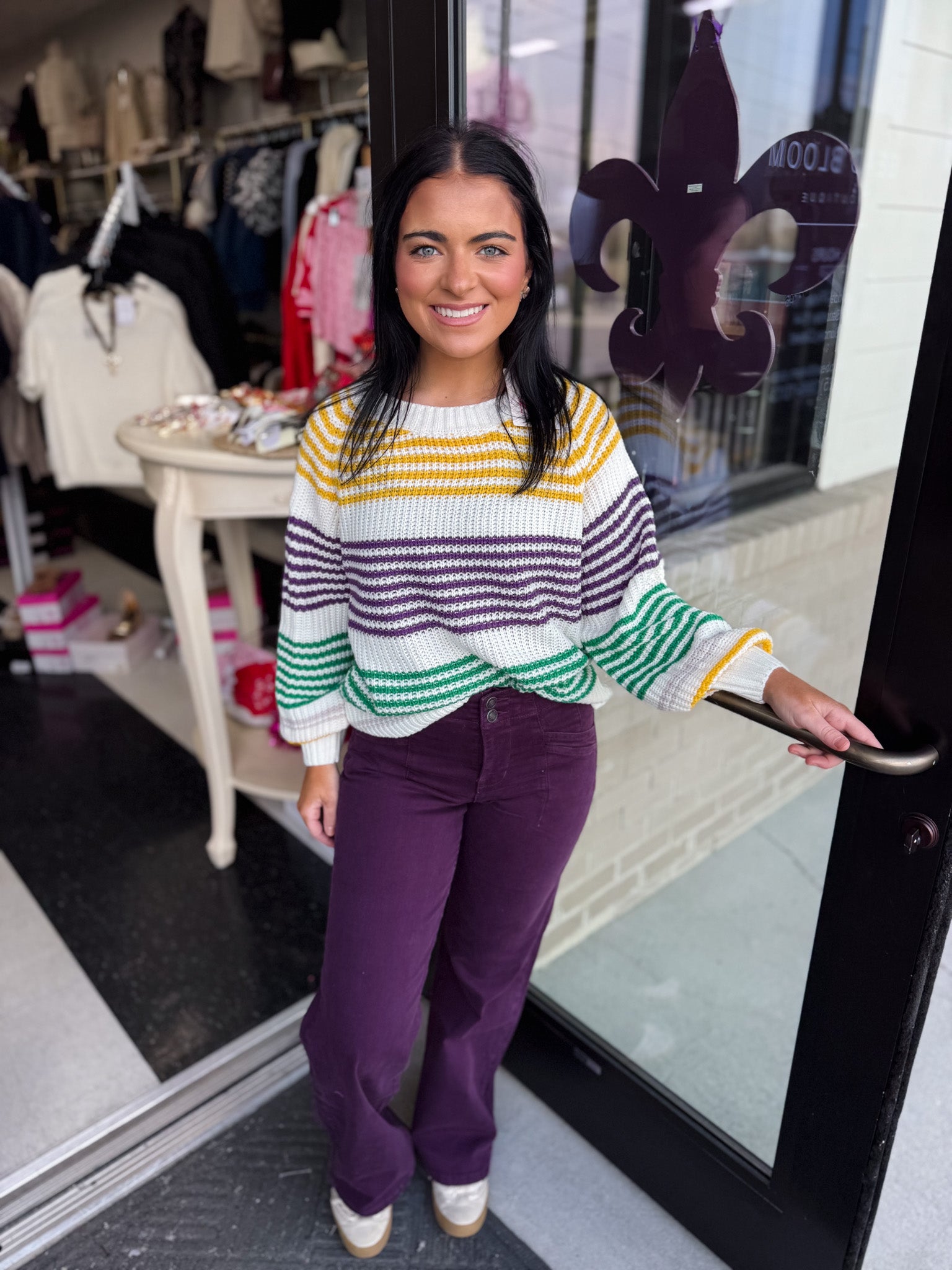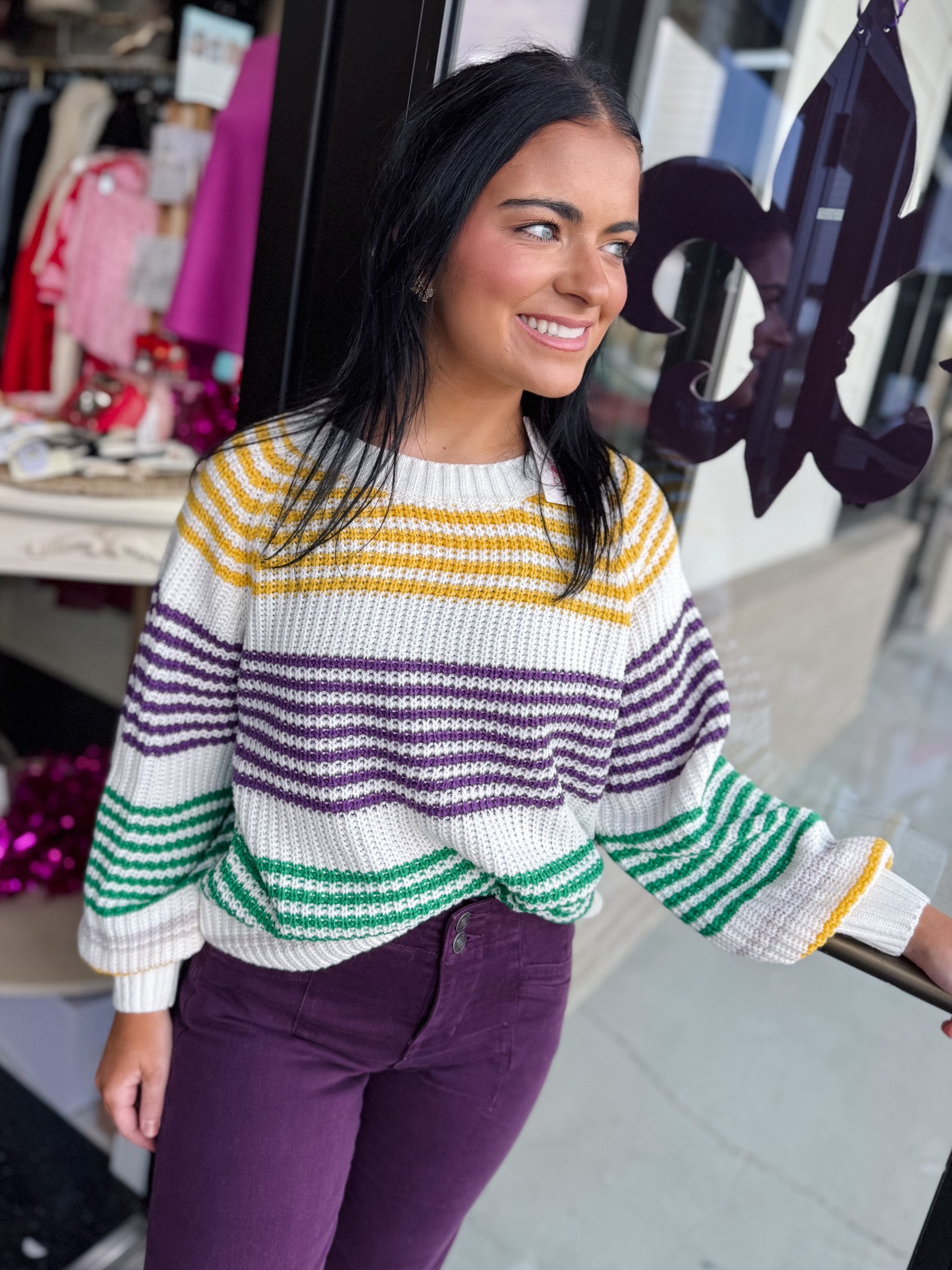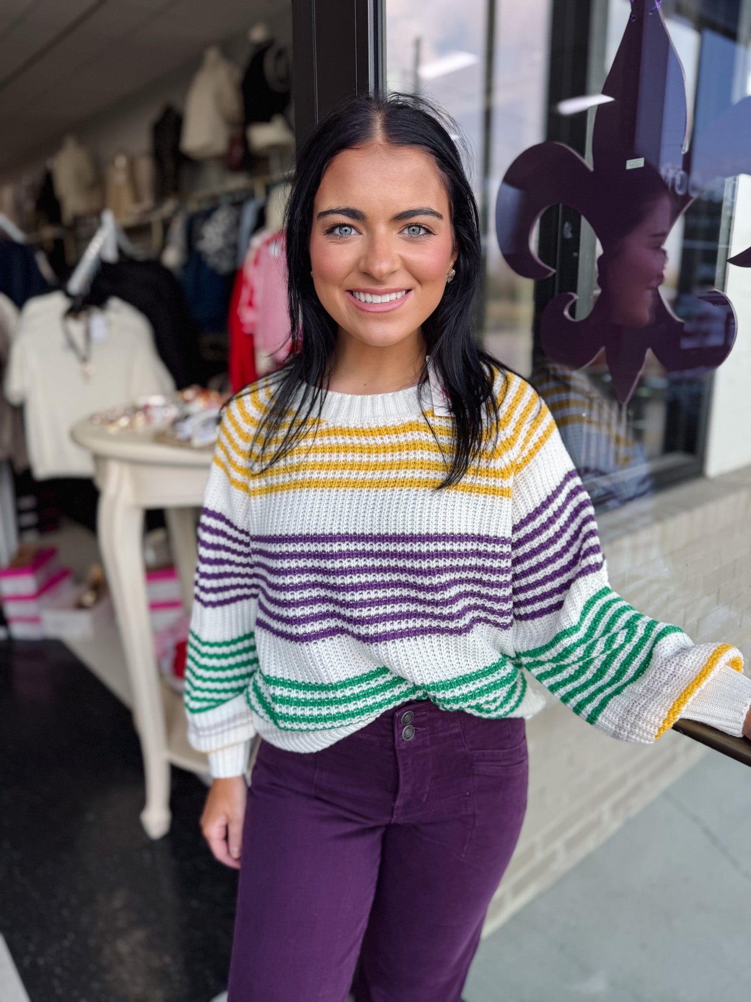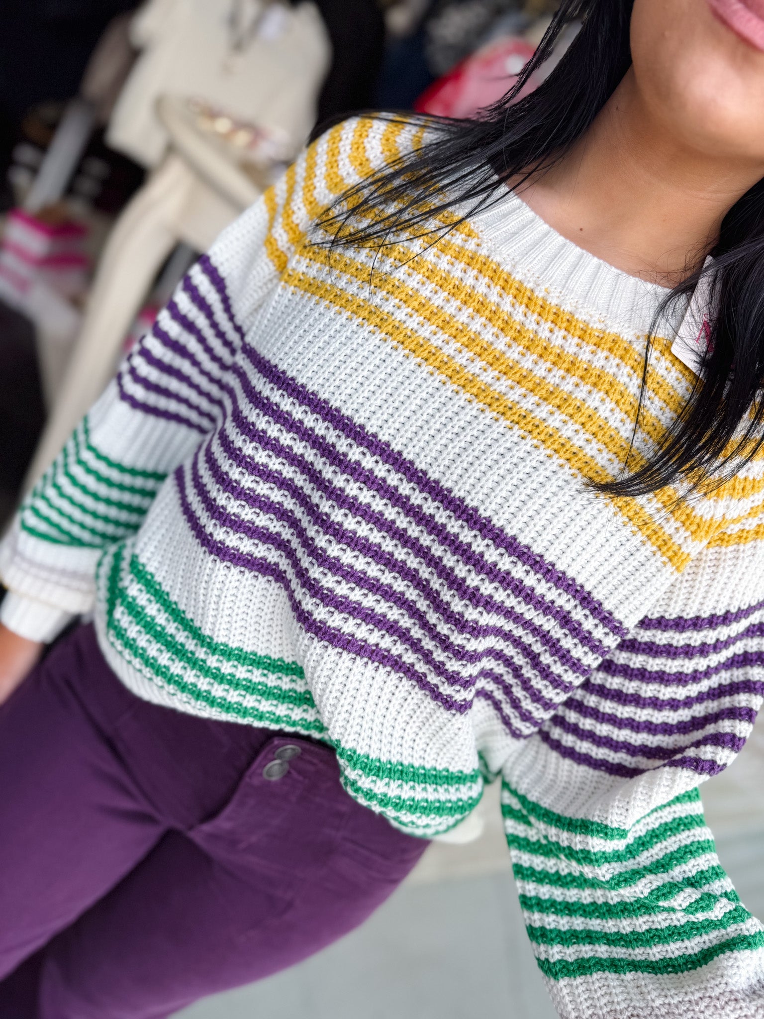 Mardi Gras Striped V-Neck Sweater w/ Pockets