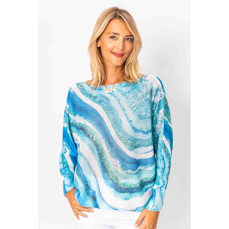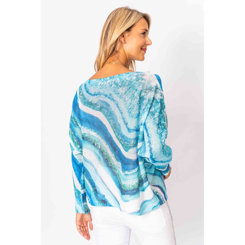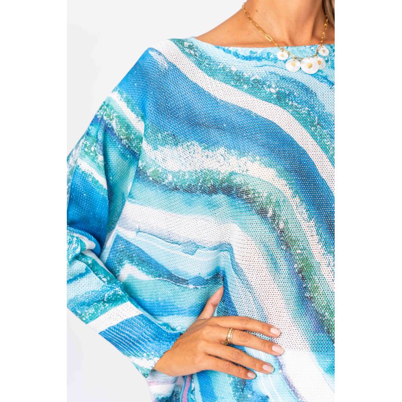 Embrace the beauty of the ocean with this stunning Italian-crafted top featuring a gorgeous wave pattern. The sophisticated batwing sleeves bring effortless elegance and movement to your wardrobe.