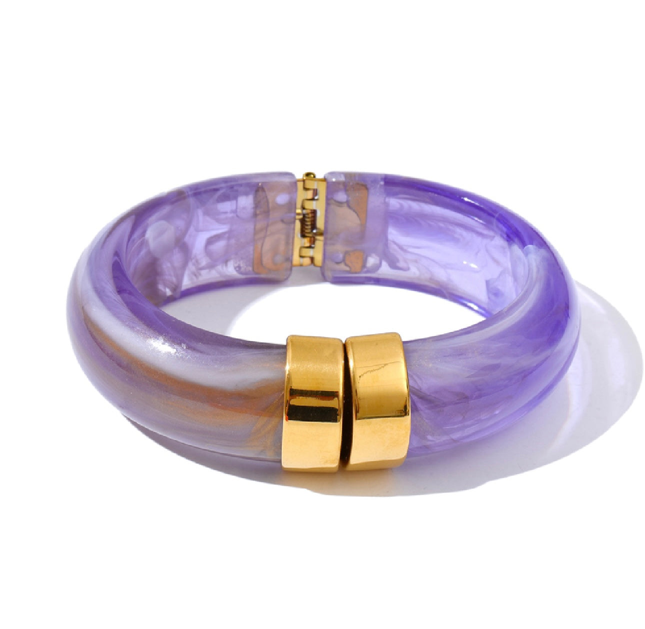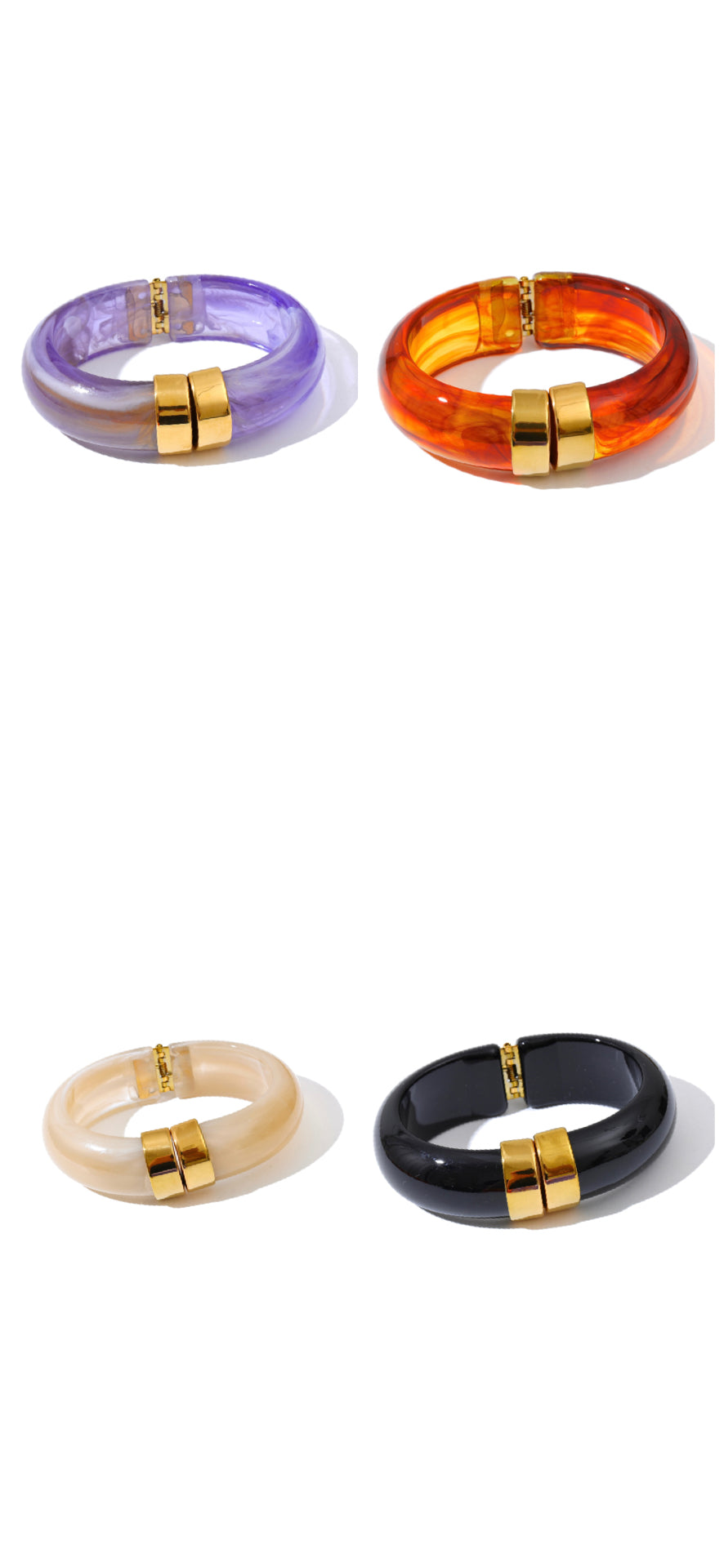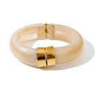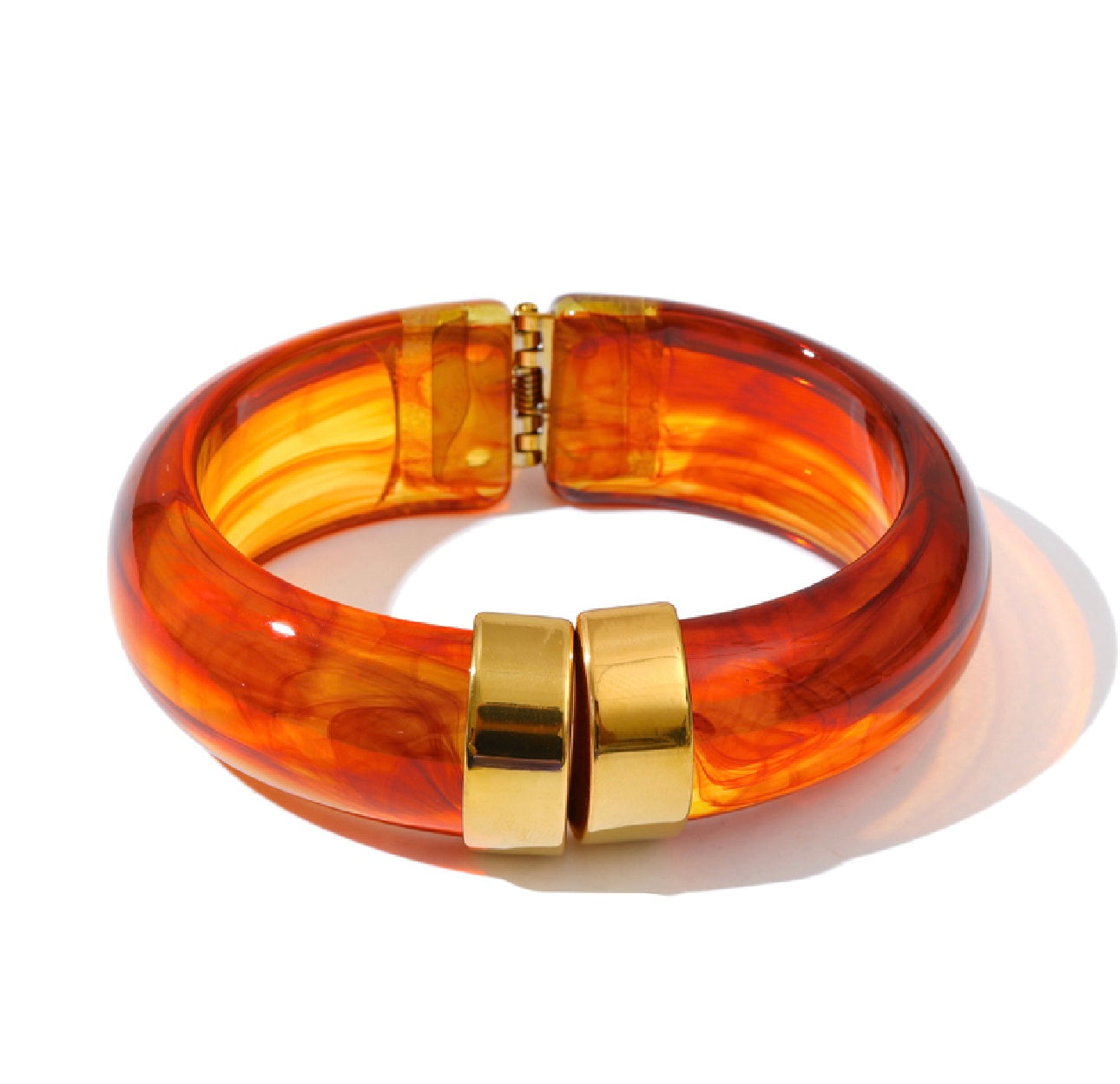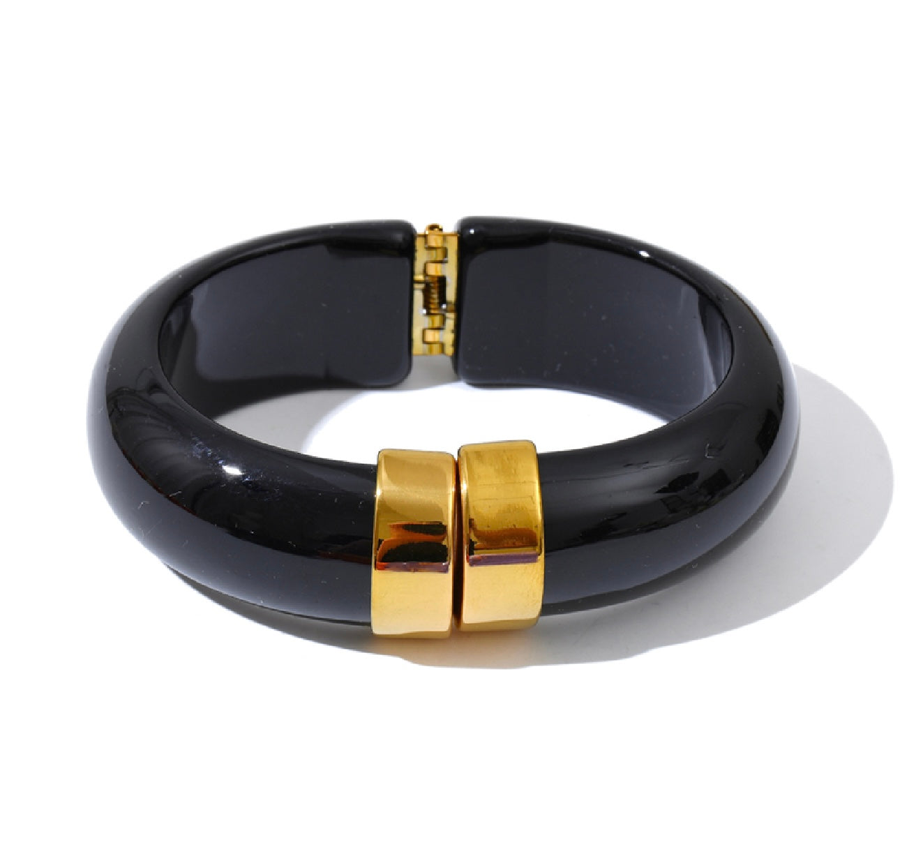 Make a bold yet refined statement with our Valencia Bangle — a glossy, hinge-style bracelet accented with radiant gold hardware. This eye-catching piece balances classic sophistication with modern edge, making it the perfect finishing touch for any outfit.
