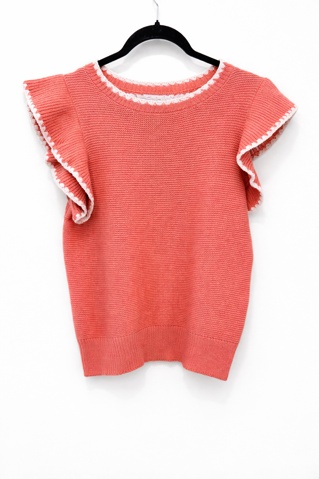 Sweet details and cozy texture make this sweater top a standout piece for your everyday wardrobe. Designed with a classic crew neckline and soft ruffle short sleeves, it features contrast color blanket-stitched edges that add a unique, handcrafted feel. The lightweight knit blend keeps it comfortable and easy to wear while still looking polished.