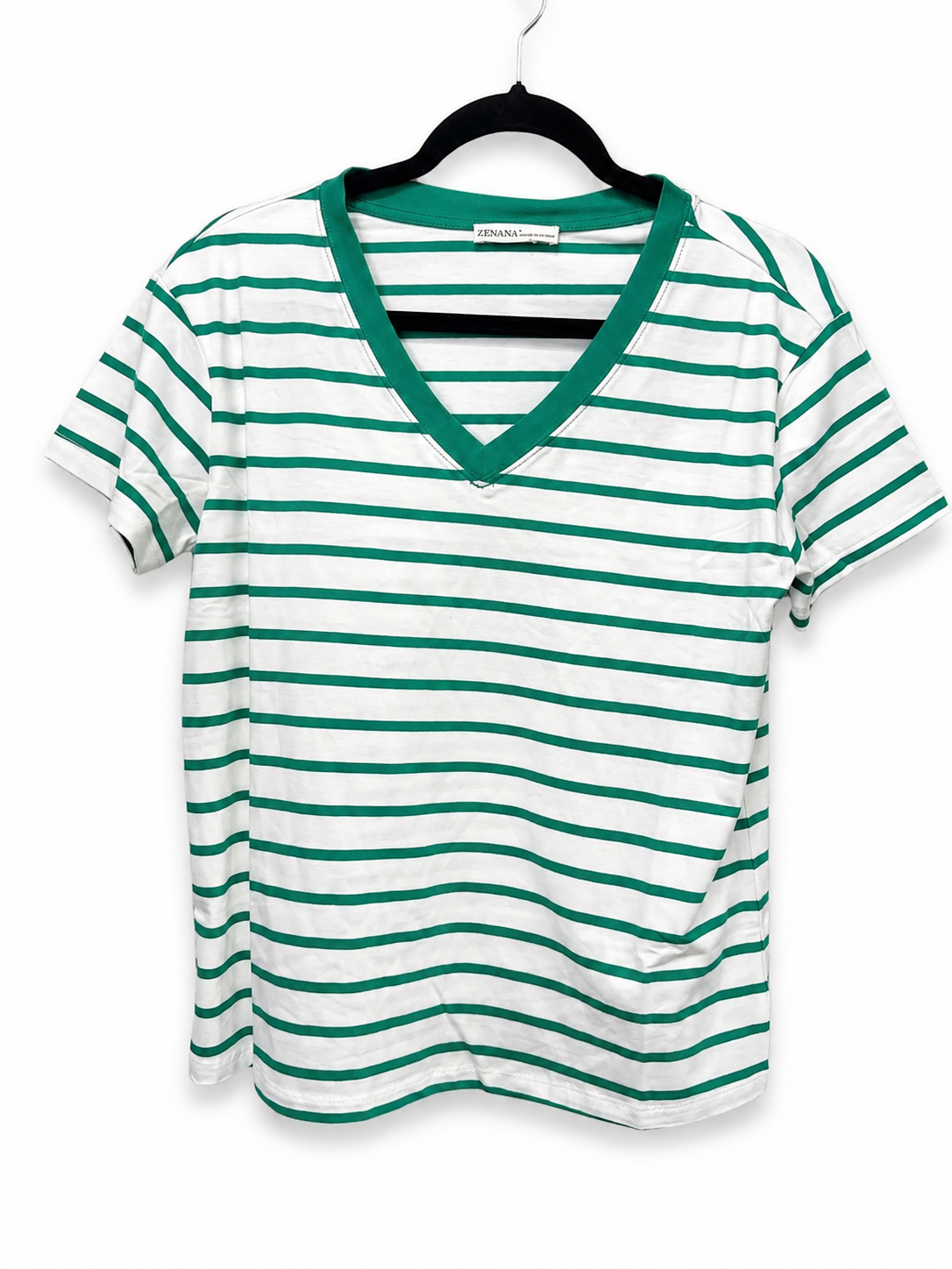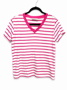 The perfect everyday tee with a little extra style! This striped V-neck features a relaxed fit that’s comfy, flattering, and easy to wear all day long. Made from a soft, stretchy cotton blend, it moves with you while keeping its shape. Whether you dress it up or keep it casual, this is a go-to basic you’ll want in every color!