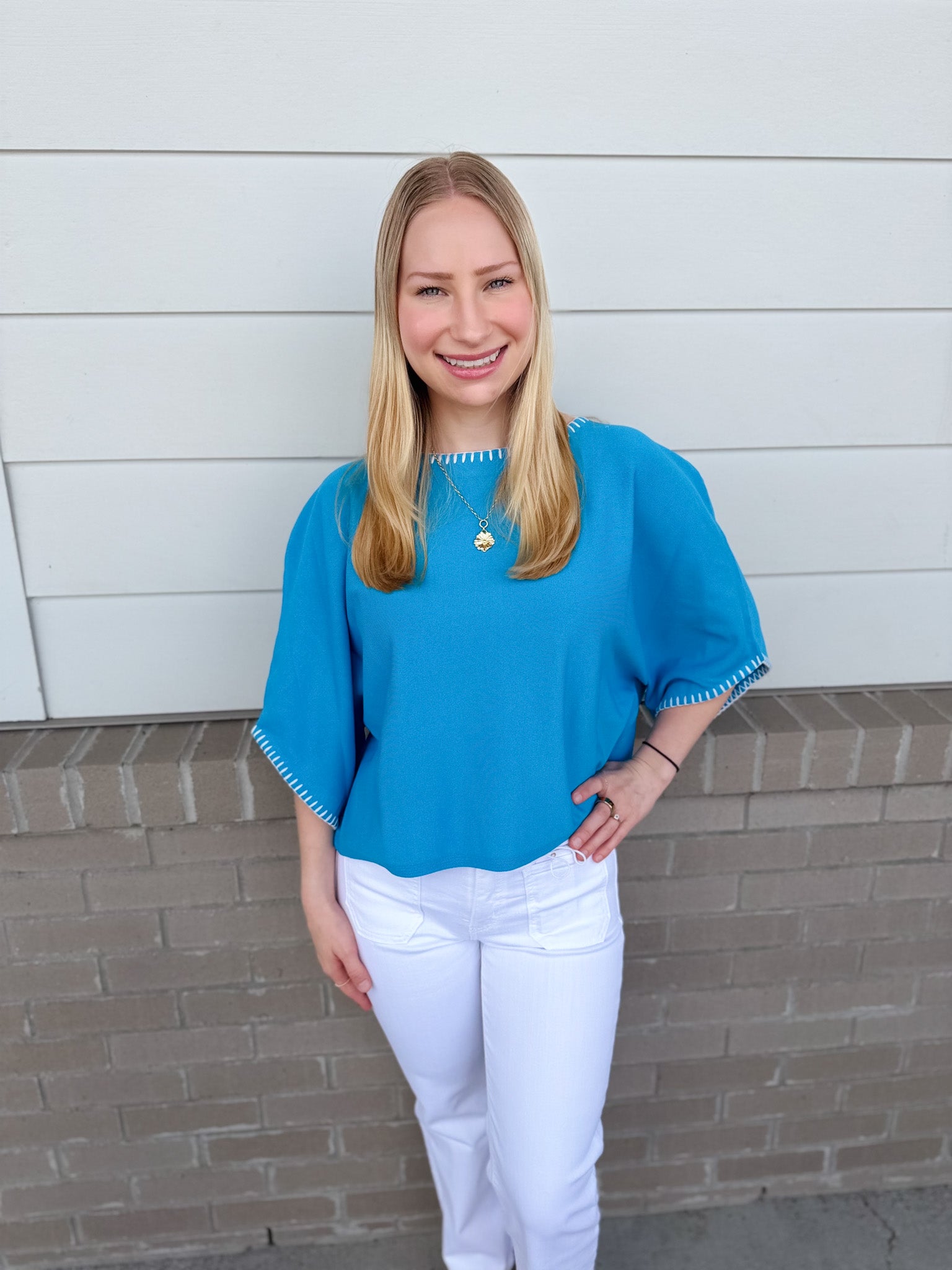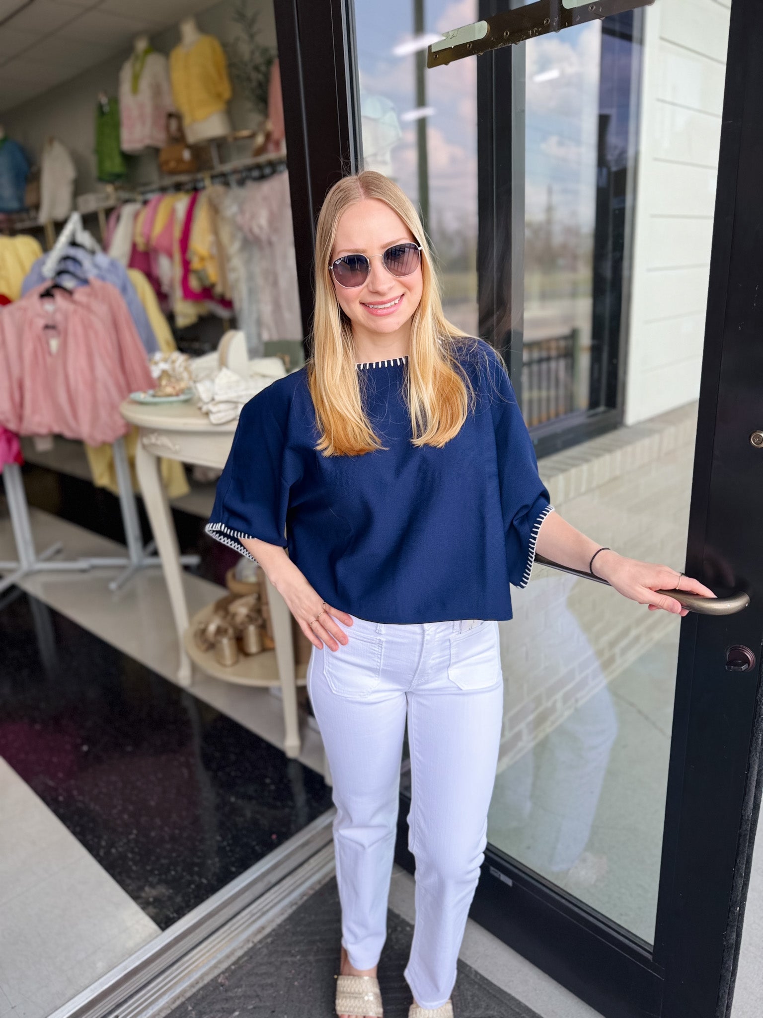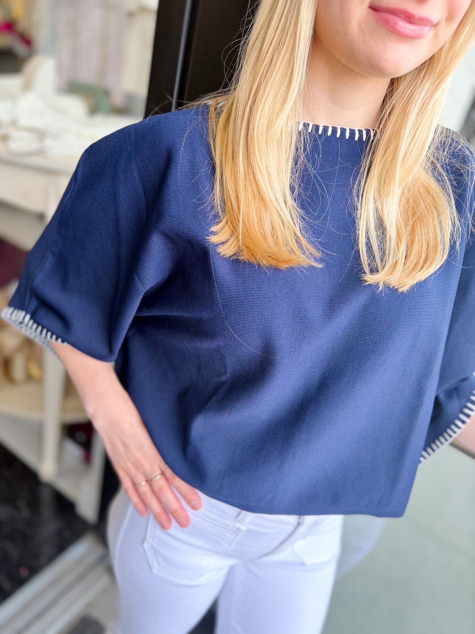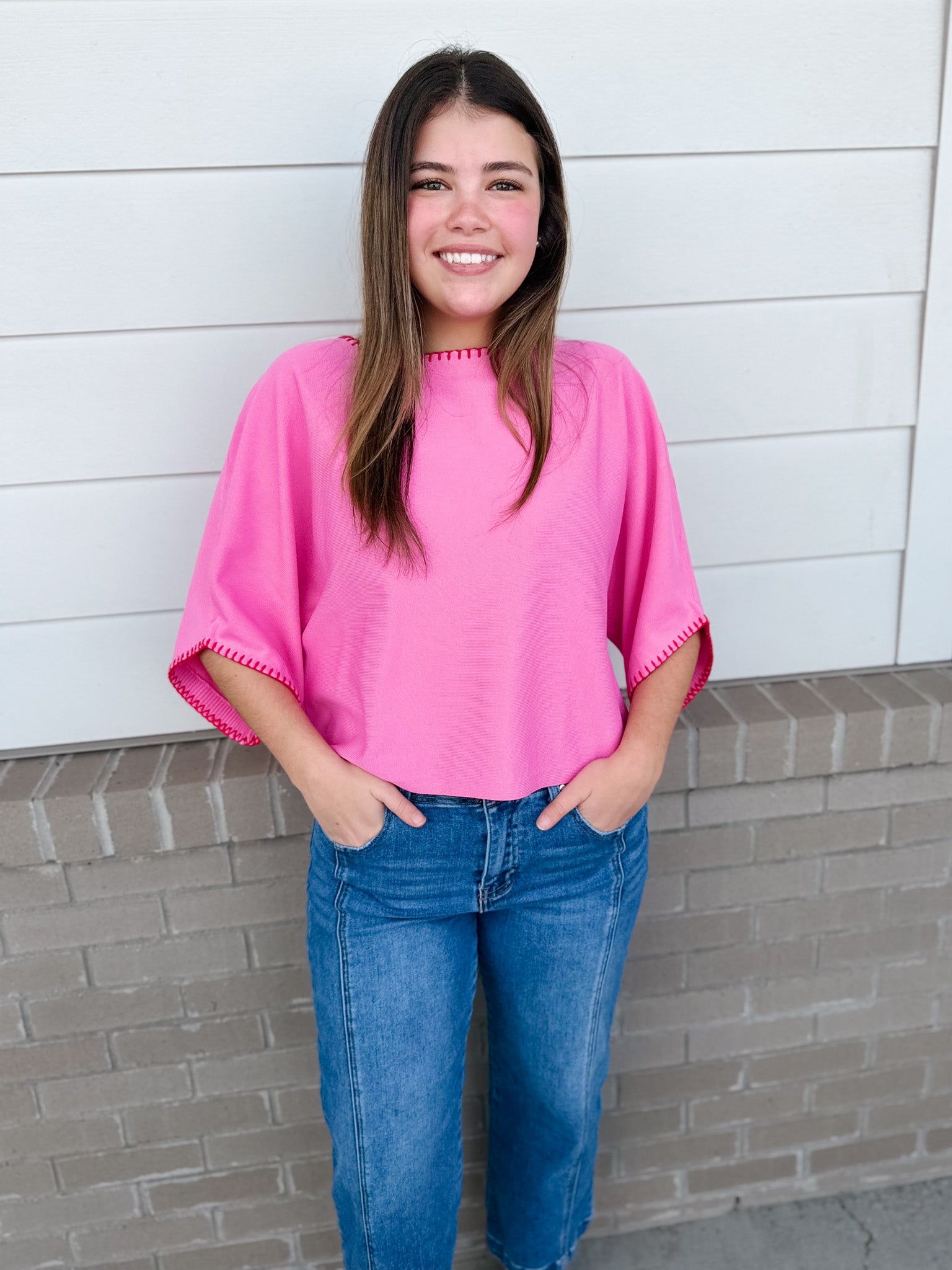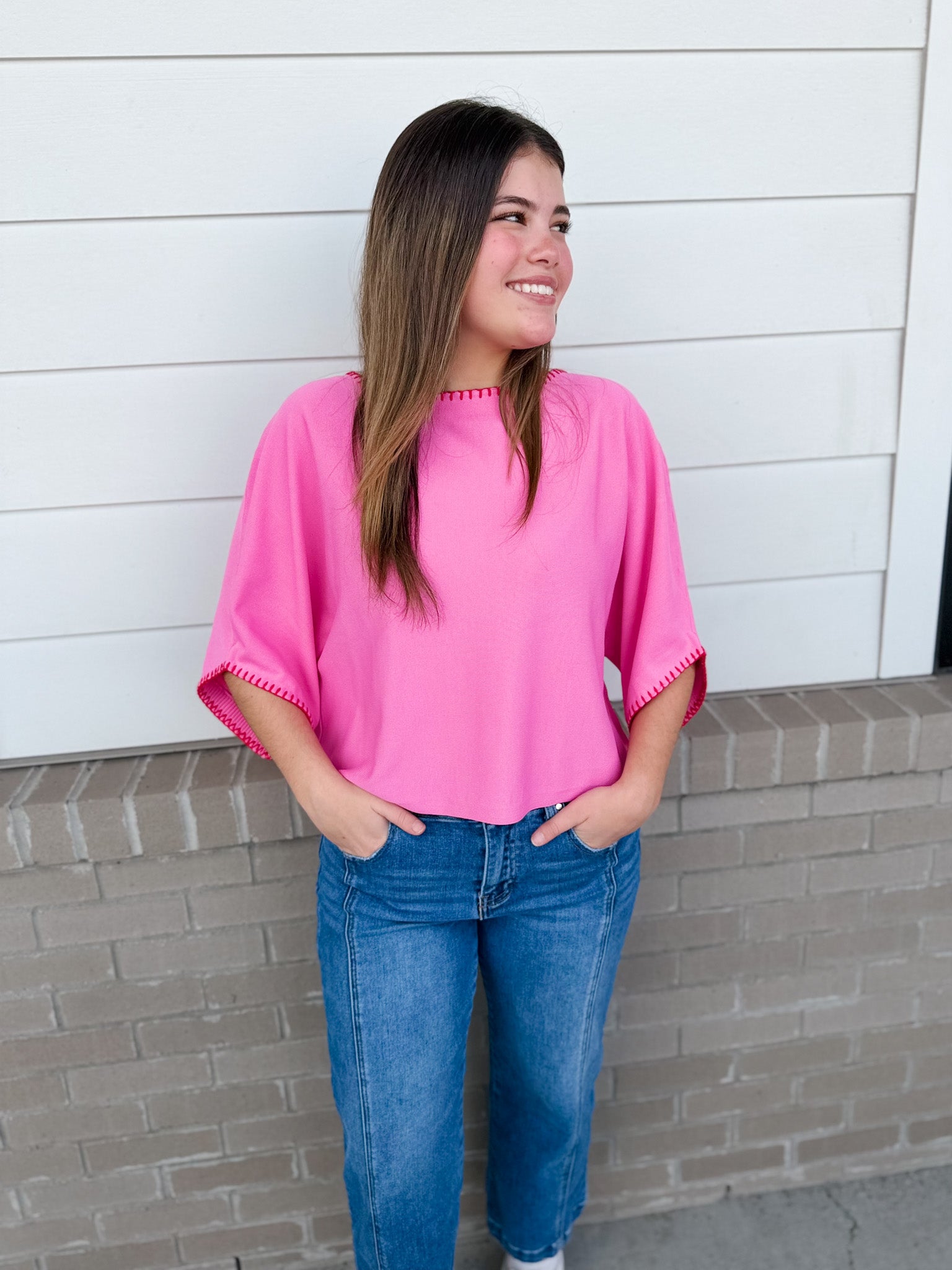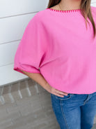 This dolman fit knit top offers a relaxed, contemporary silhouette that's both comfortable and stylish. The waist-length cut creates a flattering proportion, while fun stitch detailing along the neckline and sleeves adds an artisan touch to this versatile piece.