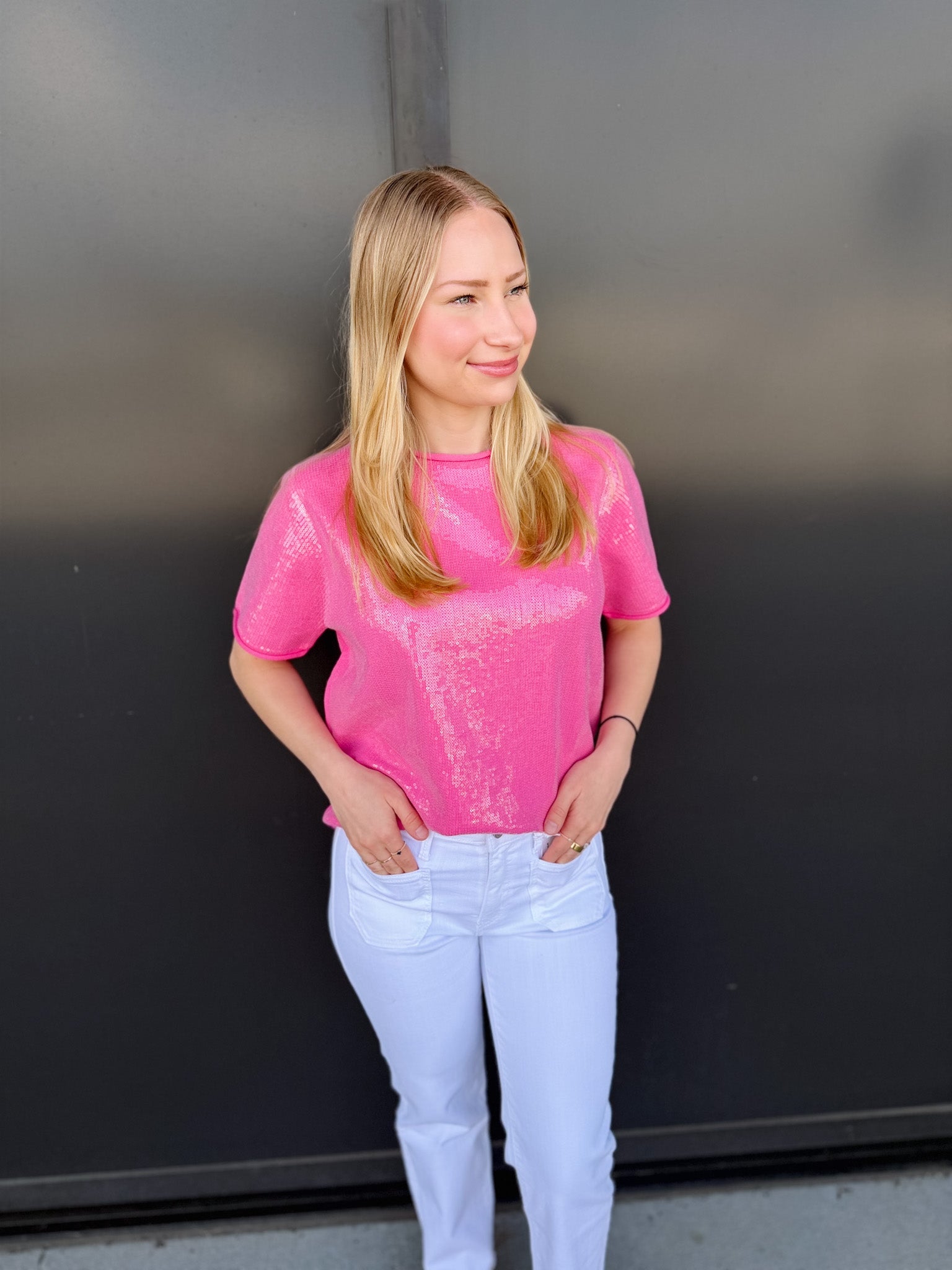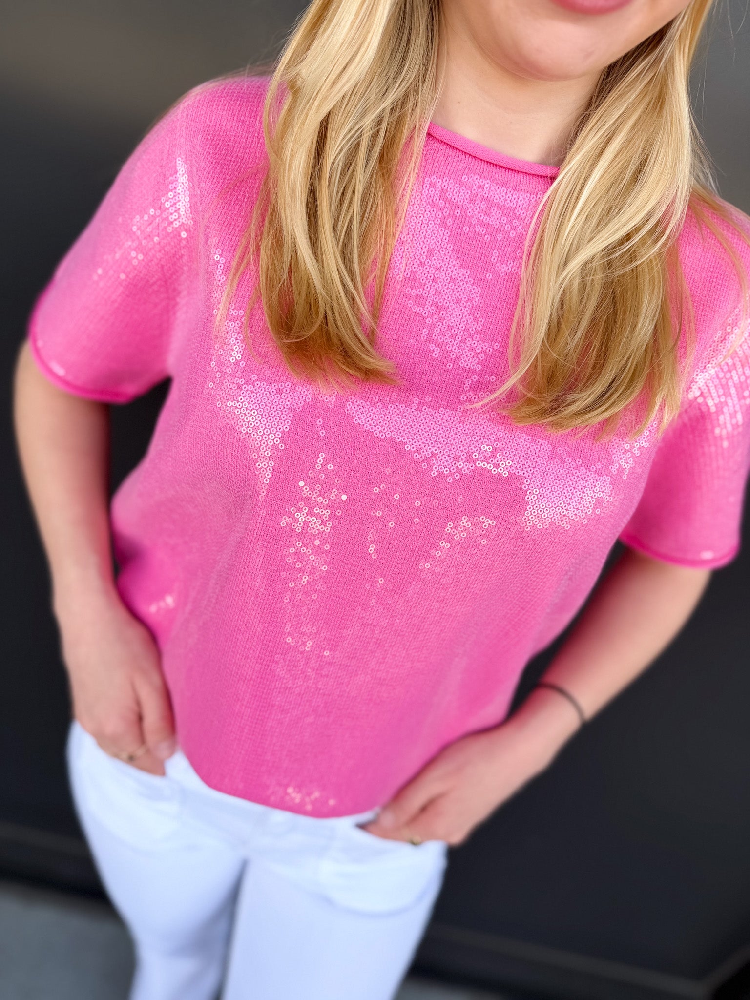 This show-stopping top is covered in shimmering sequins from neckline to hem, designed to catch the light with every movement. The round neckline offers a classic, flattering silhouette that pairs beautifully with statement jewelry or stands perfectly on its own.