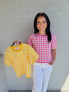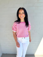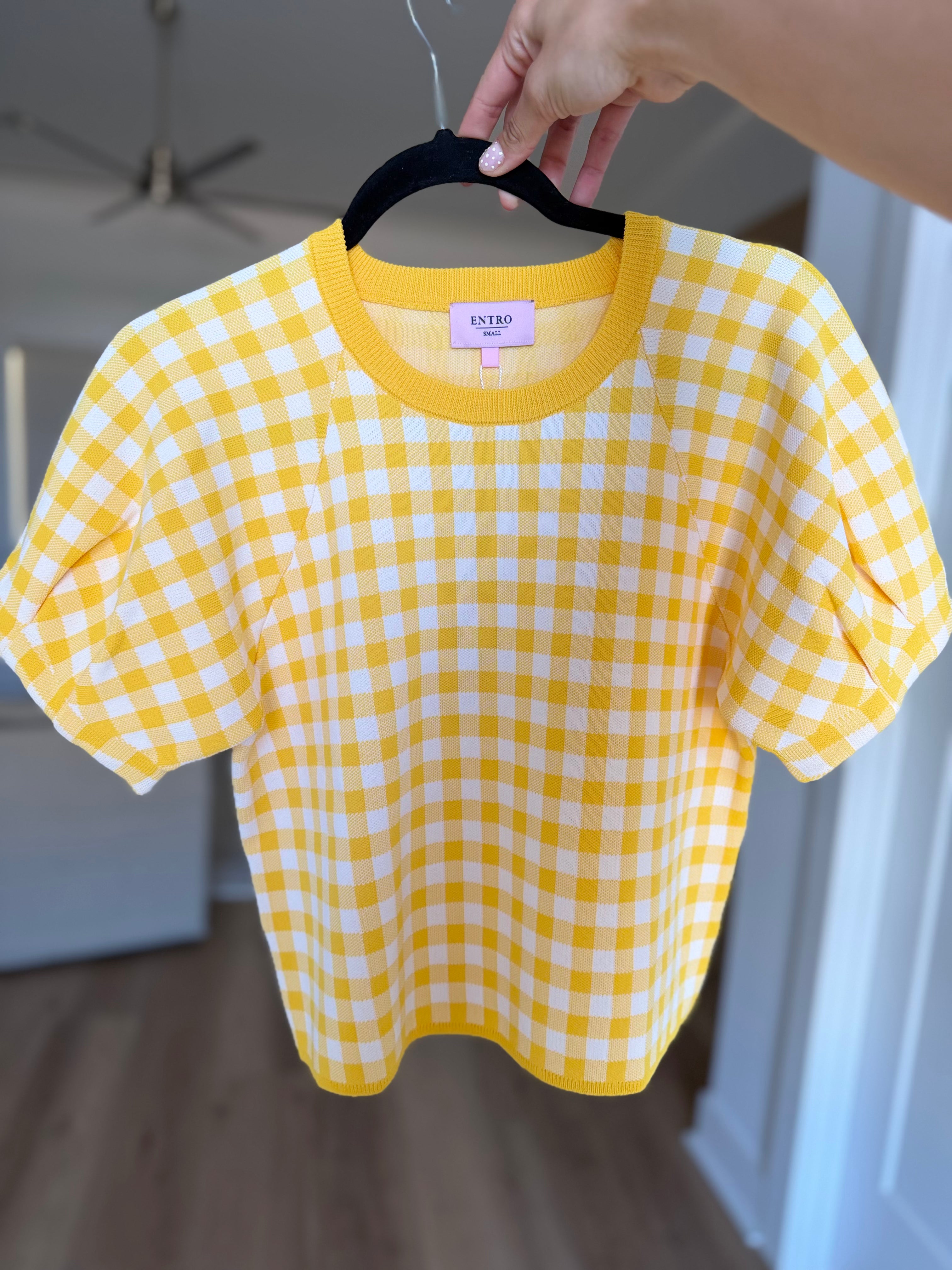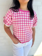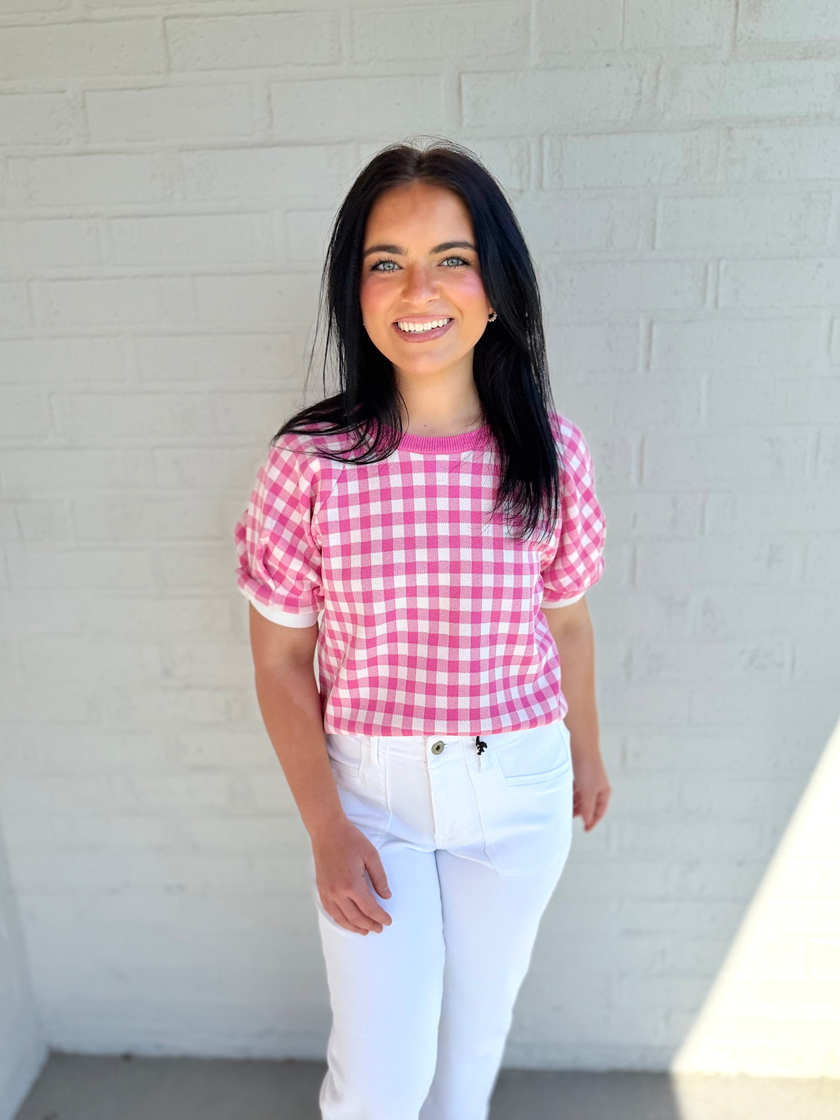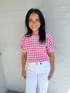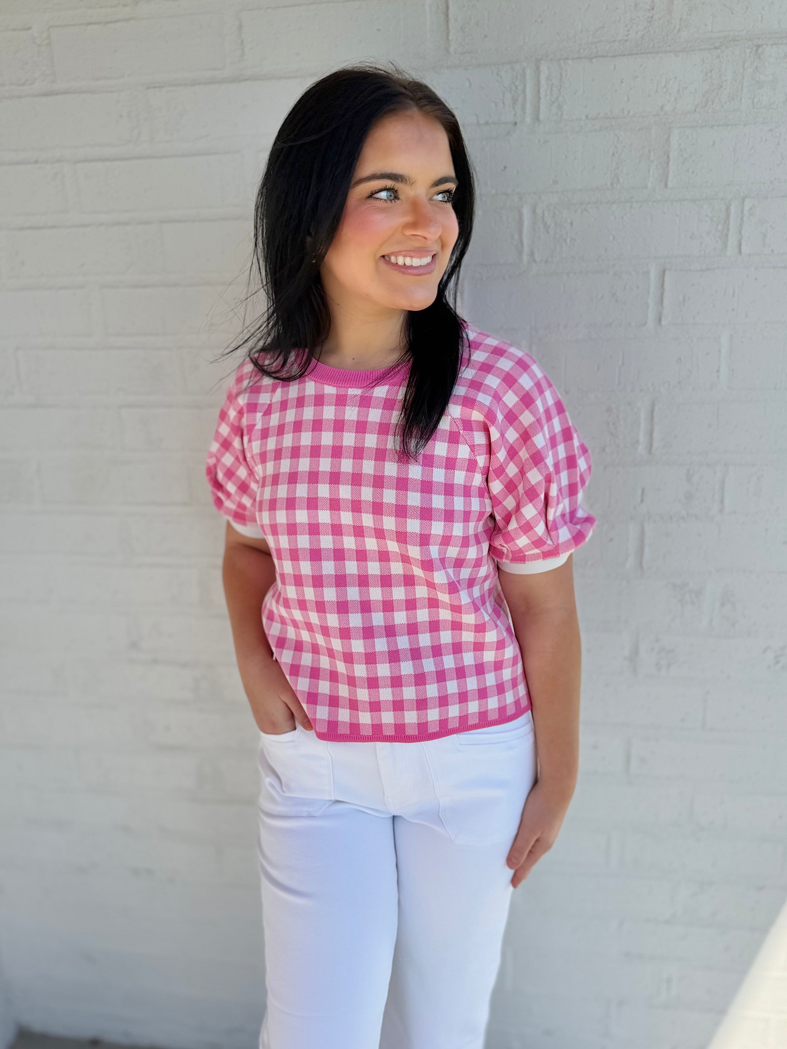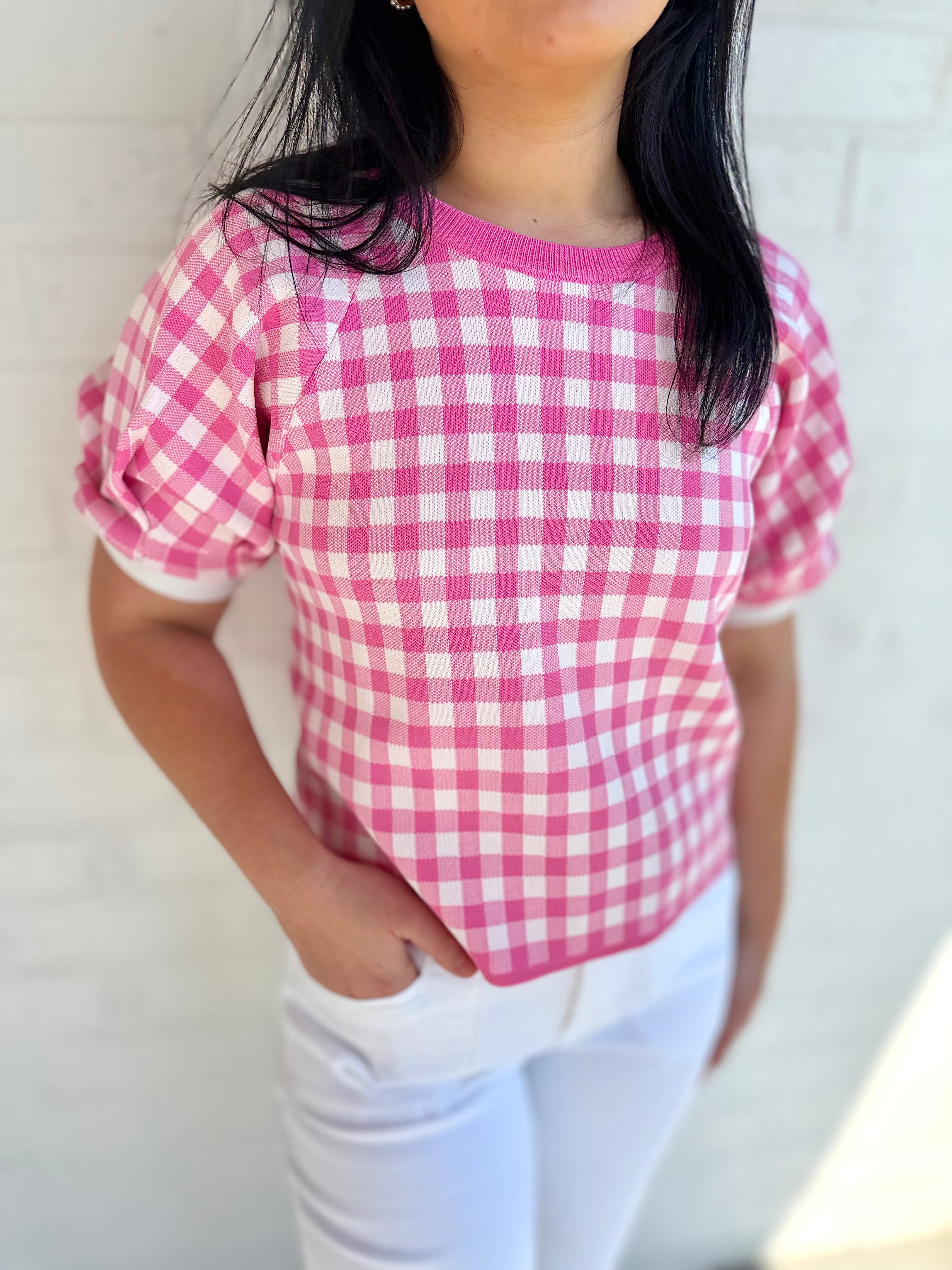 Classic charm with a modern twist đ¤ This gingham sweater knit top features short puff sleeves and a timeless crew neckline for a look that feels both playful and polished. Ribbed detailing at the neckline, cuffs, and hem adds structure and a refined finish.