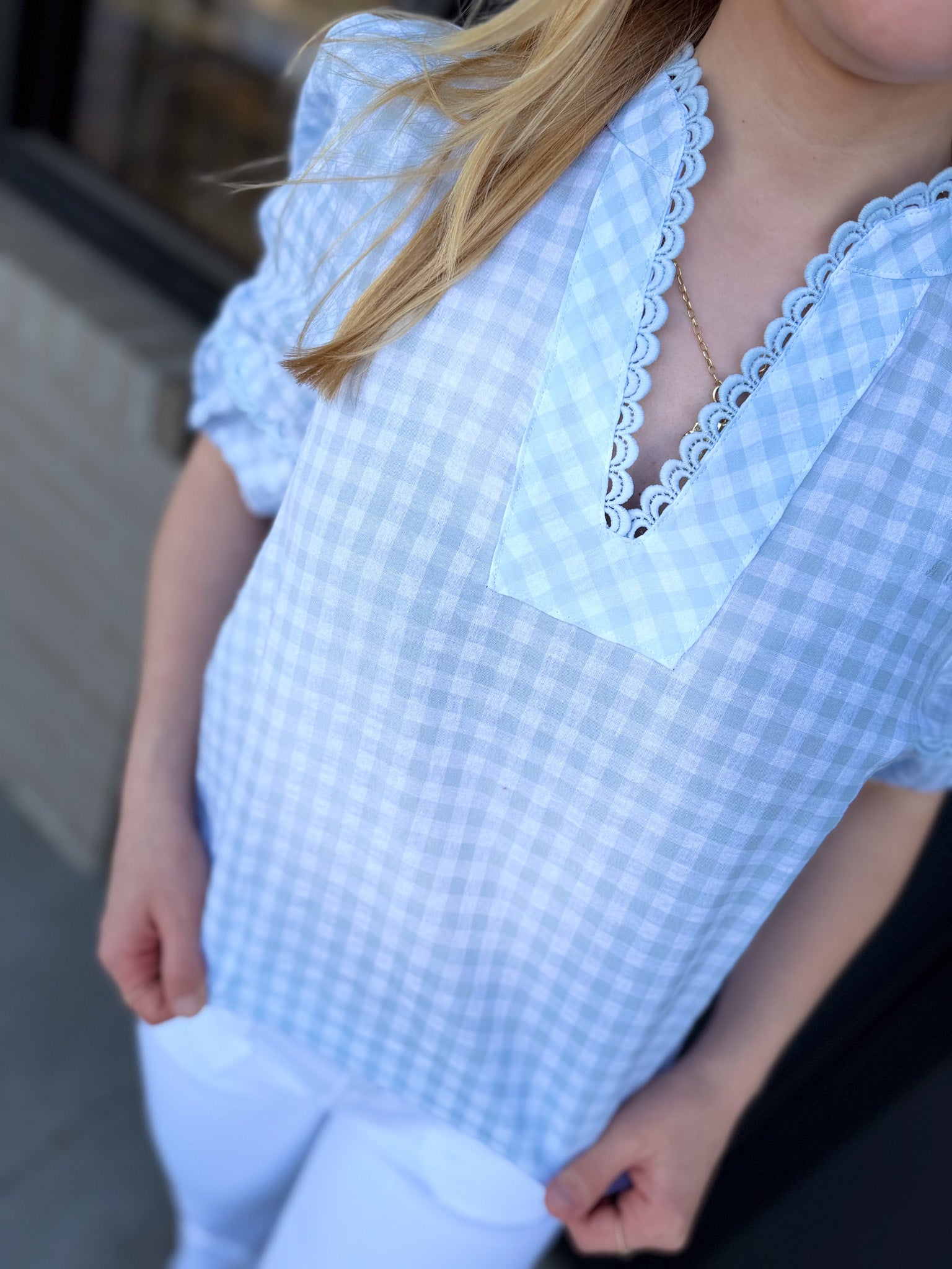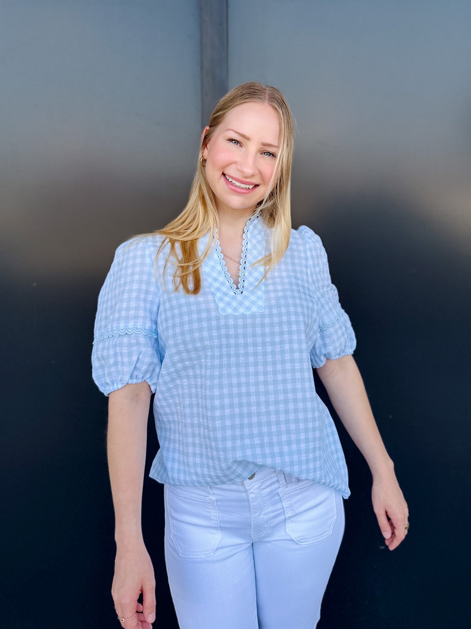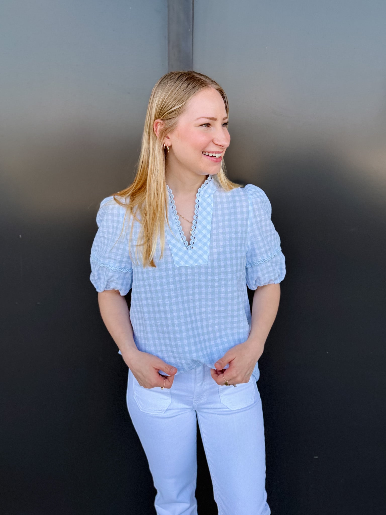 Gingham Puff Sleeve Top with Pico Edge Trim
