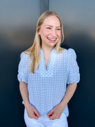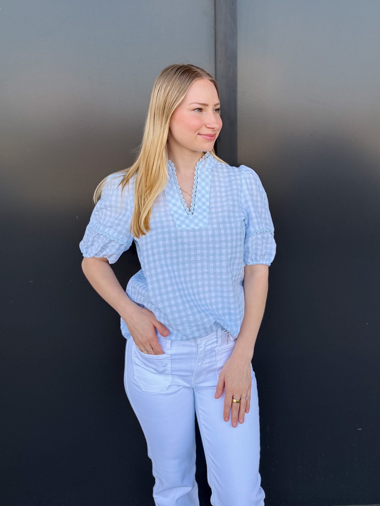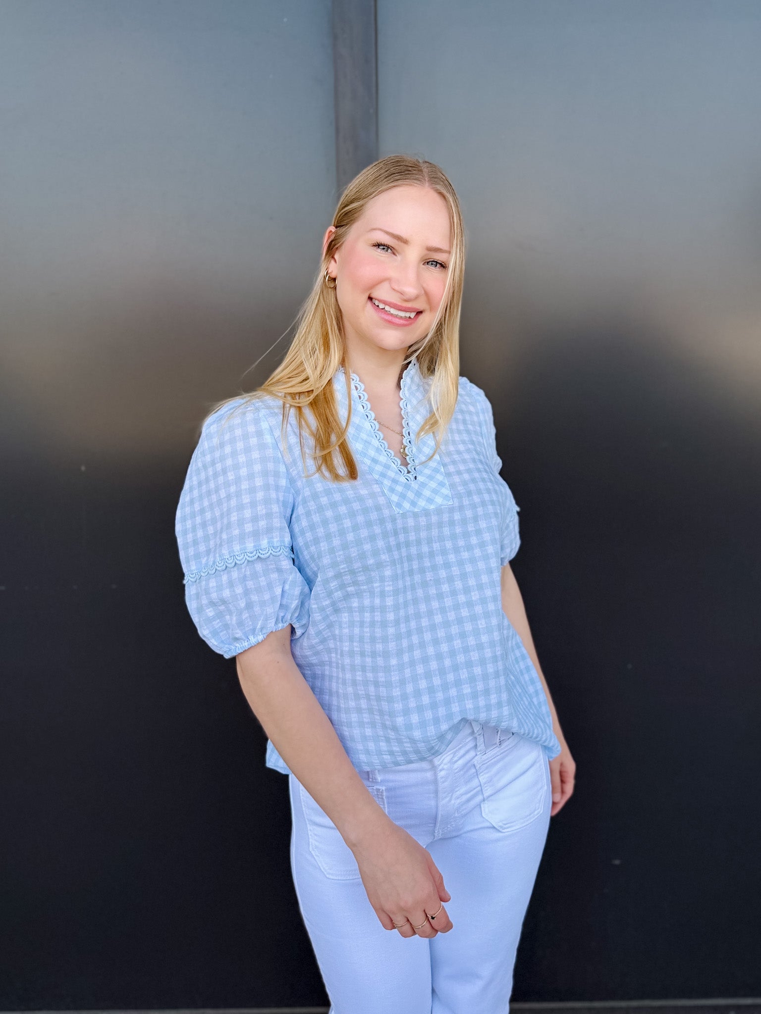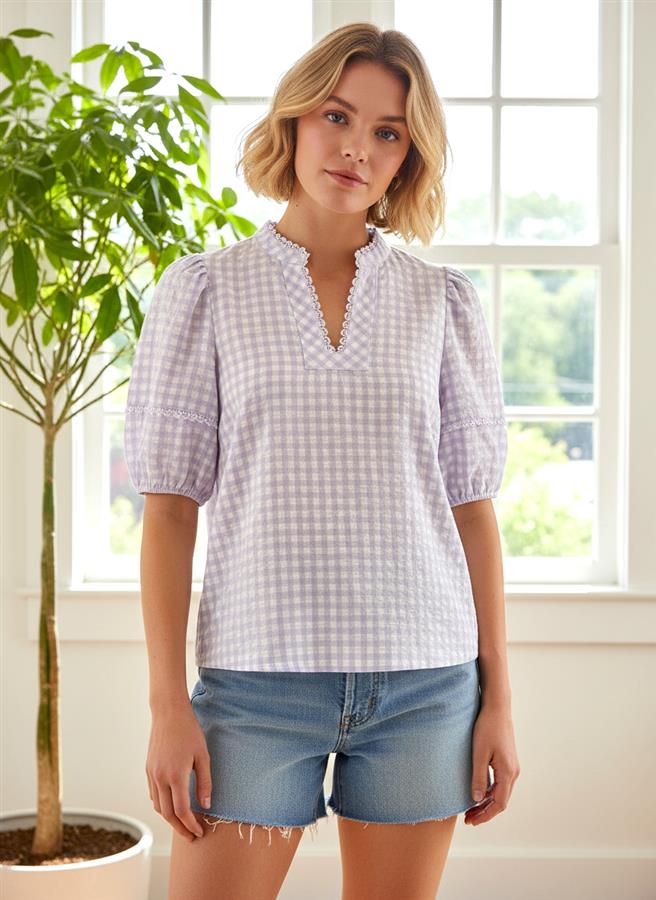 Gingham Puff Sleeve Top with Pico Edge Trim