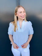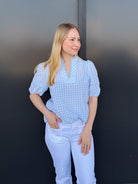 Charming, playful, and effortlessly chic 🤍 This gingham top features puff short sleeves, a flattering Y-split neckline, and delicate pico edge trim for a polished, feminine finish. Crafted from a soft cotton-poly blend, it offers lightweight comfort and a relaxed silhouette—perfect for everyday wear or layering for a polished casual look.