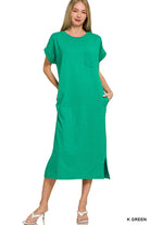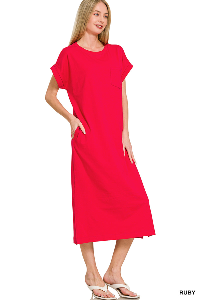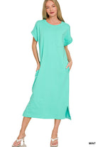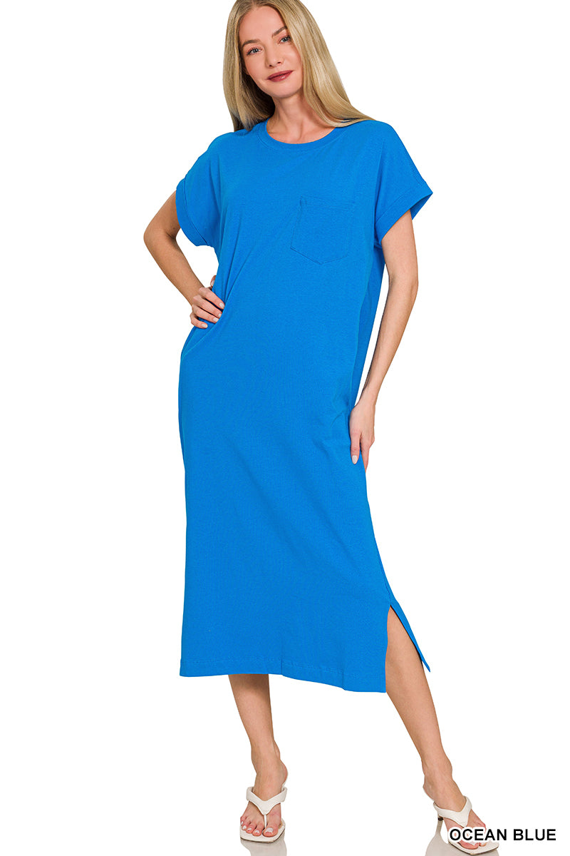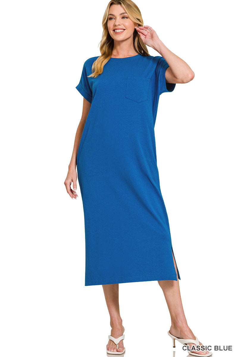 Simple, flattering, and made for everyday ease đ¤ This round neck midi dress is the definition of effortless style. Designed with a relaxed silhouette, it features short sleeves, functional side pockets, and a subtle side slit for added movement and a modern touch.