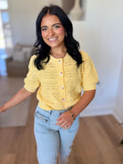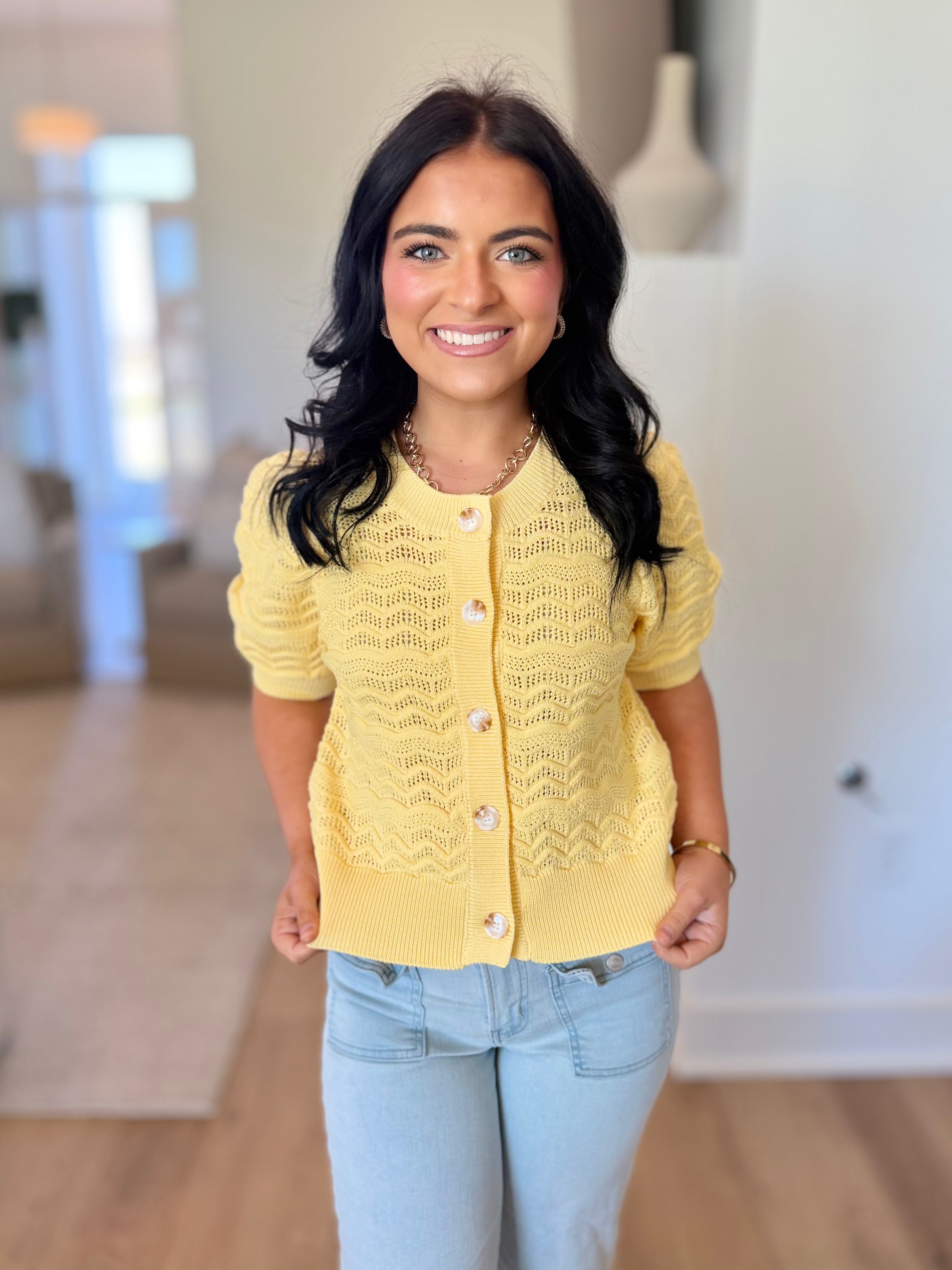 Classic, versatile, and effortlessly chic đ¤ This knitted short sleeve cardigan features a button-up front with a clean banded finish along the neckline, hem, and sleeves for a polished look. Crafted from a soft knit blend, itâs perfect worn alone as a top or layered for easy, everyday styling.