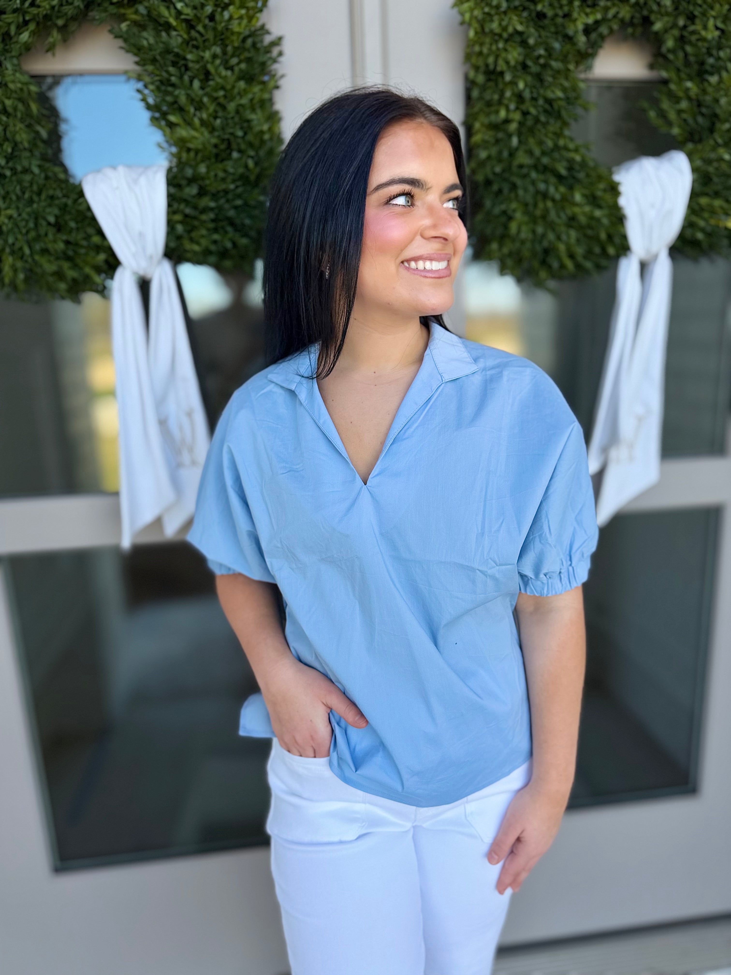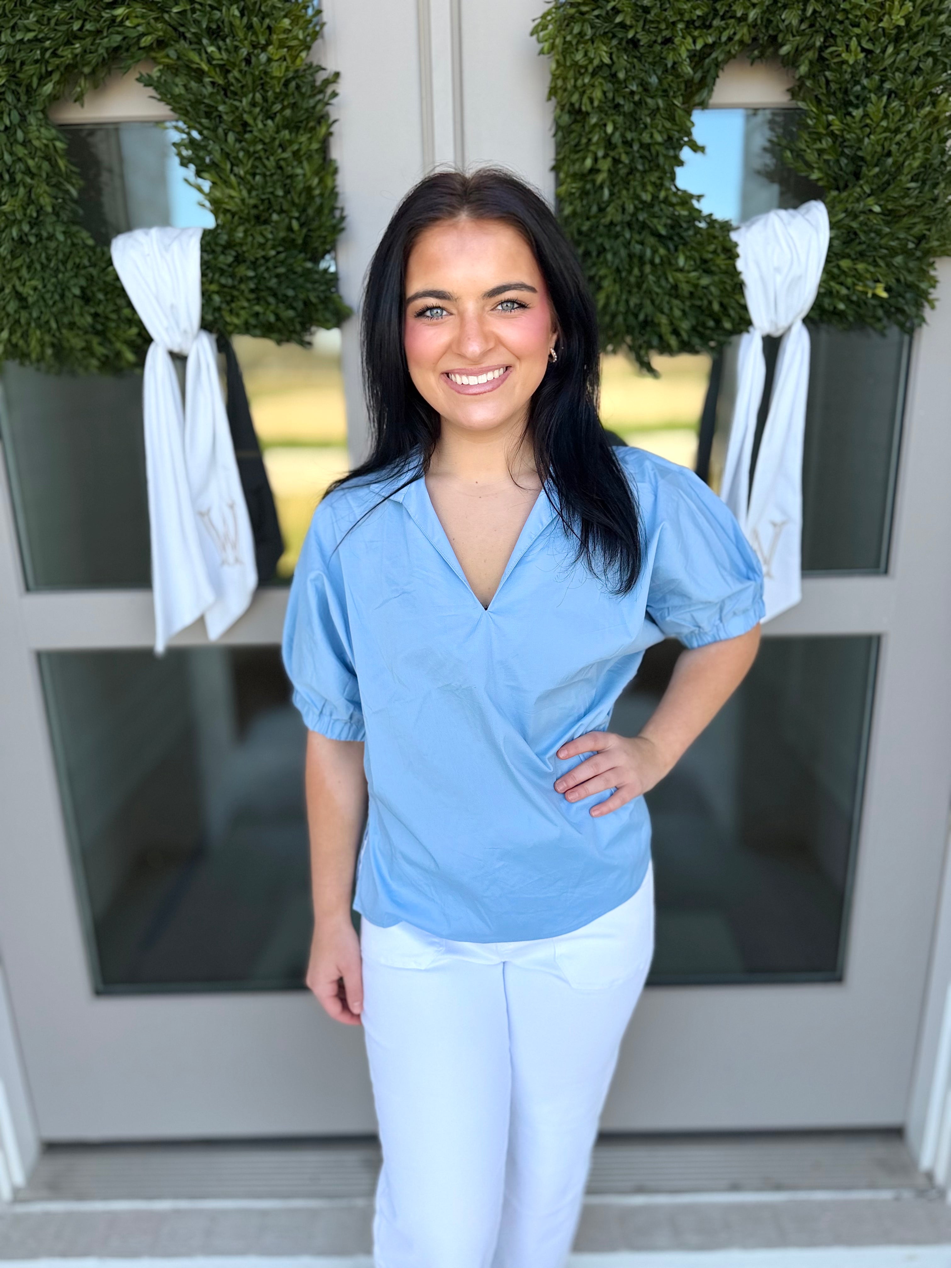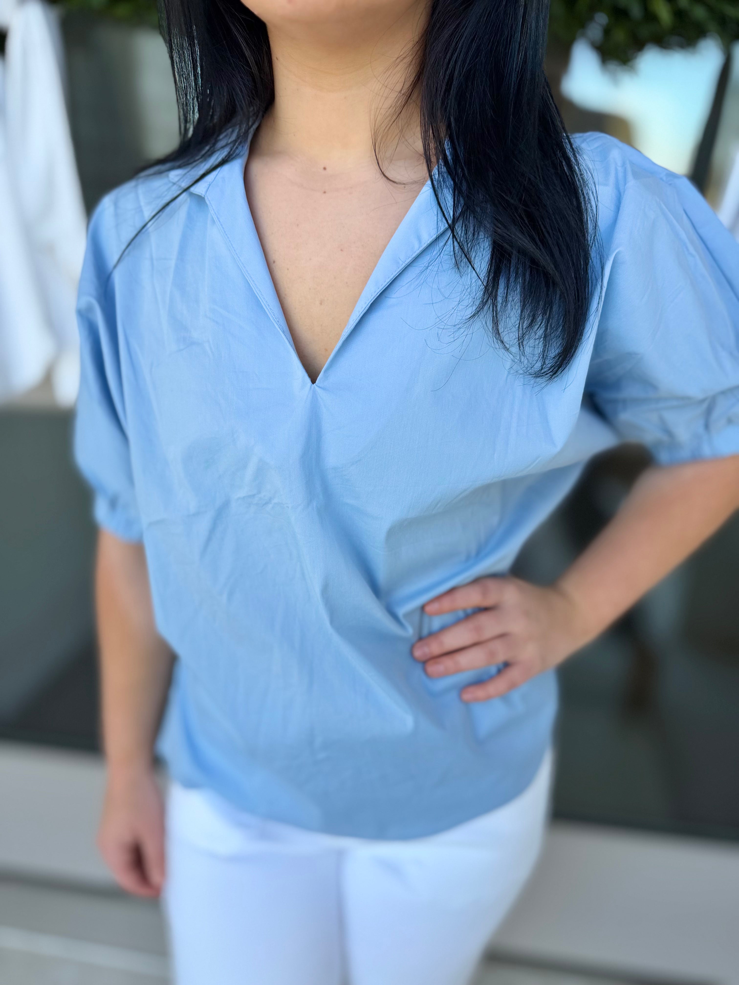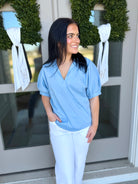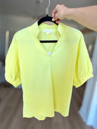 Elevate your wardrobe with The Marlow Puff Sleeve Top, a sophisticated short sleeve blouse featuring puffed sleevesand a V-neck with a standing collar for subtle statement style. Crafted from a soft and slightly stretchy woven blend, this lightweight top offers comfort without sacrificing structure.