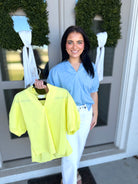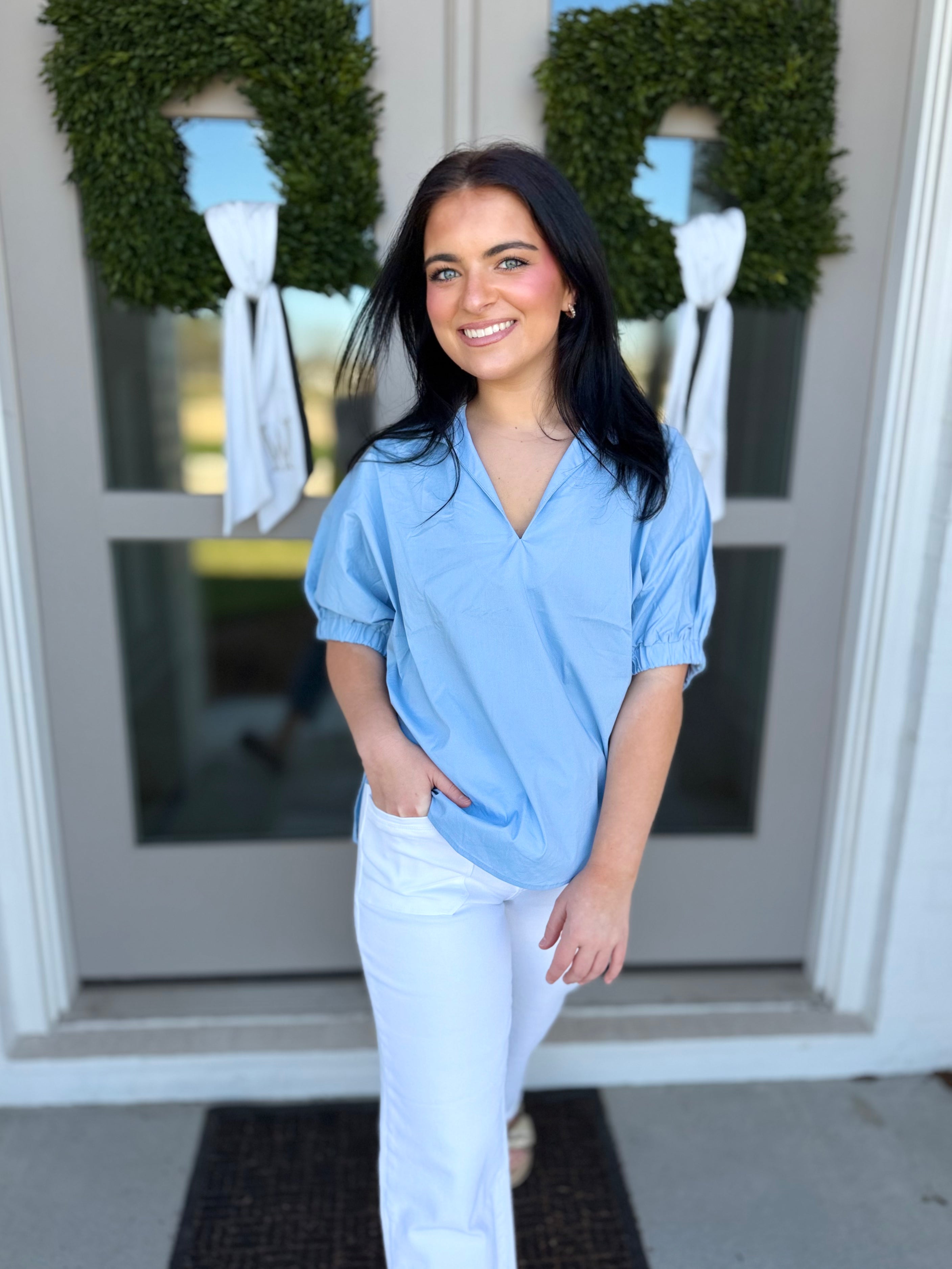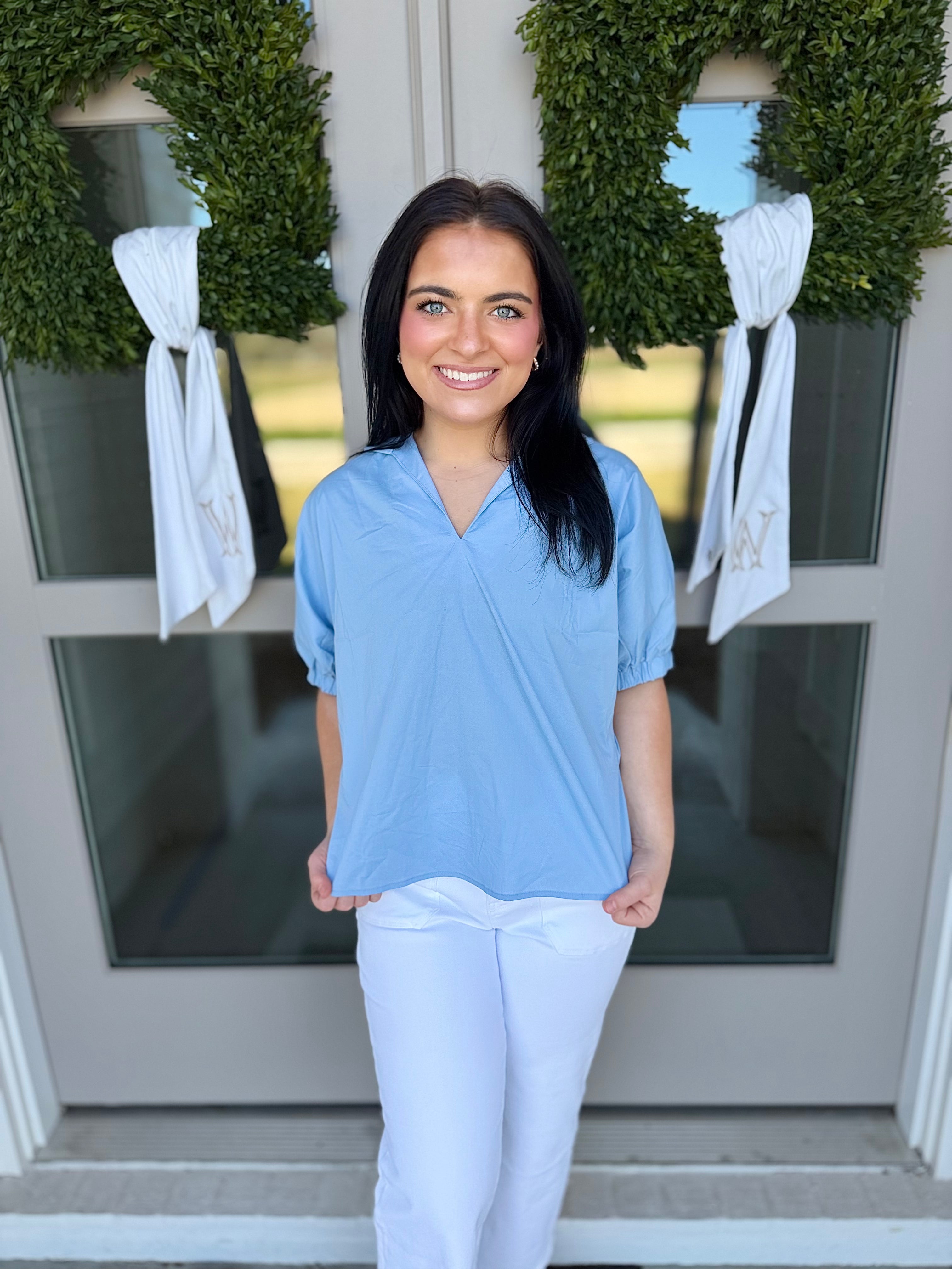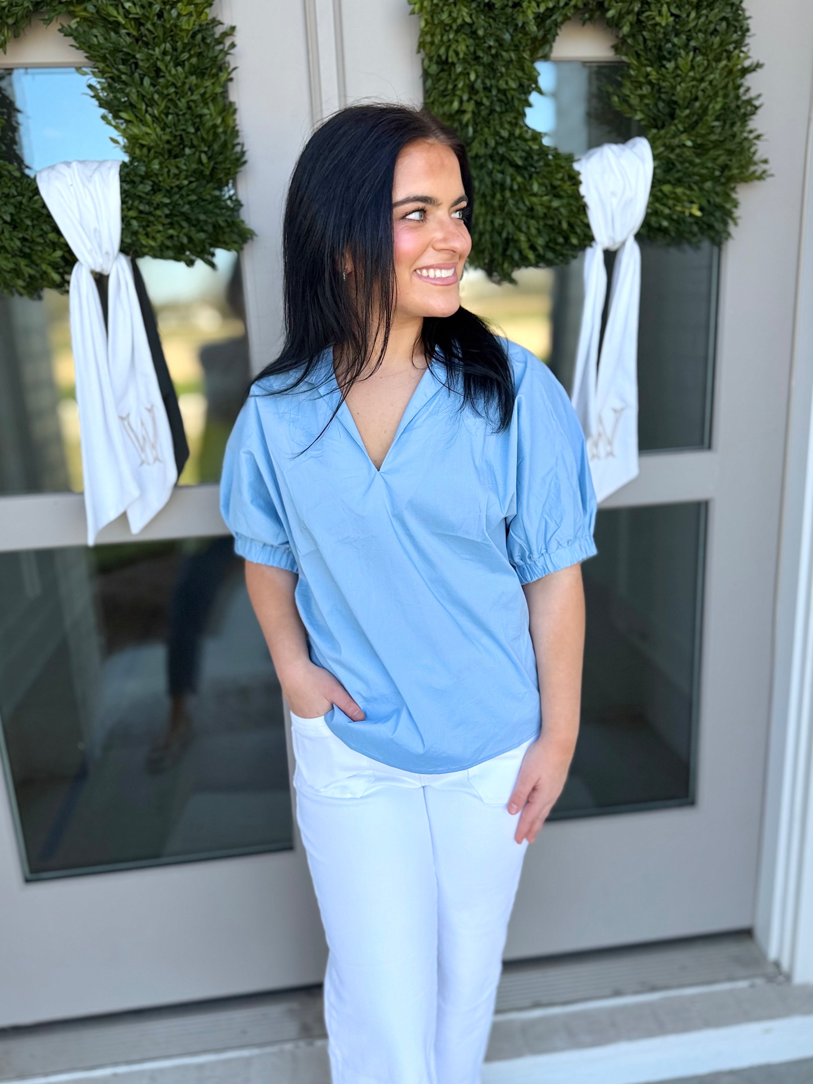 Elevate your wardrobe with The Marlow Puff Sleeve Top, a sophisticated short sleeve blouse featuring puffed sleevesand a V-neck with a standing collar for subtle statement style. Crafted from a soft and slightly stretchy woven blend, this lightweight top offers comfort without sacrificing structure.