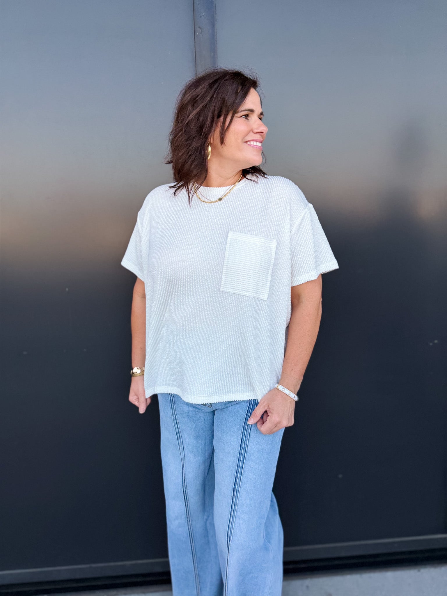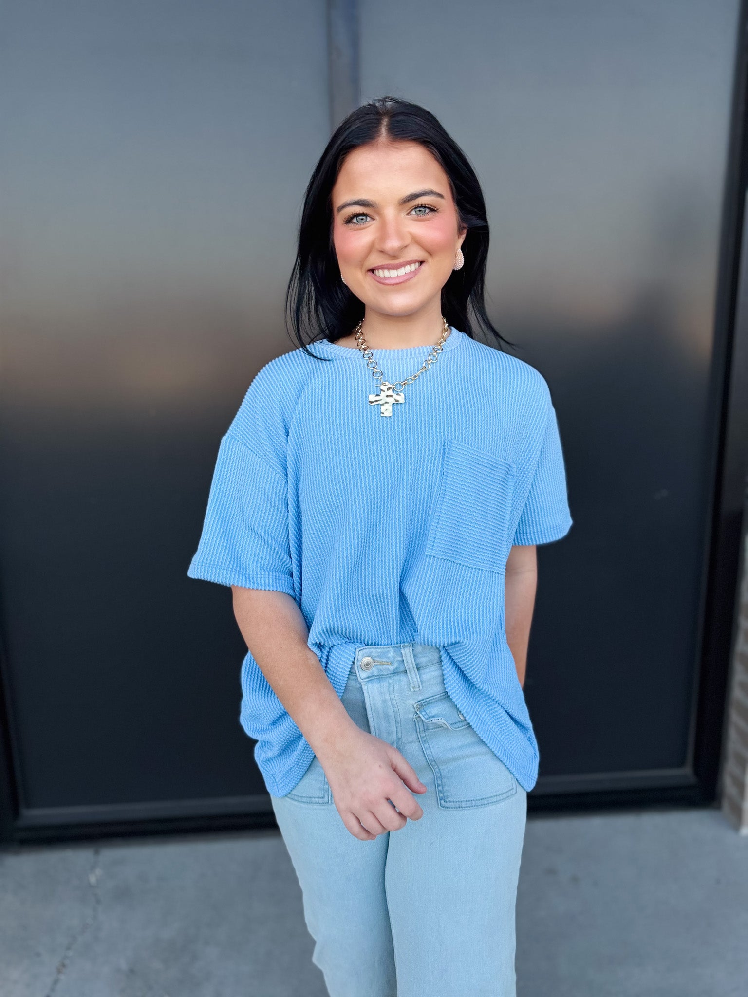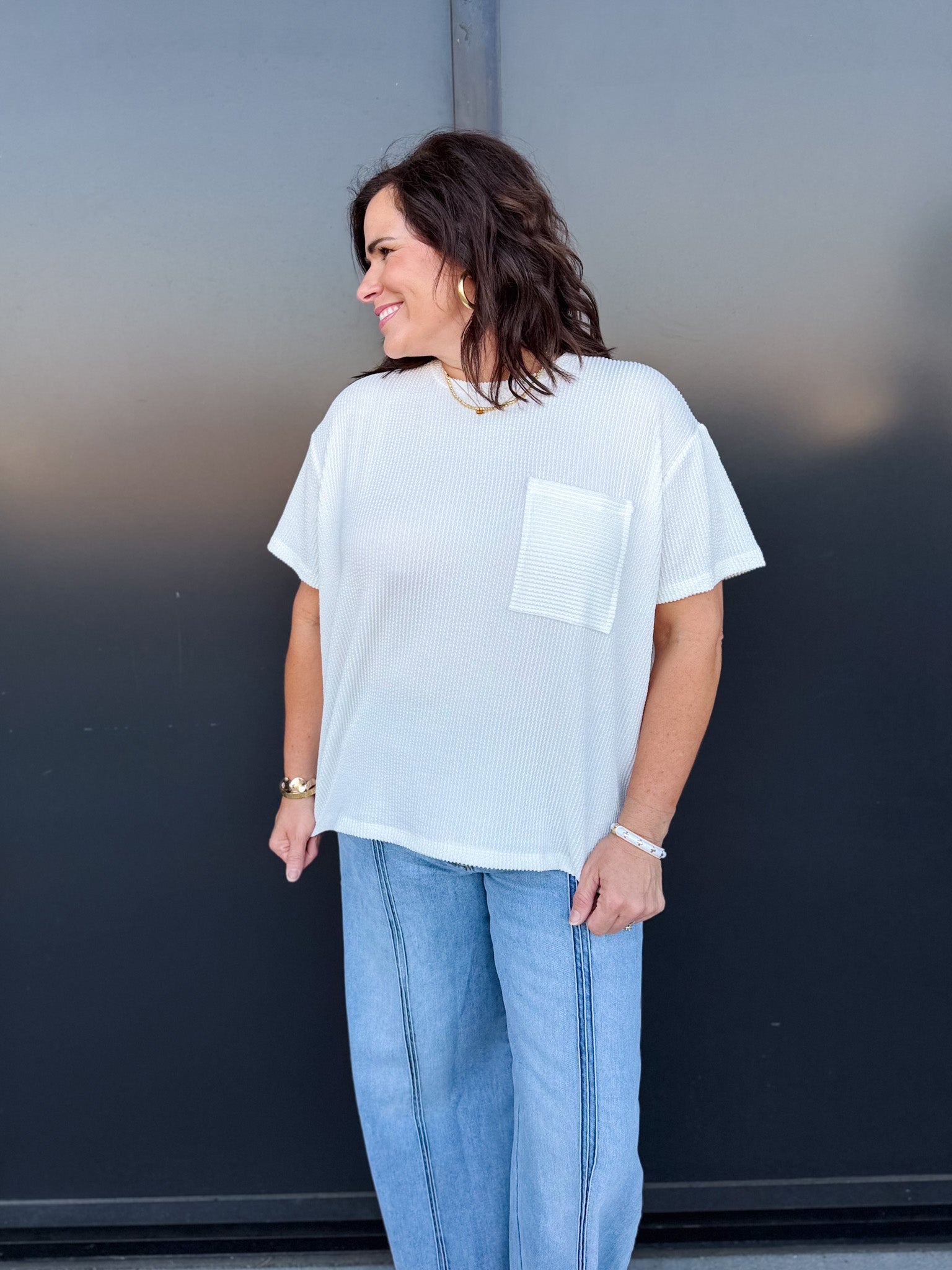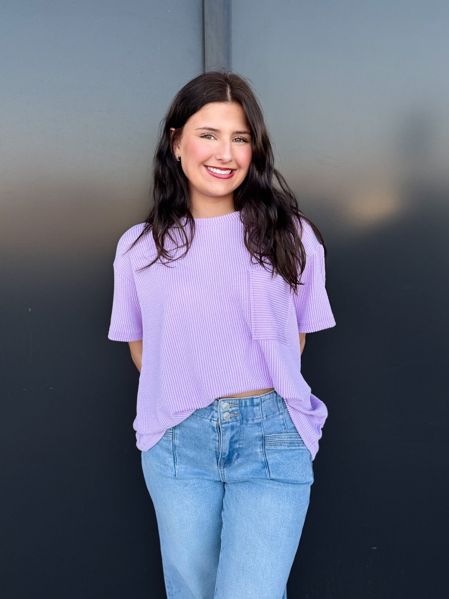 Effortless style meets relaxed comfort in the Zoe Top. Crafted from a wavy corded rib knit, this short-sleeve essential features a front pocket detail and a laid-back silhouette that drapes beautifully on every body.