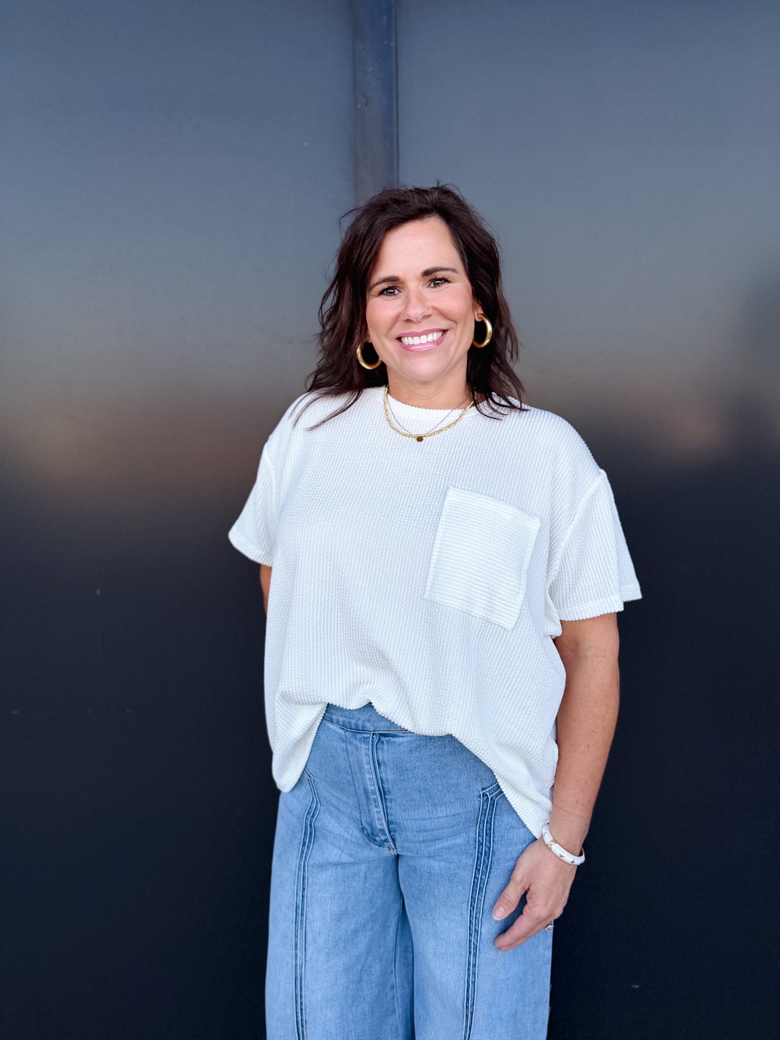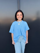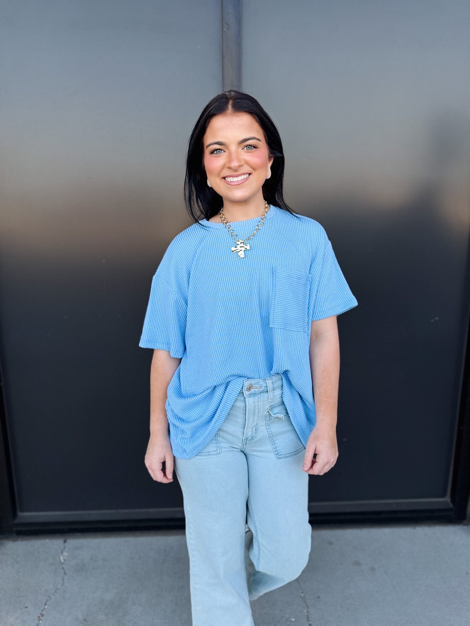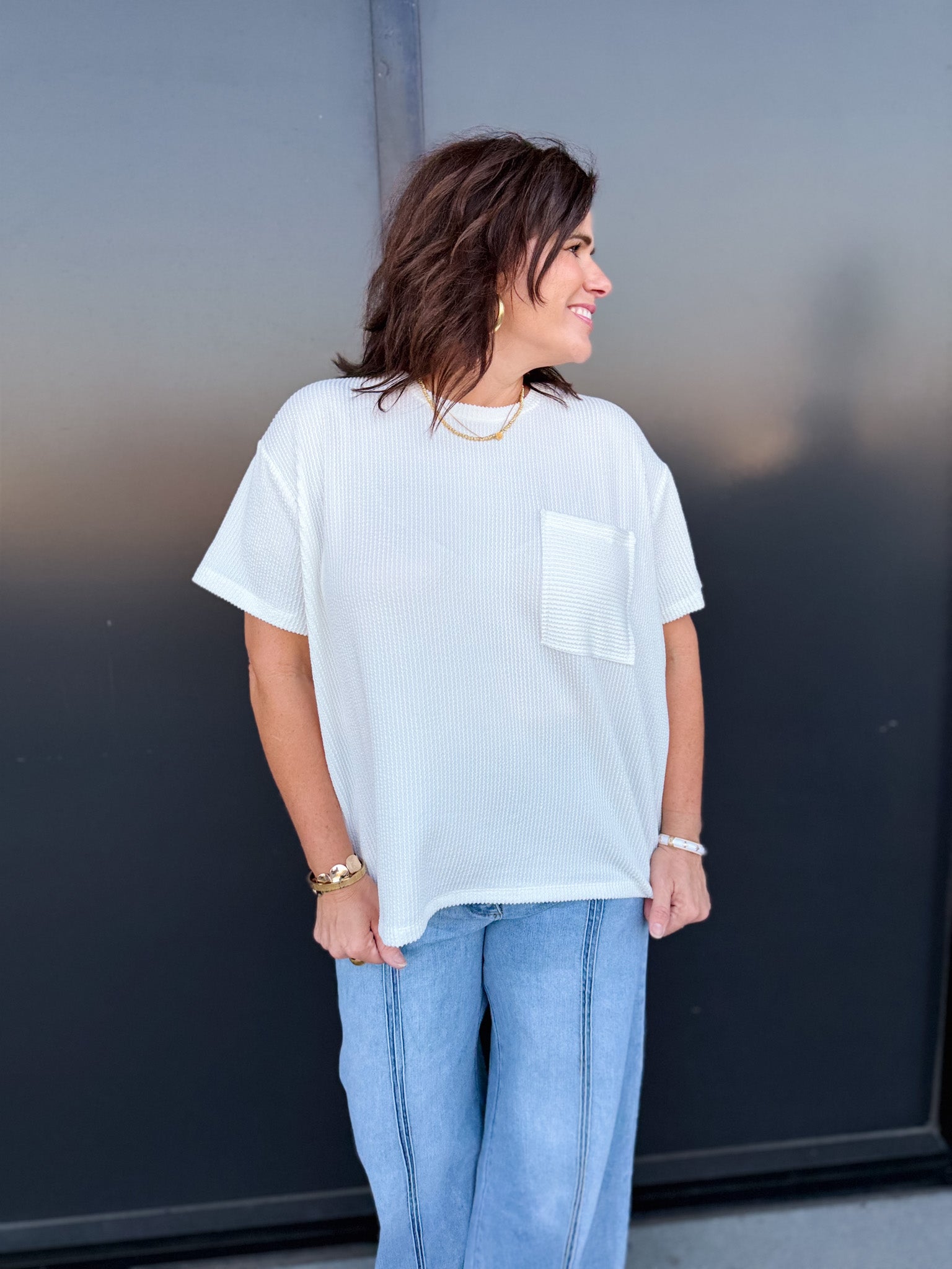 Effortless style meets relaxed comfort in the Zoe Top. Crafted from a wavy corded rib knit, this short-sleeve essential features a front pocket detail and a laid-back silhouette that drapes beautifully on every body.