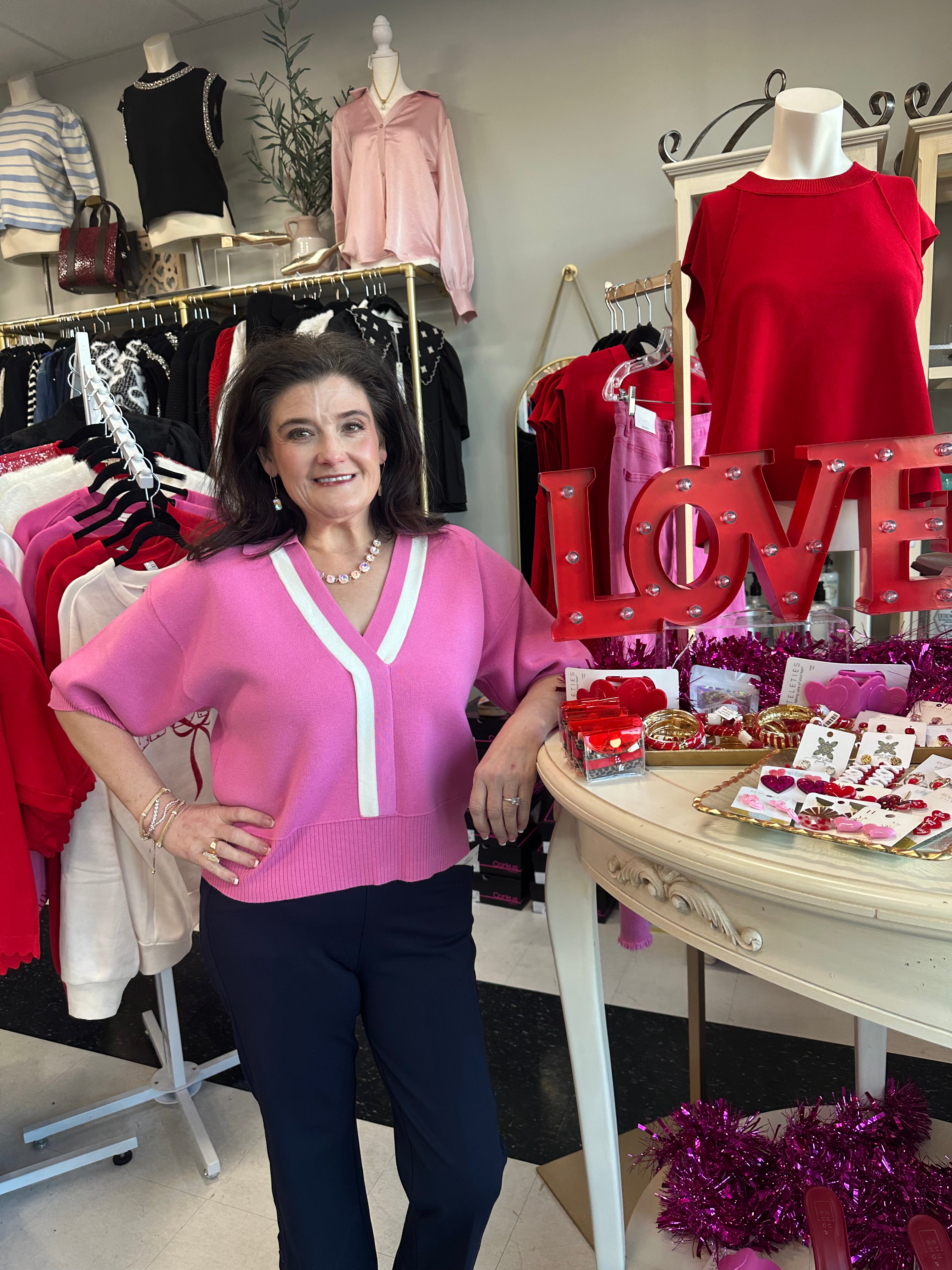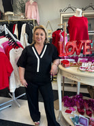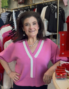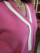 Collared top with v-neck featuring white trim banding along the bottom and sleeves. Waist-length silhouette.