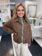 Add a playful twist to your fall style with the Entro Abigail Jacket. This brown denim jacket features a drawstring waist that lets you customize your fit while adding a fun, casual vibe. It's the perfect layer to keep you cozy and stylish as the leaves change.
