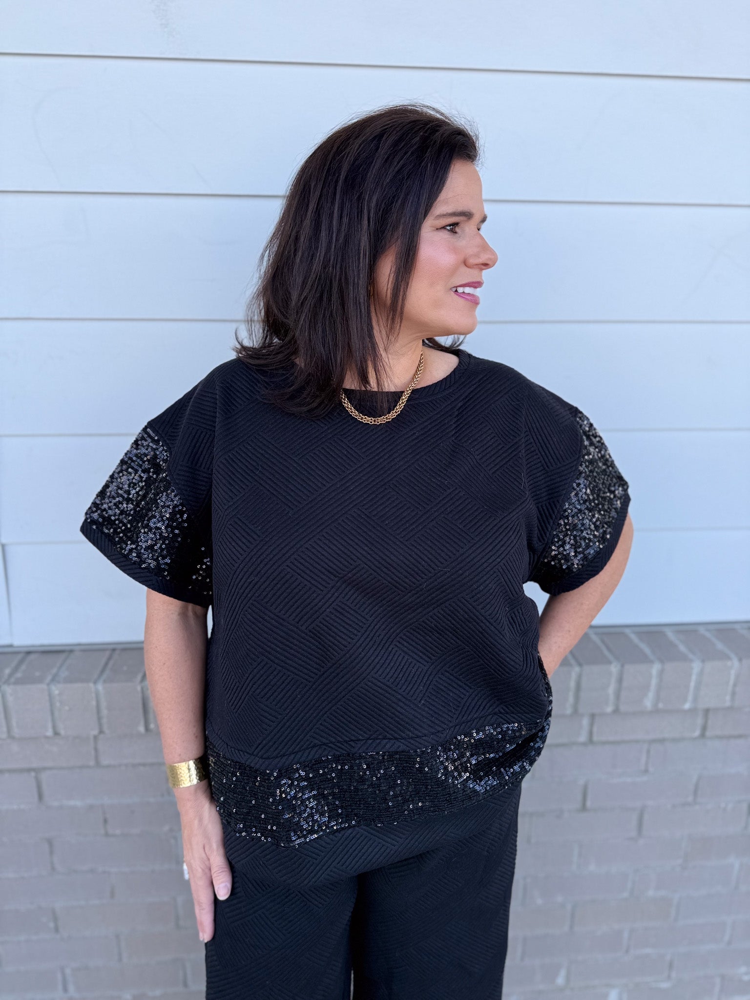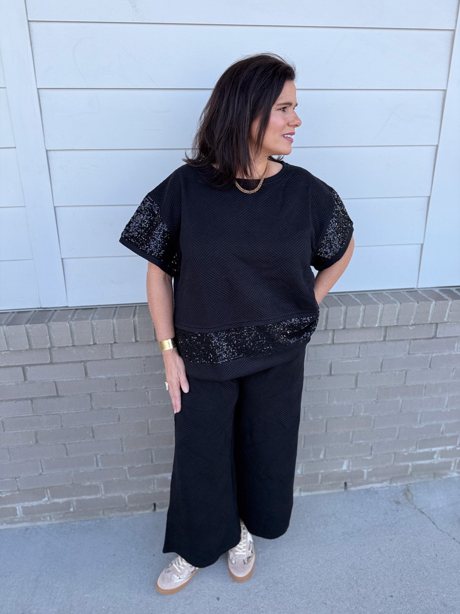 This stunning plus size set pairs comfort with glam. The textured short sleeve top features sparkling sequin detailing, perfectly complemented by matching cropped pants with coordinating accents. Designed to flatter and shine, this all-black set is ideal for any festive occasion.