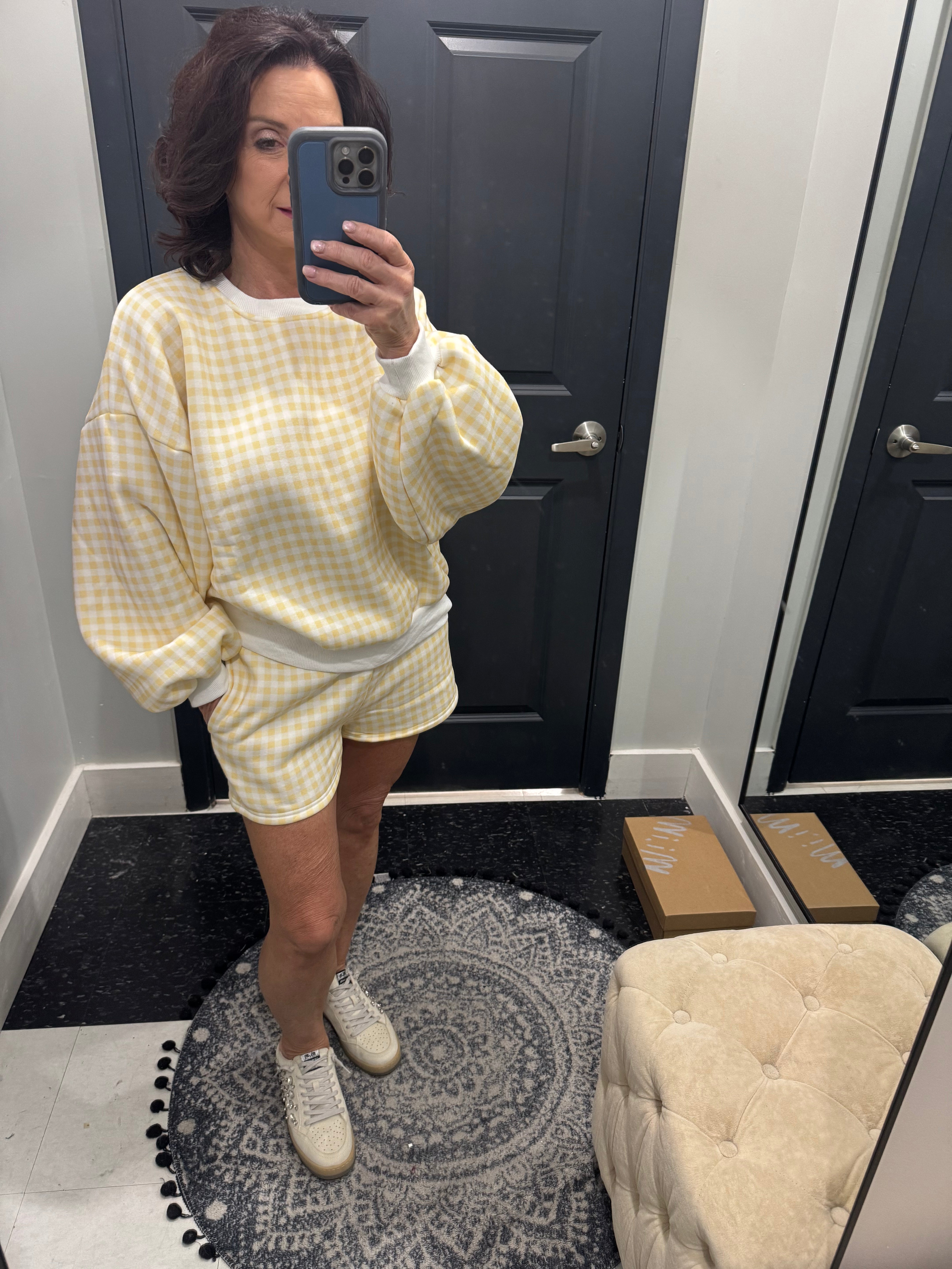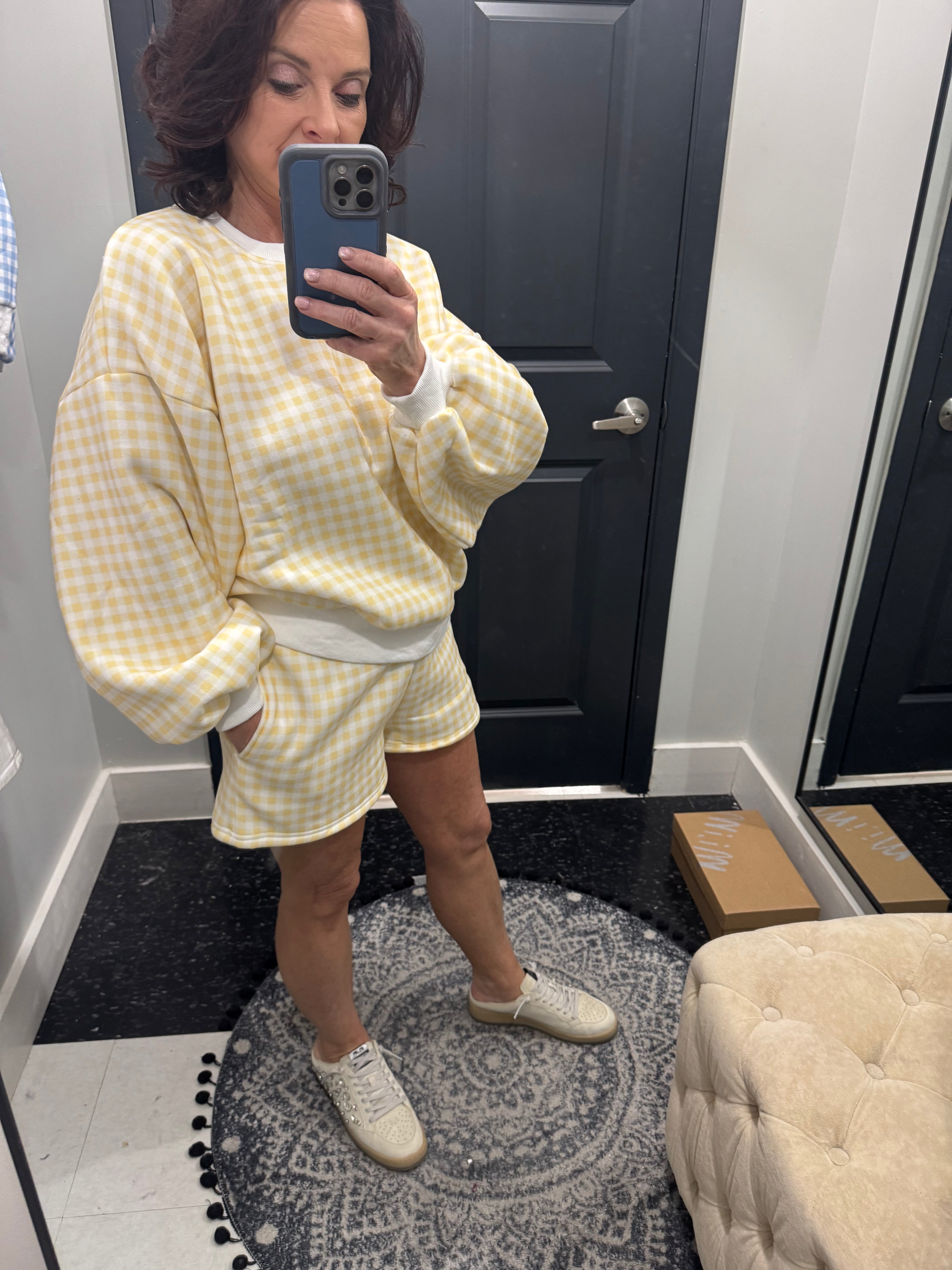 Effortlessly chic and endlessly comfortable, this gingham print sweatshirt and shorts set brings a fresh, modern take on classic pattern play. Crafted from premium cotton-blend fleece, it's designed for those who value both style and ease—whether you're lounging at home or stepping out for a casual weekend outing.