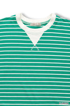 Crafted from a soft cotton-spandex blend for comfort and flexibility. Features a distinctive Dorito neck stitch detail that adds modern style to this classic striped design.