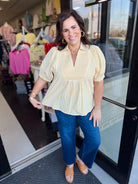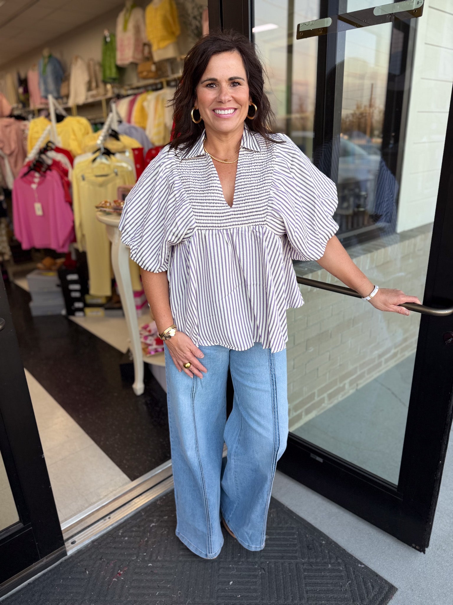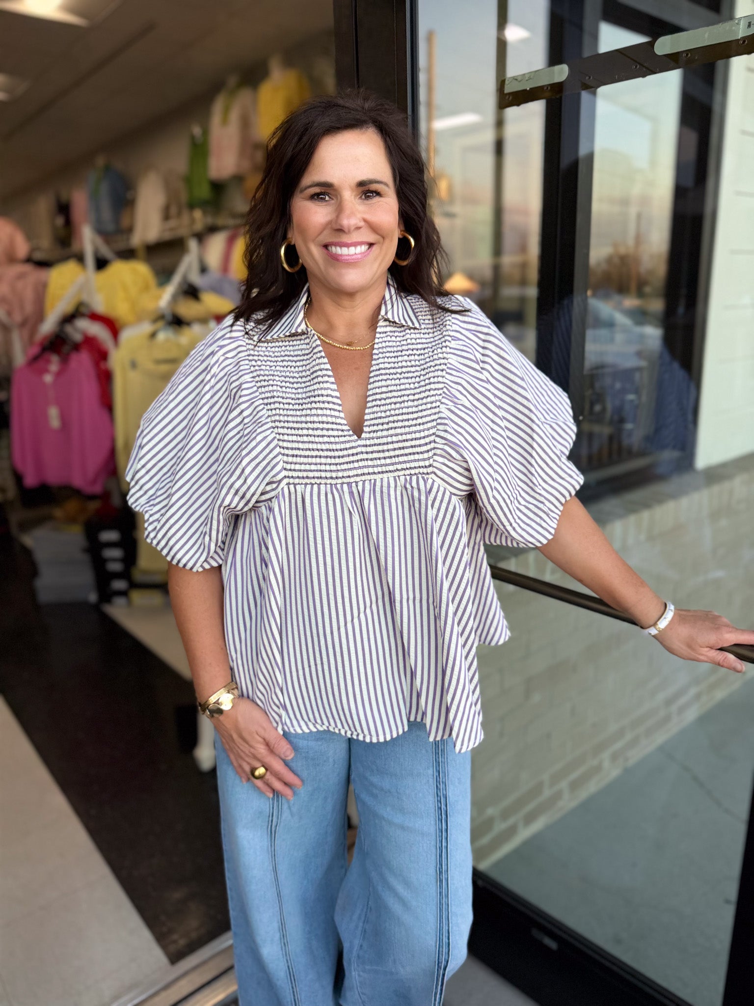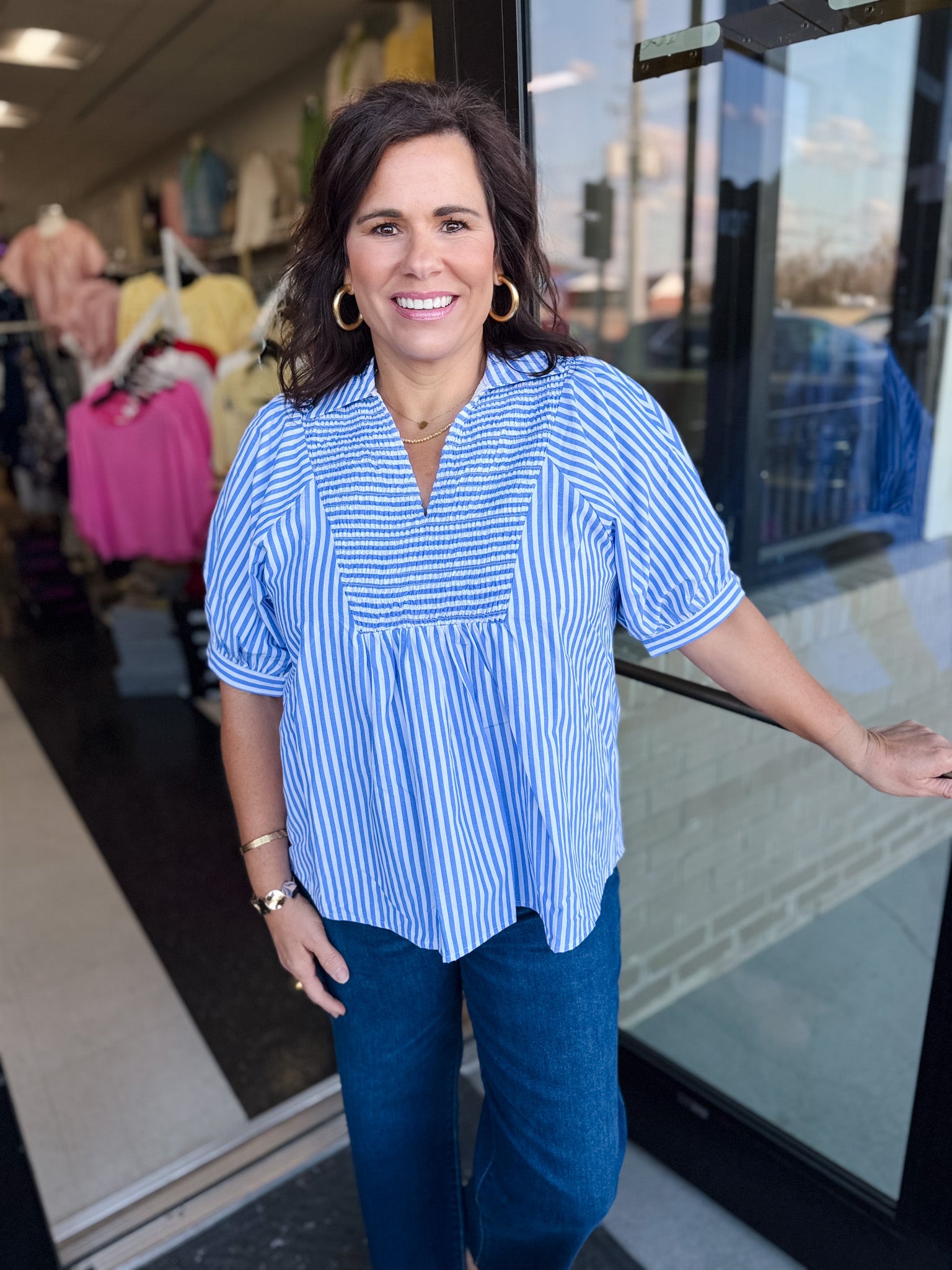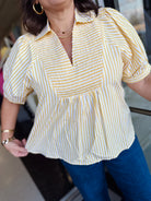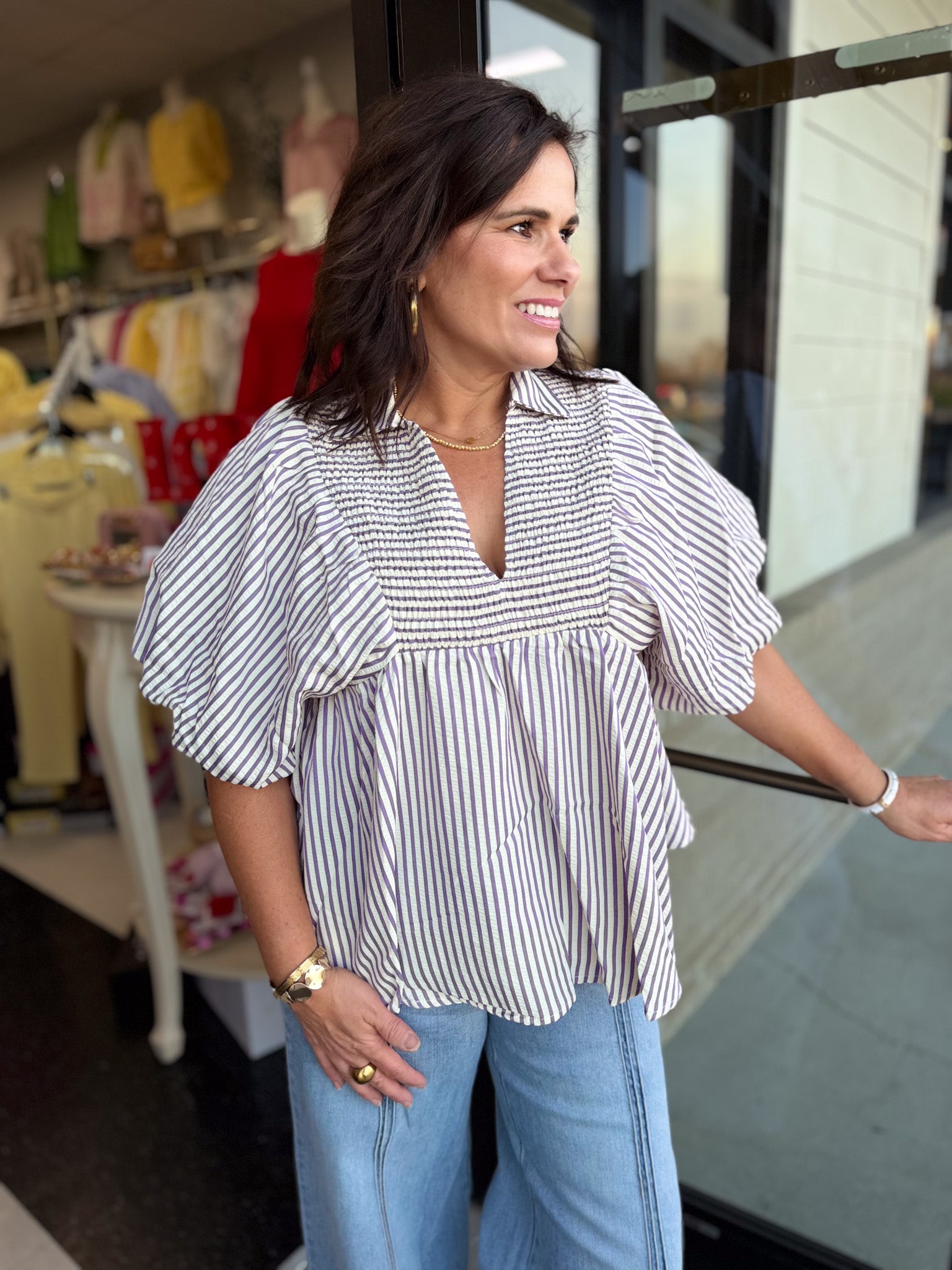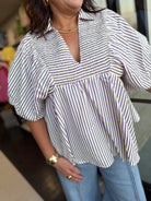 Elevate your everyday wardrobe with this sophisticated sage green and white striped top. Featuring a classic V-neck, polished collar, and flattering ruching at the chest, this piece effortlessly combines timeless style with modern elegance.