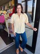 The V-neckline elongates your silhouette while the structured collar adds a touch of refinement. Delicate ruching at the chest creates beautiful dimension and a universally flattering fit that celebrates your natural shape.