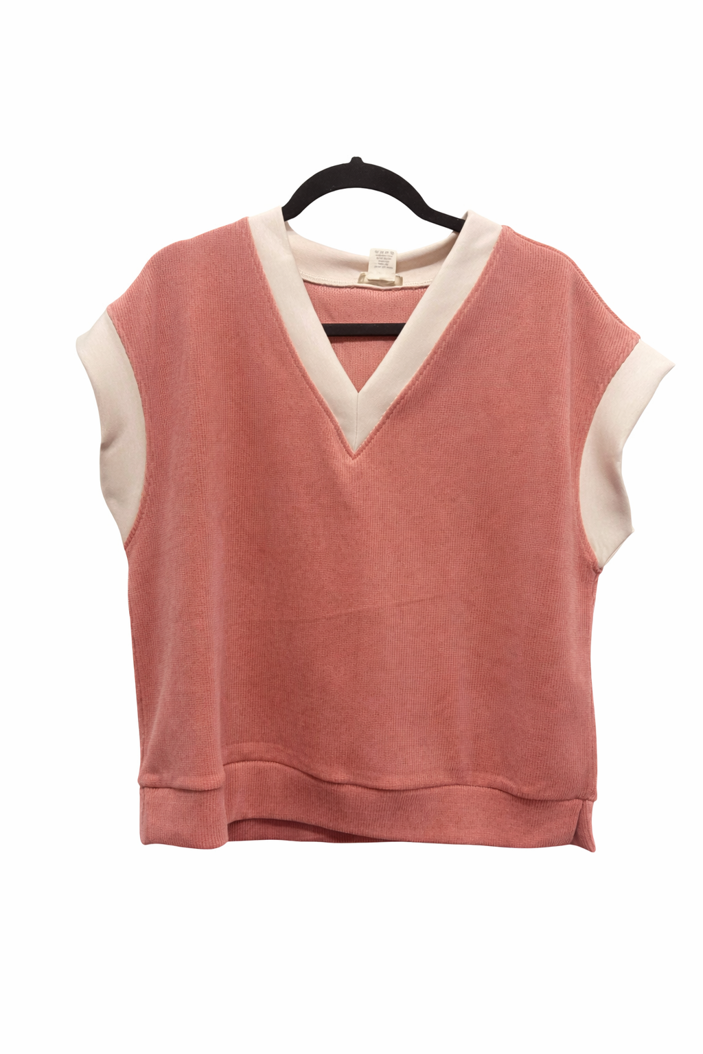 Elevate your layering game with this chic two-tone vest top featuring ribbed fabric and contrasting ivory trim details. The v-neck and sleeve edges are finished with elegant ivory trim, while a band at the bottom creates a polished silhouette.