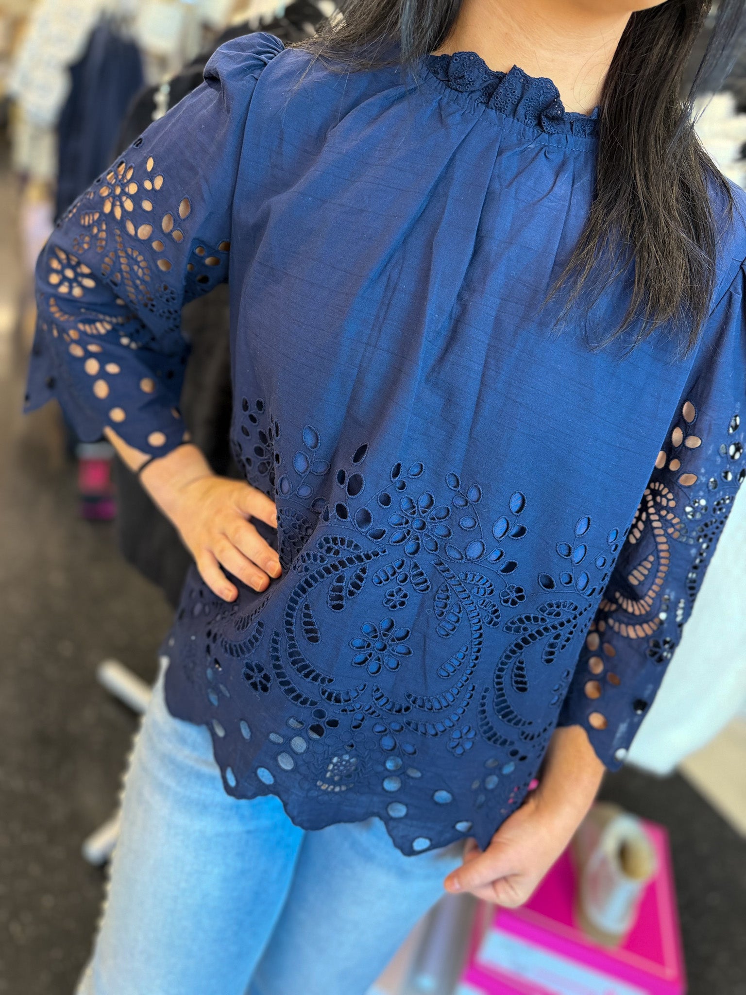 Design: Floral eyelet embroidery, ruffled neckline, scalloped edges, 3/4 sleeves, back keyhole button closure