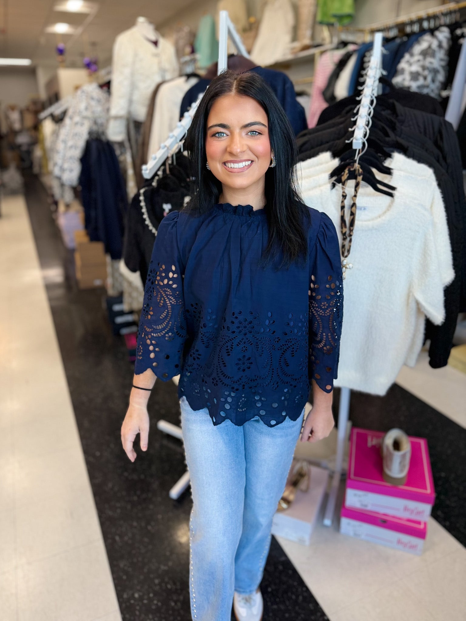 Add a touch of delicate elegance with the Lila Floral Eyelet Top, featuring intricate floral eyelet embroidery across the bodice and sleeves. The ruffled neckline and scalloped edges create a soft, romantic aesthetic, perfect for everyday wear or special occasions.