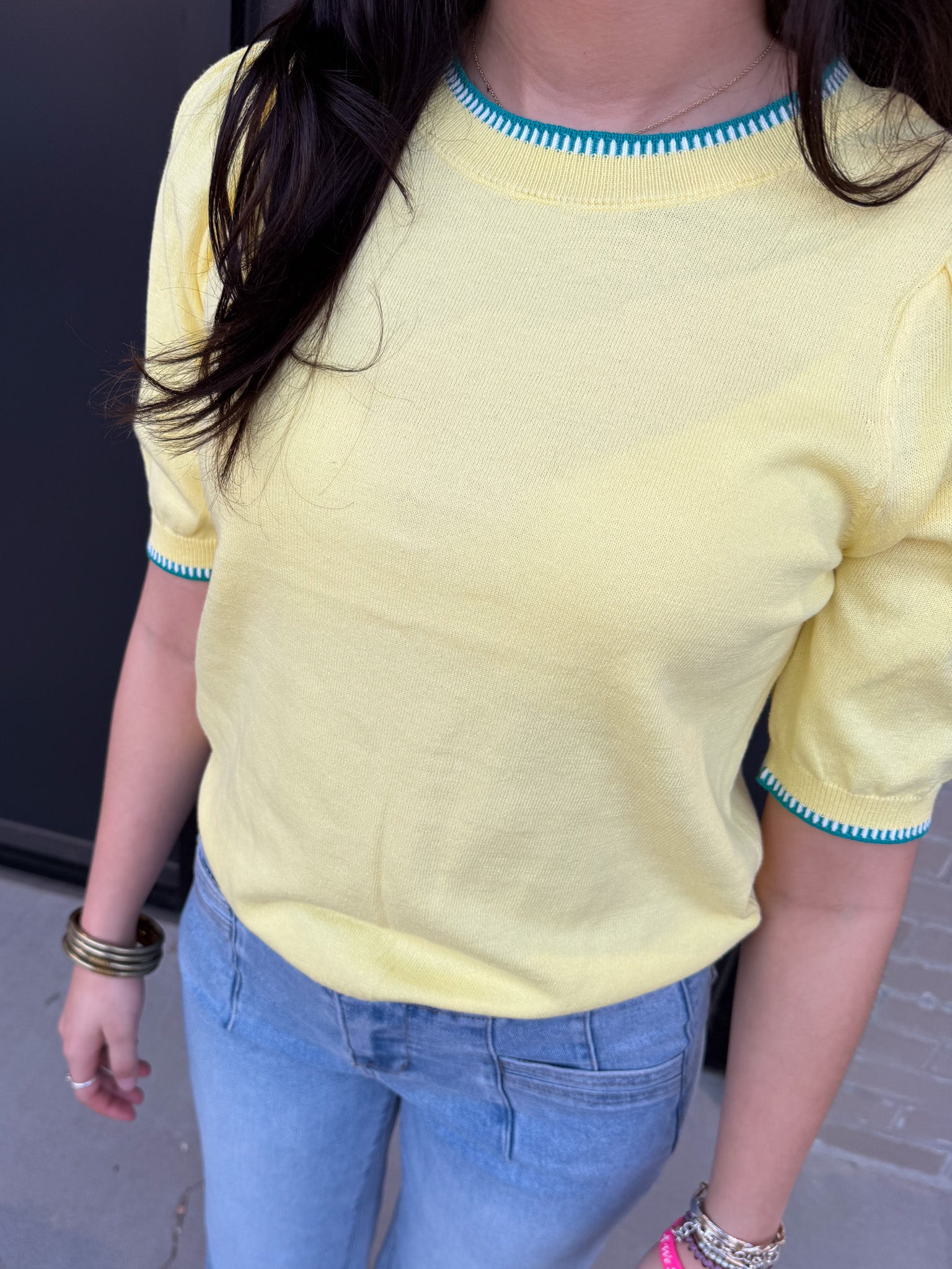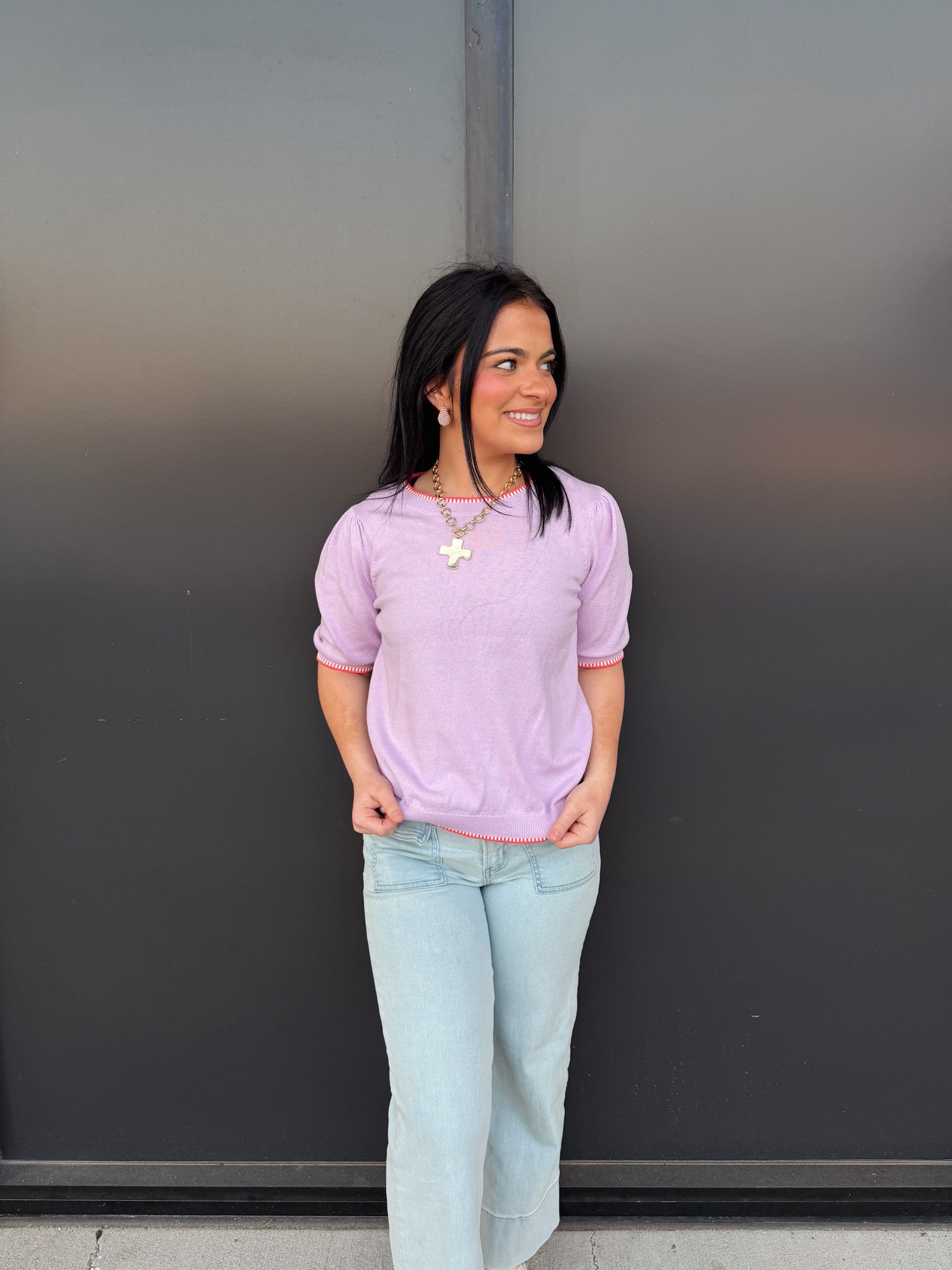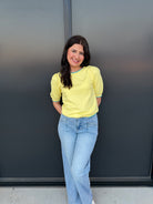 Make a statement with this vibrant solid sweater featuring eye-catching blanket stitched edges and charming puff half sleeves. Crafted from 100% cotton for breathable comfort and lasting quality, this sweater brings a pop of personality to any outfit.