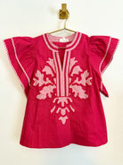 This elegant blouse features charming ruffle sleeves and crisp white trim detailing along the sleeves and v-neckline. A striking large detail at the center creates a beautiful focal point, making this piece perfect for both special occasions and elevated everyday wear.