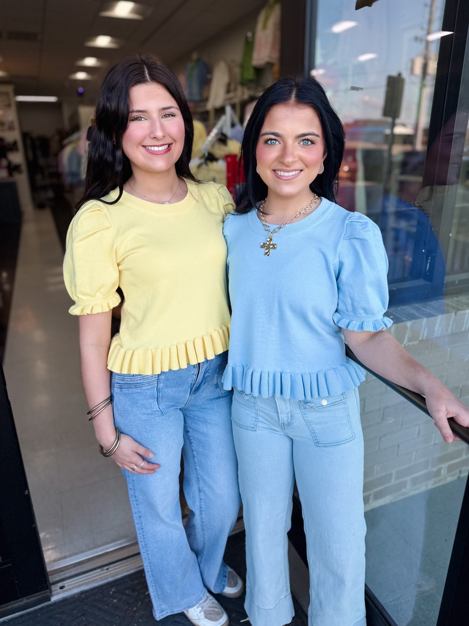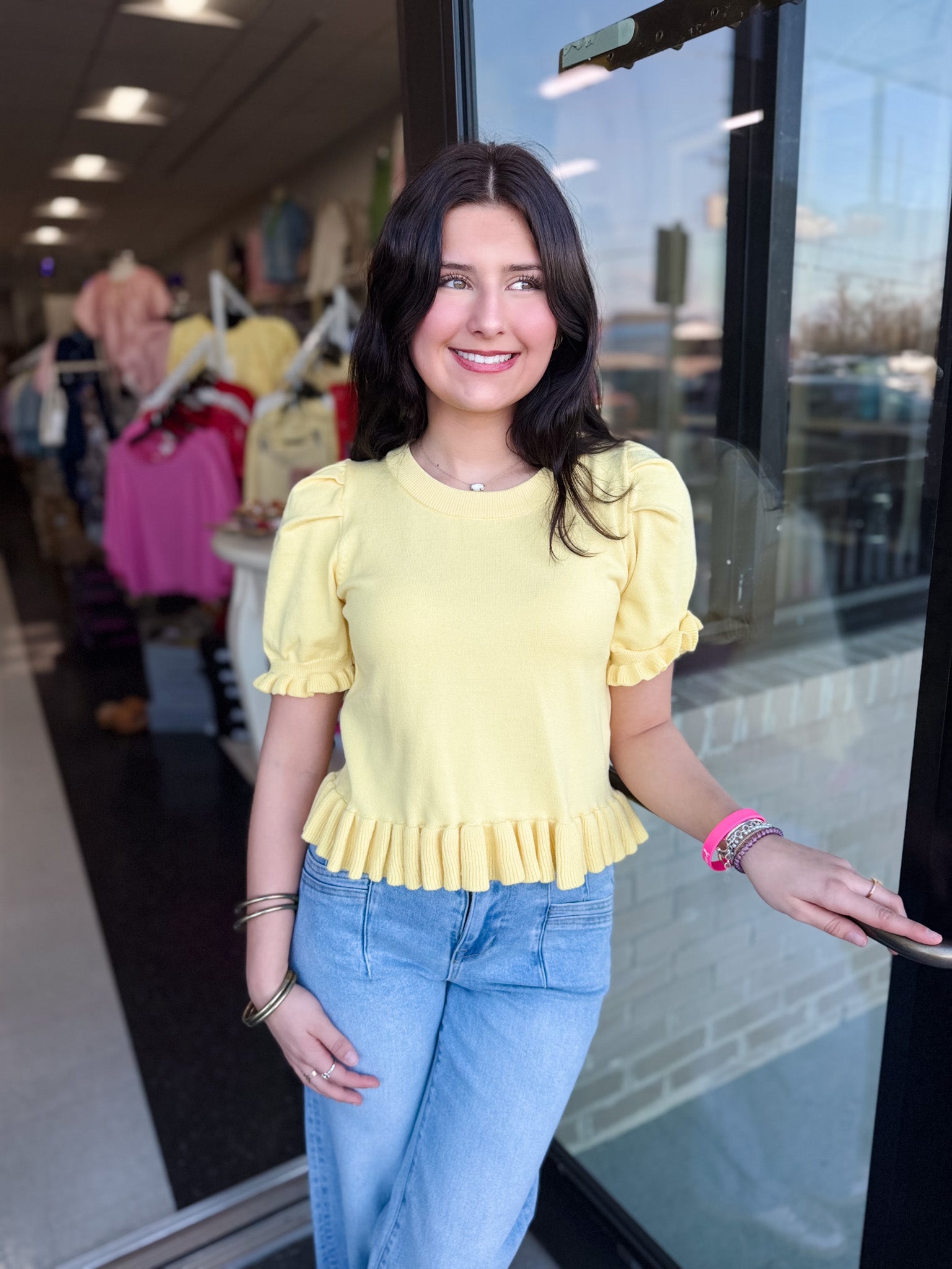 Pretty and precious scoop neck top featuring delicate ruffle trim along the armholes and bottom hem. Perfect elegance with a soft knit feel.