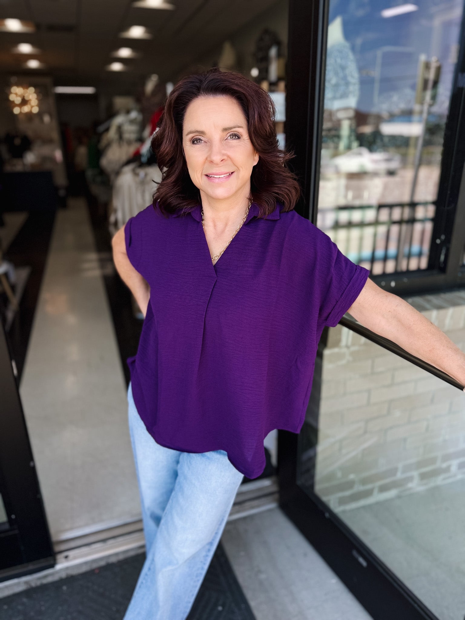 The She+Sky Reddilicous Top features a refined drop shoulder design and a structured collar for a sophisticated yet relaxed silhouette. Crafted from woven fabric, this top pairs elegance with comfort, making it an ideal choice for polished everyday wear or layered styling. Its thoughtful construction enhances both style and ease, offering versatile charm to your wardrobe.