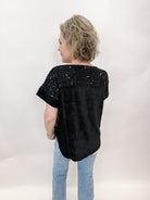 Indulge in luxury with The Sara sequin top. The intricate sequin and velvet design exudes elegance, perfect for any special event. Its round neckline and cuffed velvet short sleeves add a touch of sophistication. Elevate your style and make a statement with this stunning top.