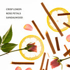 BLUE SANDALWOOD SCENT: Earthy and sophisticated. Smooth sandalwood blends with airy rose petals and a hint of crisp lemon, evoking peace and balance.