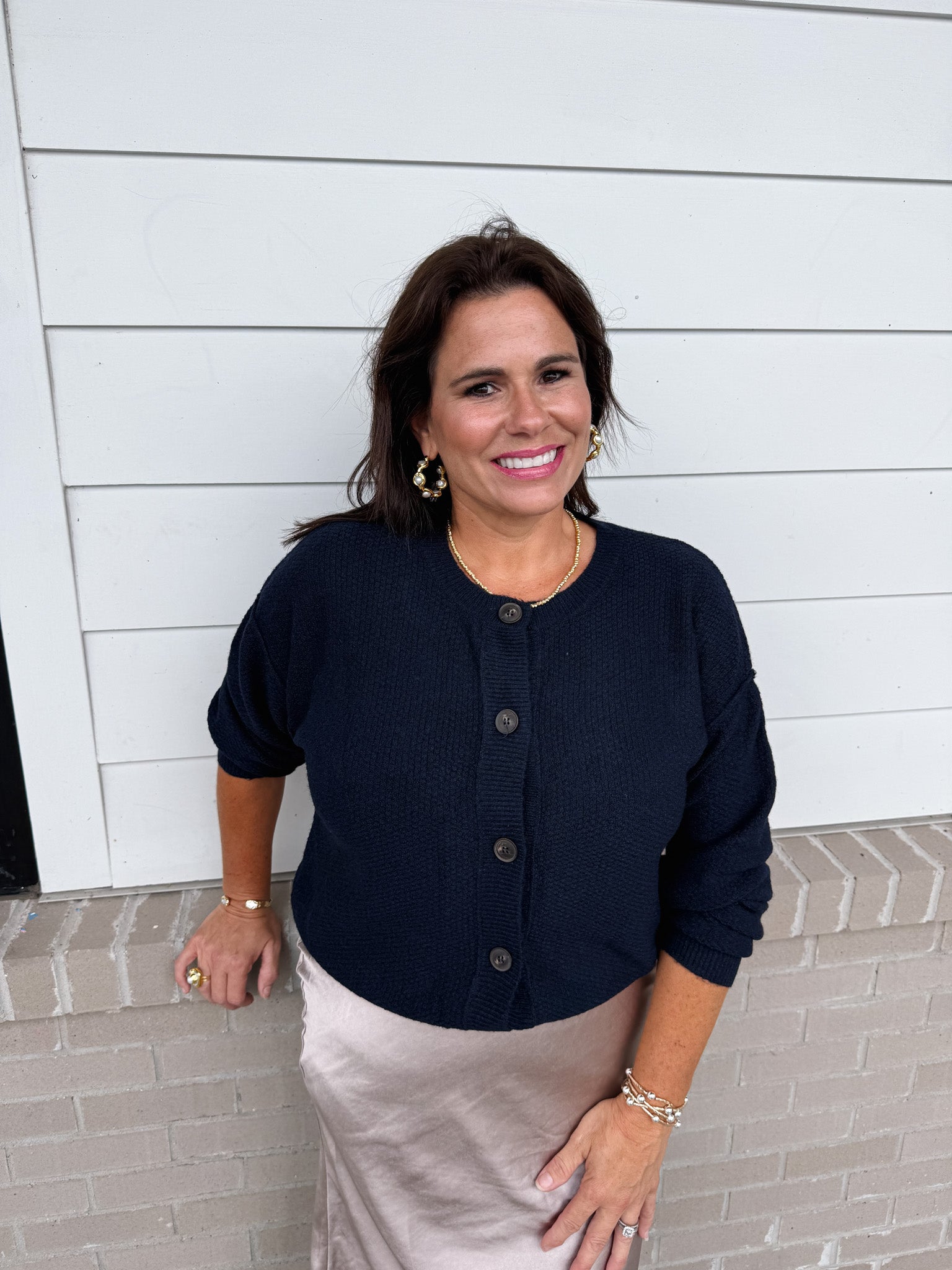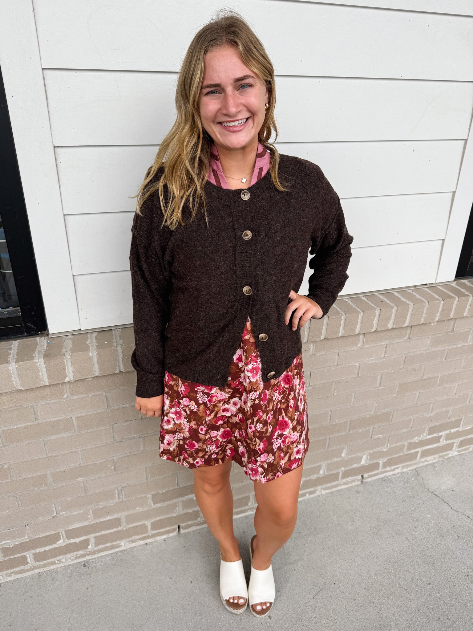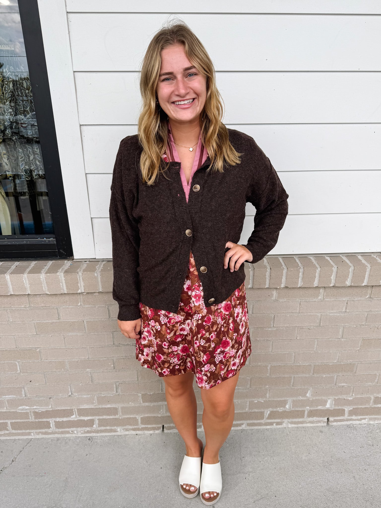 Elevate your wardrobe with the Blu Pep Dancing Away Cardigan, featuring a timeless round neckline and long sleeves with a relaxed drop shoulder design. The subtle ribbed trim adds refined texture, while the solid knit construction offers effortless layering without added bulk. Designed for a sophisticated yet comfortable fit, this cardigan transitions seamlessly from casual to chic with ease.