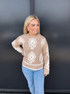 Refresh your wardrobe with this printed long sleeve sweater knit top, designed with a classic round neckline and a flattering, relaxed silhouette. The soft sweater knit offers comfort and warmth while the playful print adds a touch of personality to your everyday style.