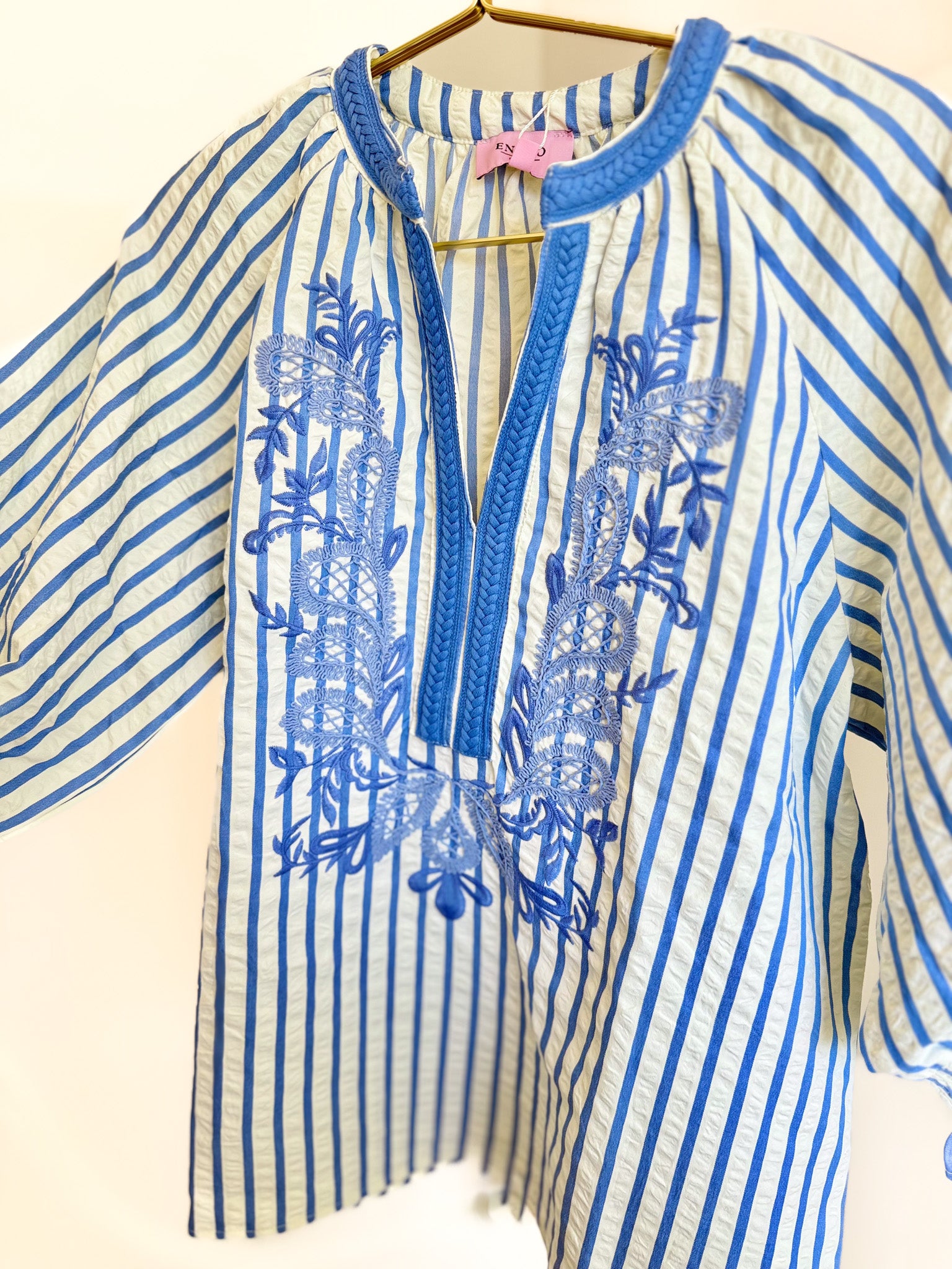 Discover the perfect blend of classic stripes and romantic embroidery with this beautifully crafted top. Featuring crisp white fabric with light blue vertical stripes, delicate braid trim along the neckline, and an enchanting embroidered floral pattern across the chest, this piece brings artisan charm to your everyday wardrobe.