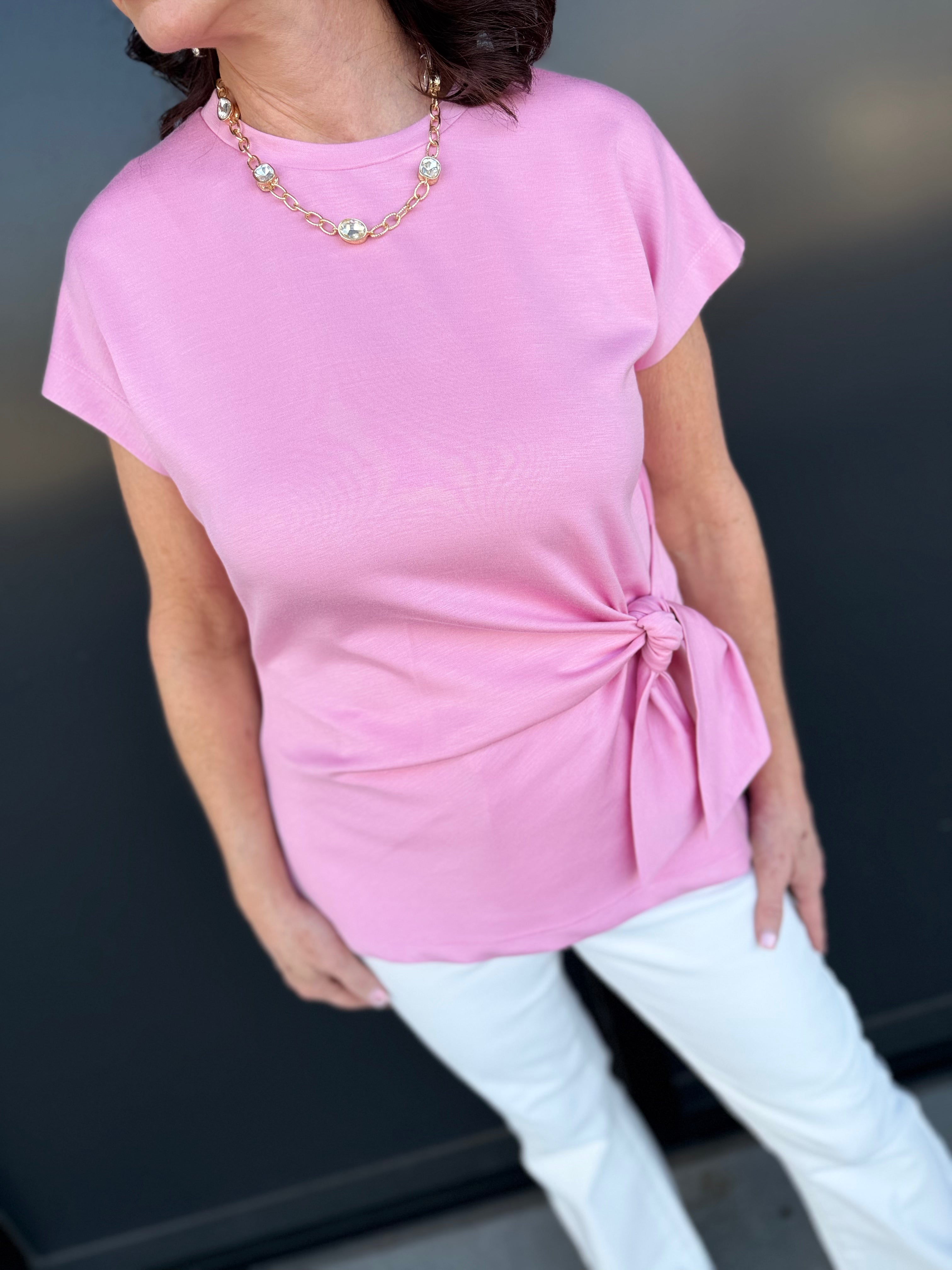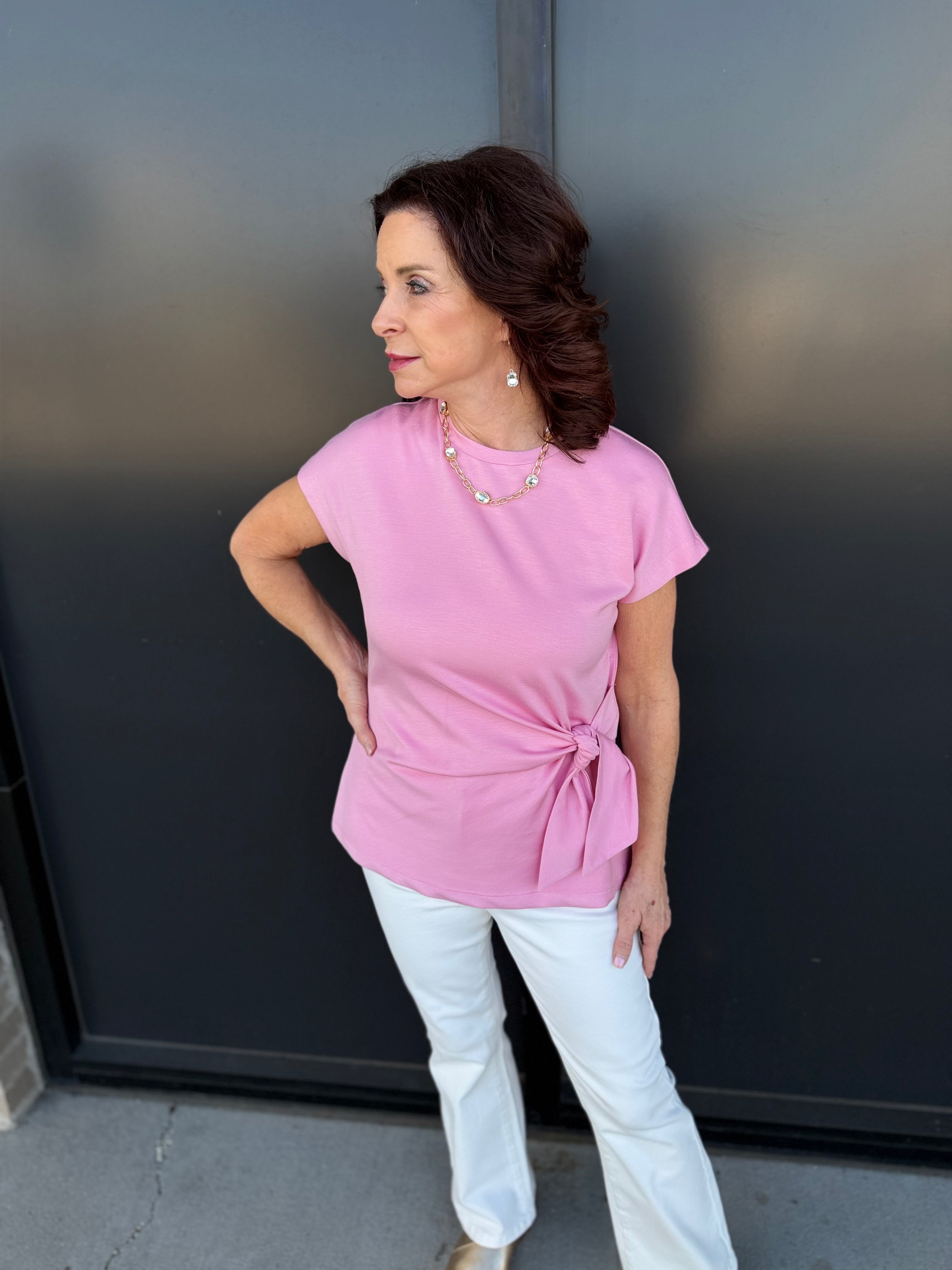 Discover effortless femininity with this charming Entro light pink side knot top. The flattering side knot detail creates a beautiful silhouette while the soft pink hue adds a touch of romance to any outfit. Designed with versatility in mind, this top transitions seamlessly from casual daywear to elevated evening looks.