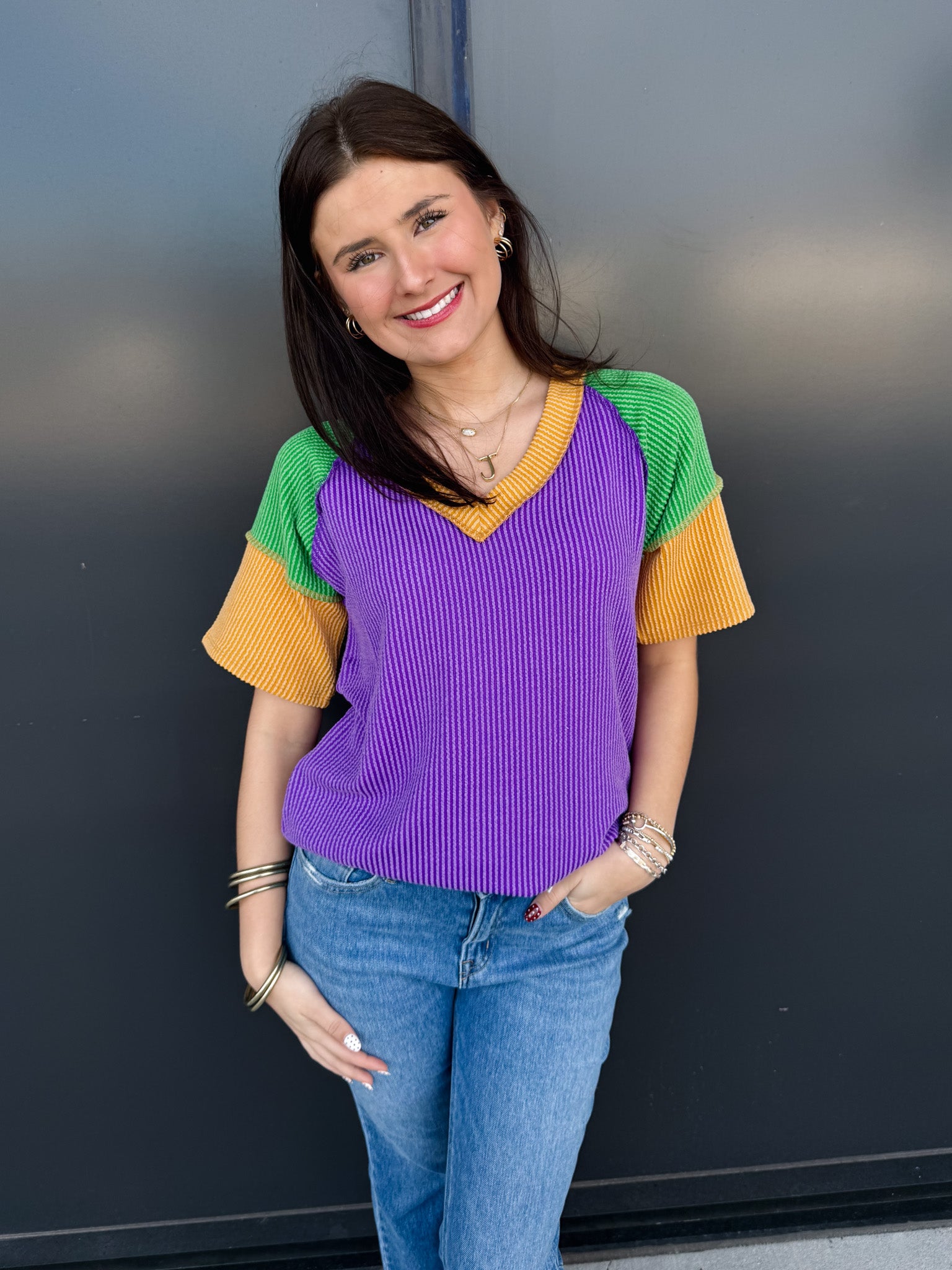 Mardi Gras Raised Rib Color Block Top!