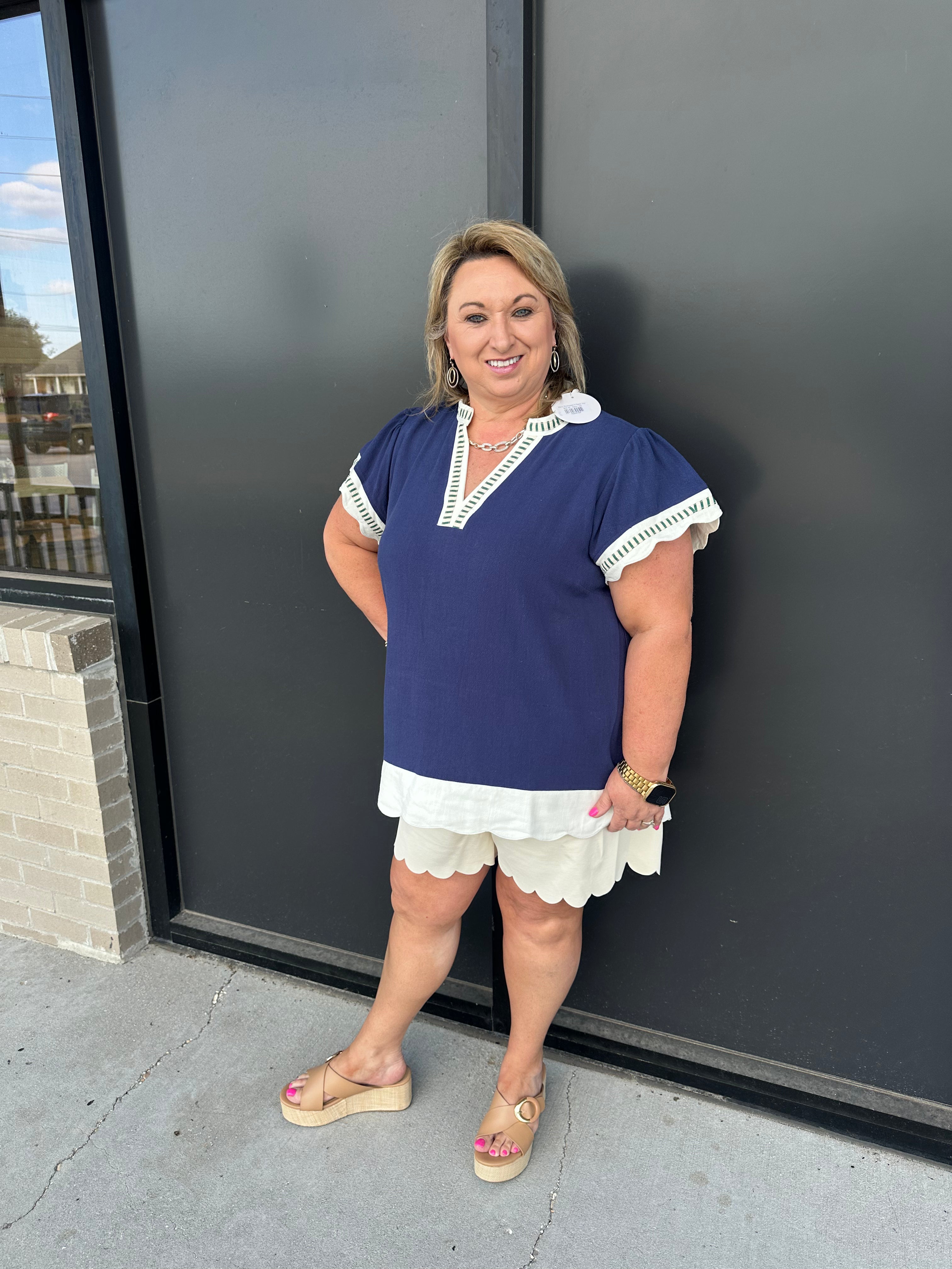 Navy Scalloped V-Neck Top