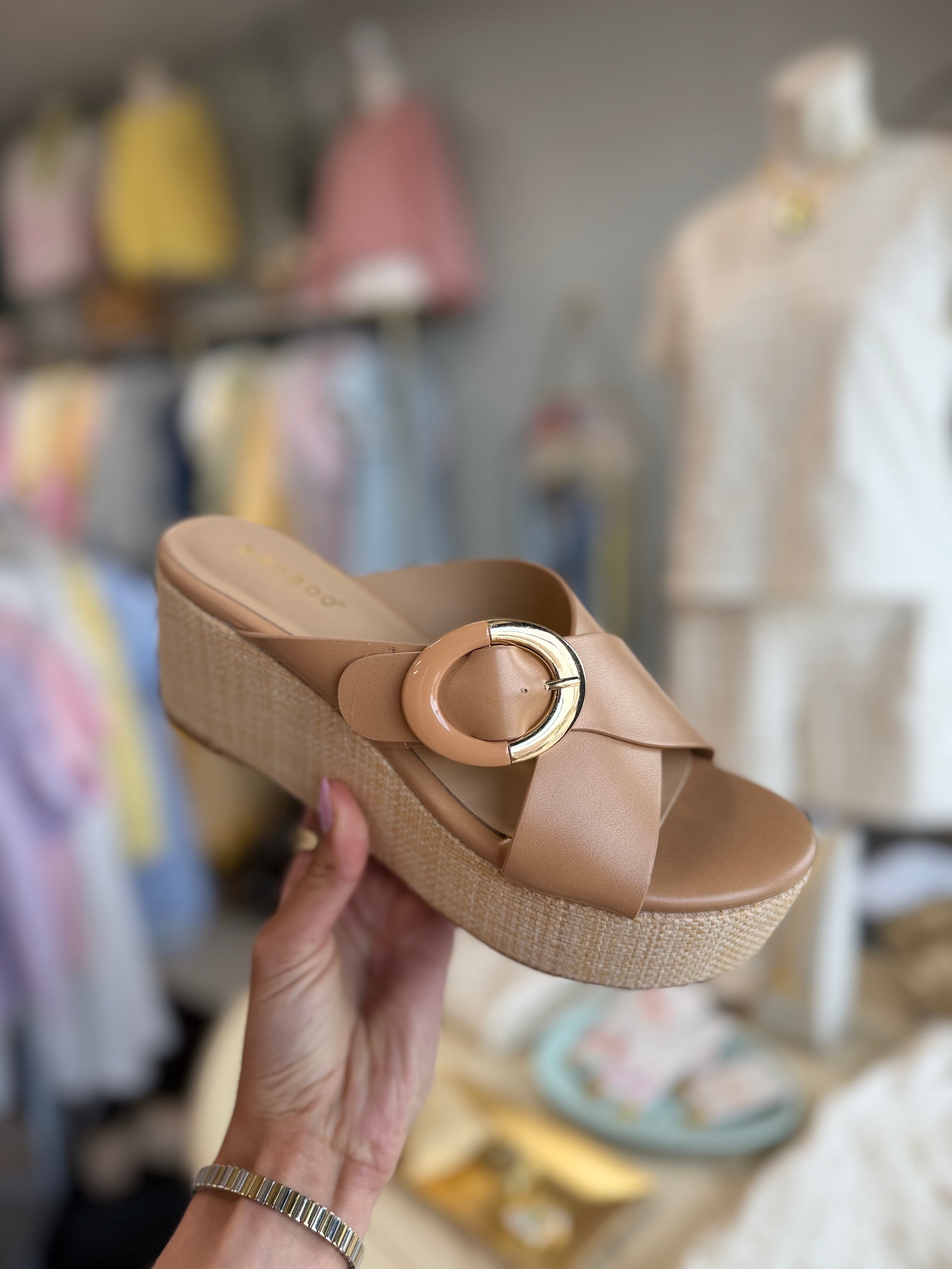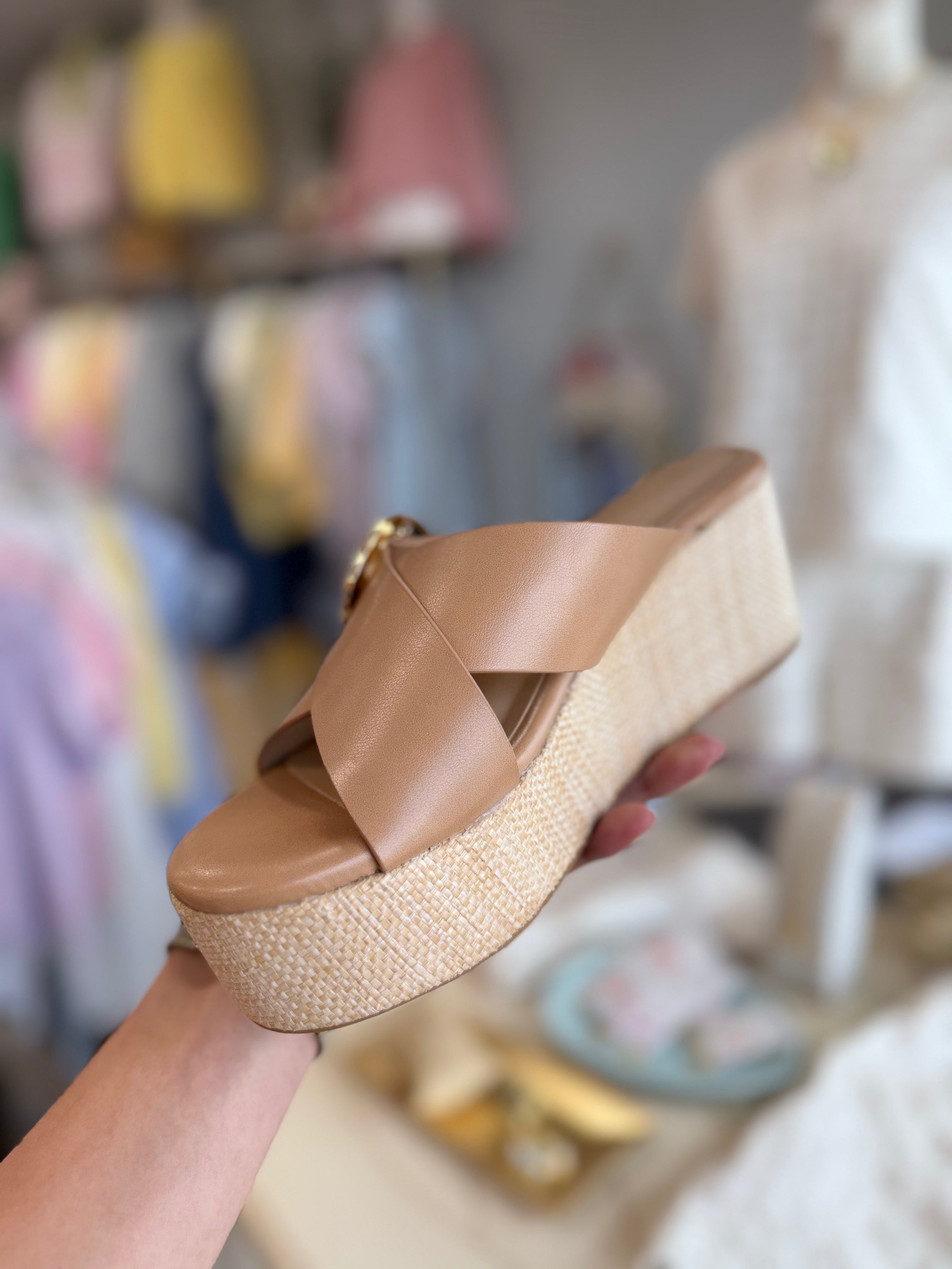 The perfect sandal doesn’t make you choose between style and comfort. The Buckle Cross Band Wedge Sandal in Tan slips on in seconds, adds just the right amount of lift with a ~2-inch wedge, and pairs with virtually everything in your warm-weather wardrobe. The cross band design with adjustable buckle detail keeps things secure and polished — from a morning stroll to an evening out.