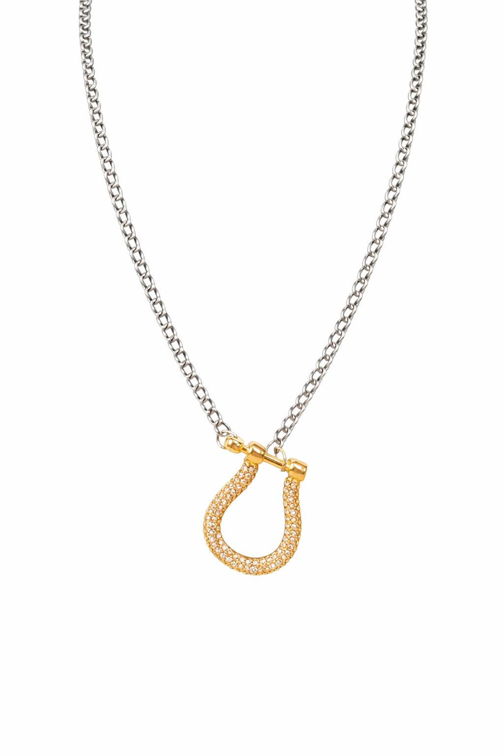 A refined equestrian statement piece, the Golden Spur Necklace pairs a lustrous rhodium-plated silver chain with a 14K gold-plated horse bit charm set with pavé crystals. Effortlessly elevated — from the barn to the boardroom.