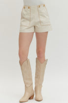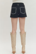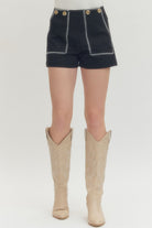 Solid high-waist shorts featuring contrast blanket stitch detailing and button accents at front. Hidden zip closure at front. Decorative tab detail at back waist. Front and back pockets.