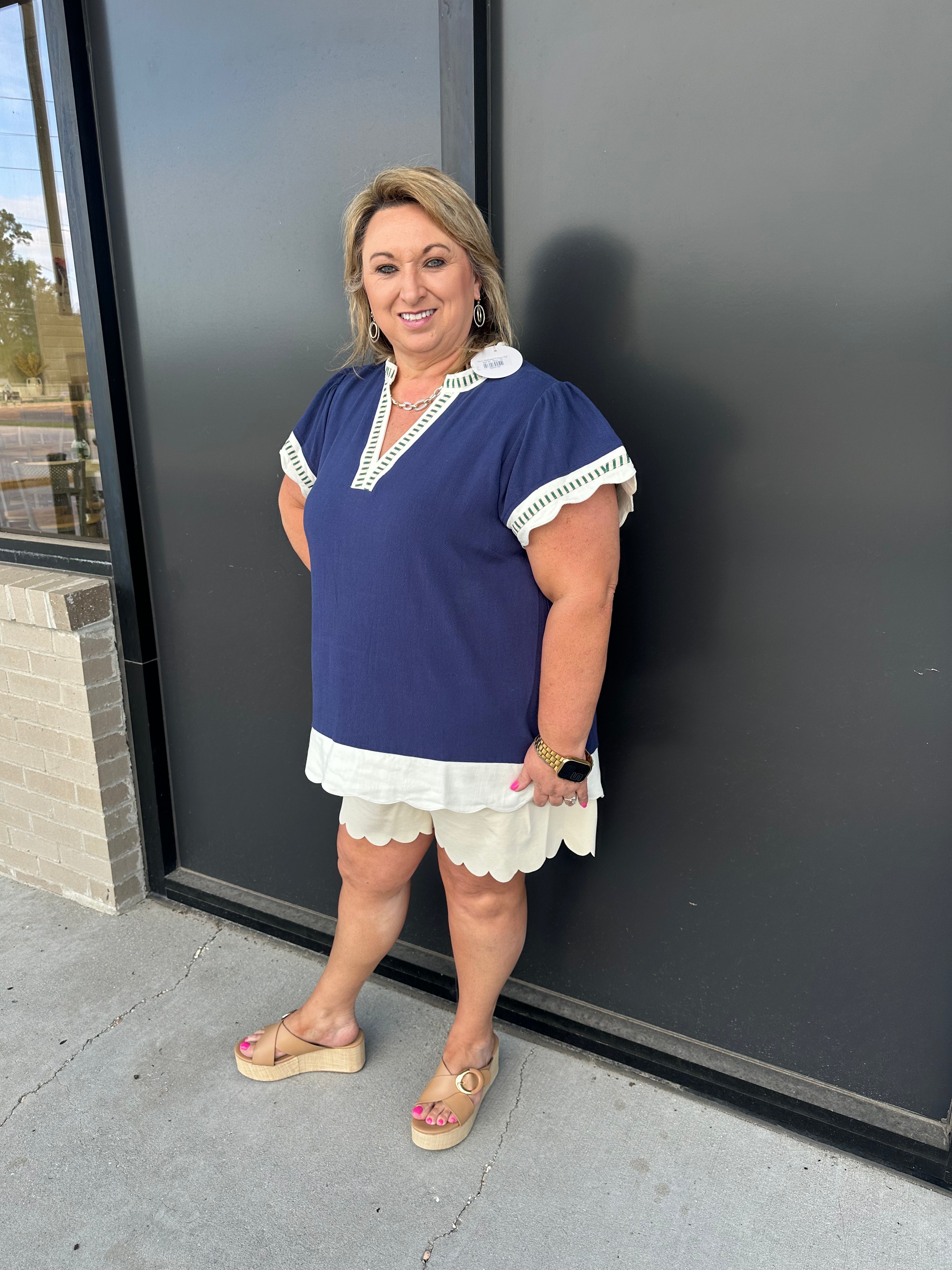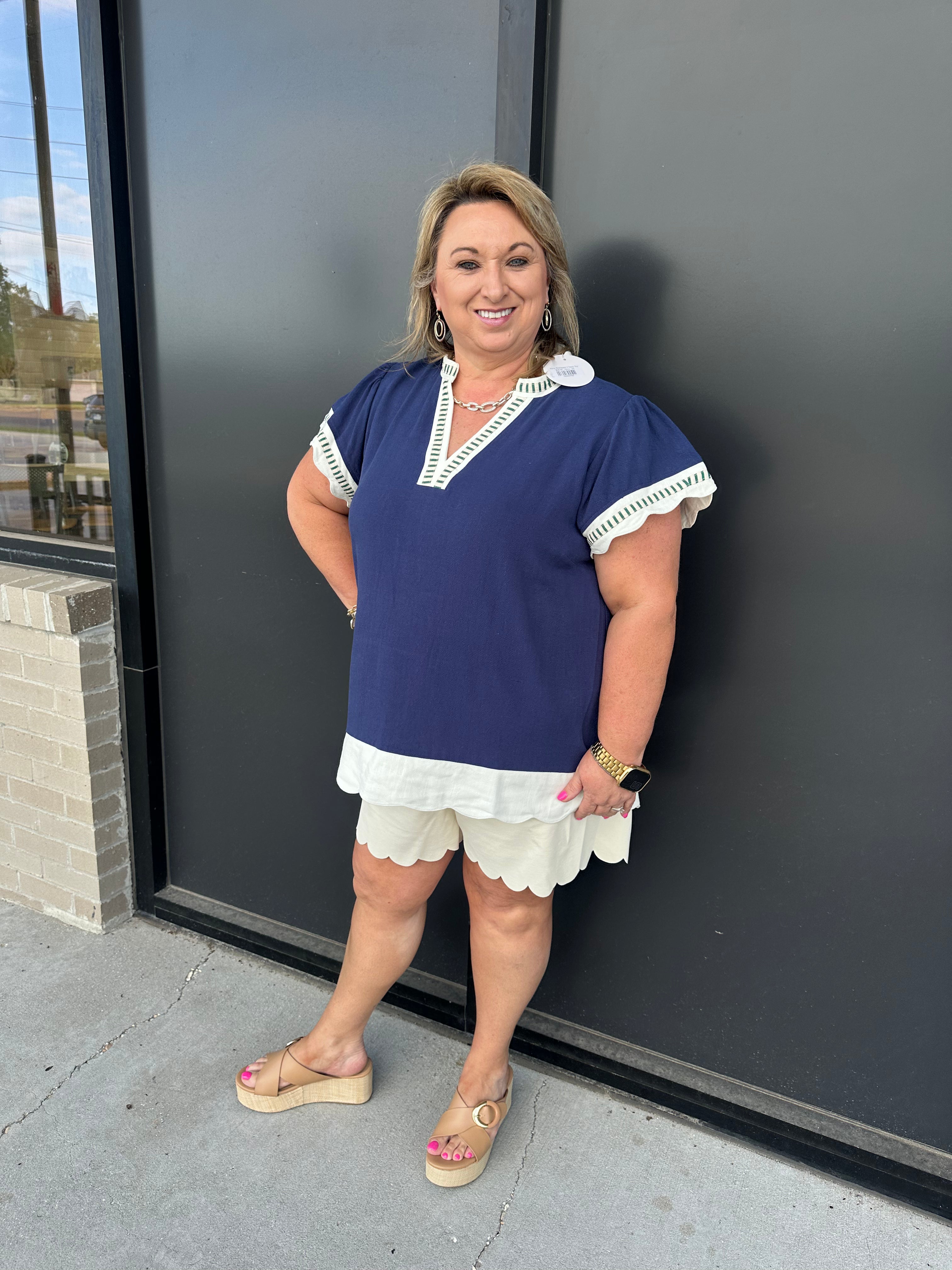 Effortlessly refined and made for warm-weather dressing, this short sleeve v-neck top blends relaxed linen ease with thoughtful, editorial detail. The scalloped, trimmed waistband and sleeves lend a delicate structure, while a signature green stripe accent on the trim adds a fresh, unexpected pop of color — the kind of detail that makes a simple top anything but ordinary.