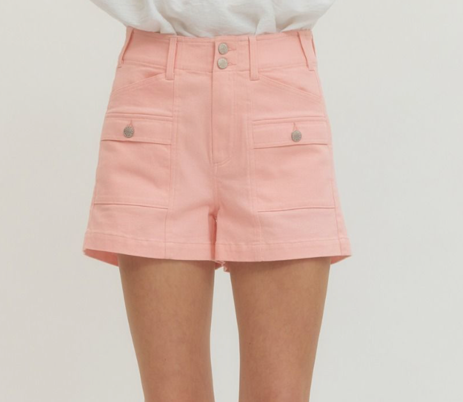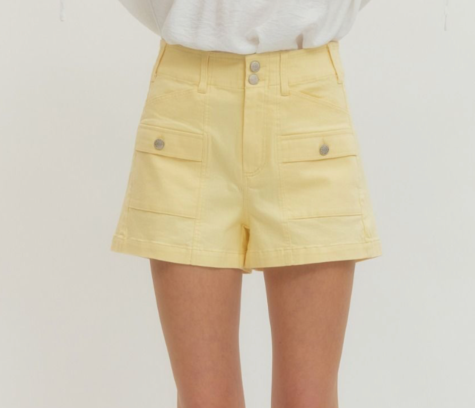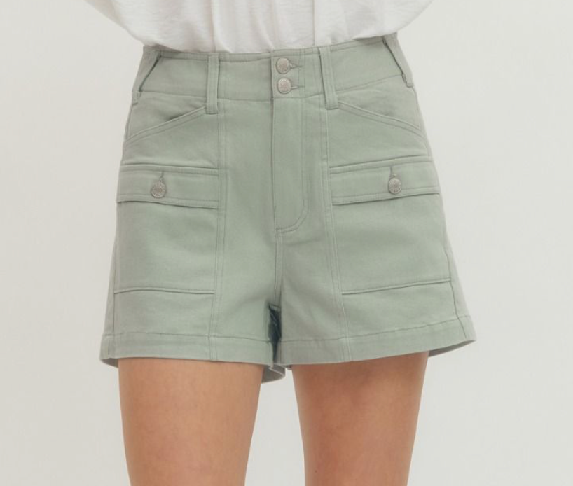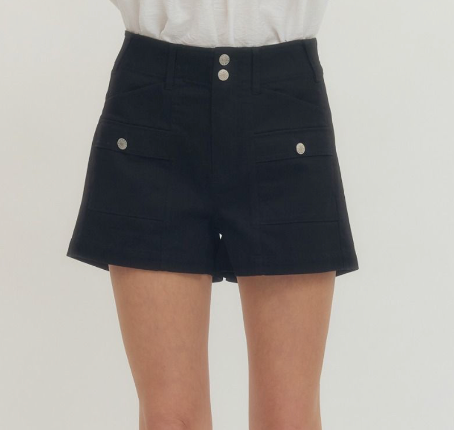 Solid woven shorts featuring double button and zipper closure at front, belt loops, and front patch pockets with flap and button detail. Additional slanted pockets at sides. Back patch pockets.