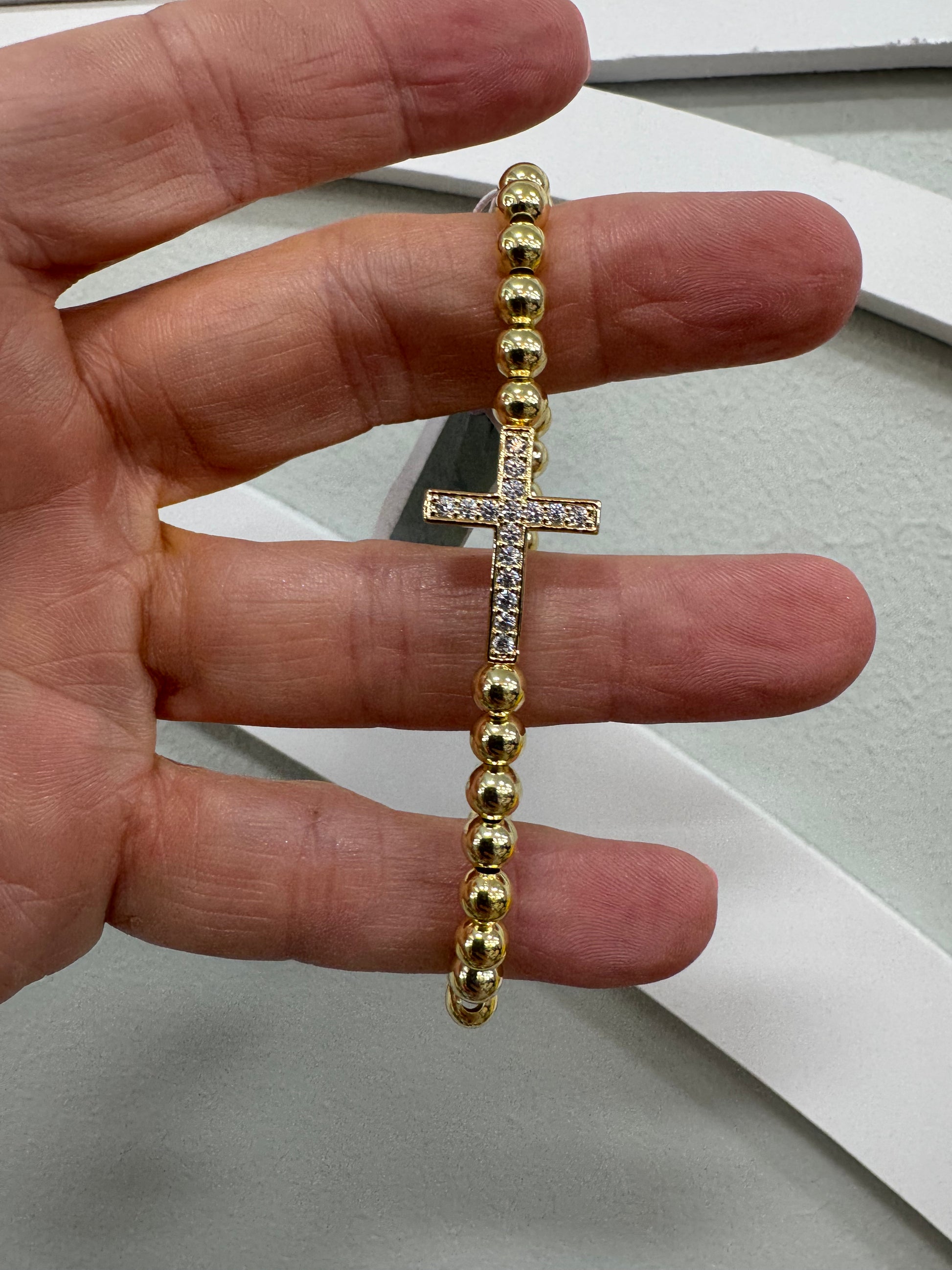 Indulge in luxury with our stunning 14K CZ cross stretch bracelet. Made with gorgeous 14K gold plating and adorned with a sparkling CZ gold cross, this bracelet effortlessly exudes elegance and sophistication. Elevate any outfit and make a statement with this exclusive piece.