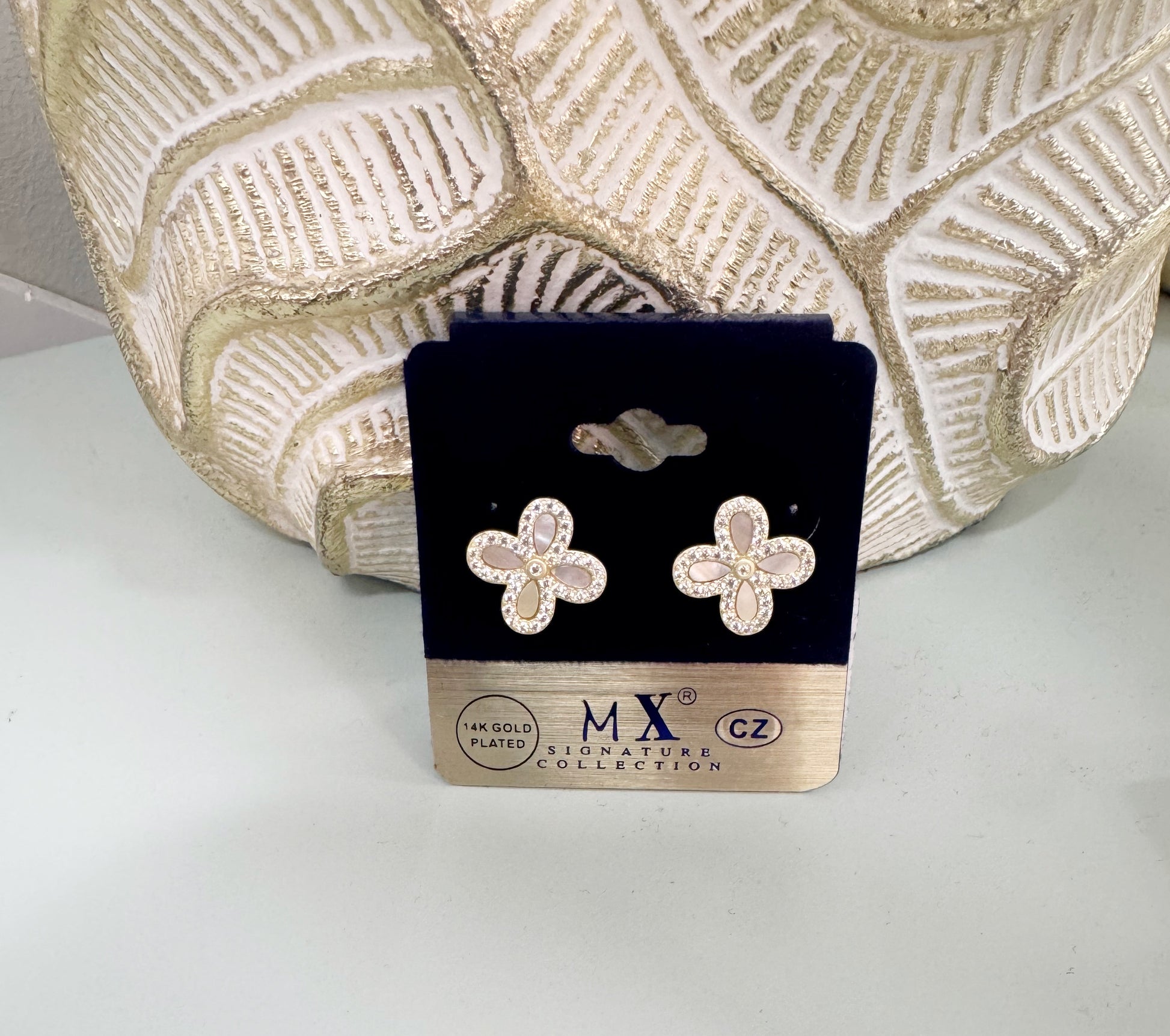 Elevate your style with our 14k Mother of Pearl stud earrings. These stunning flower studs are a must-have for any luxury jewelry collection and are surrounded by CZ. The lustrous Mother of Pearl adds a touch of elegance, while the post stud backing ensures a secure and comfortable fit. Perfect for any occasion.