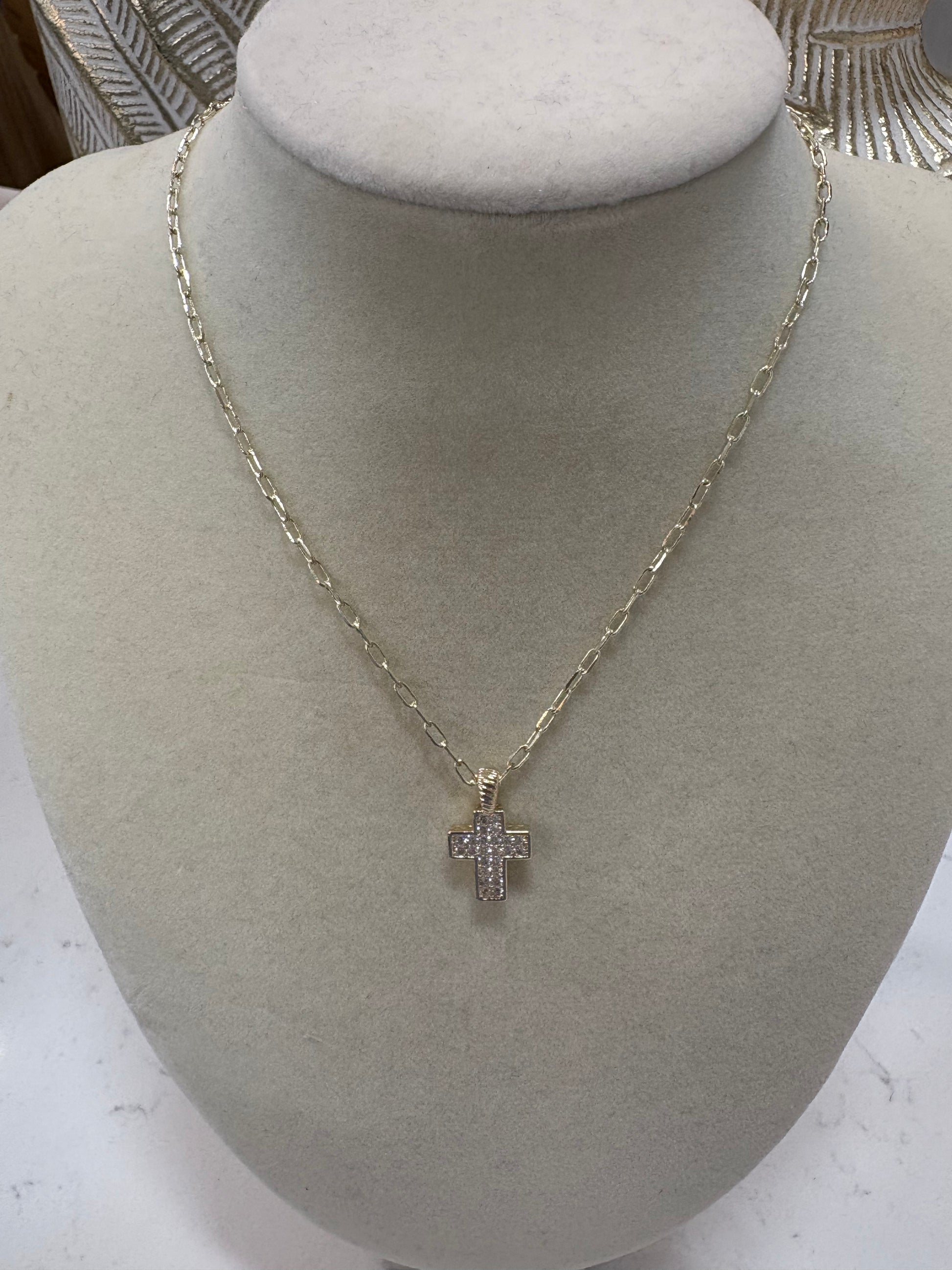 This stunning necklace features a one inch CZ cross charm plated in 14K gold. The intricate design exudes elegance, making it the perfect accessory for any occasion. Its luxurious aura will elevate any outfit and add a touch of sophistication to your look. Experience the beauty and exclusivity of this necklace.