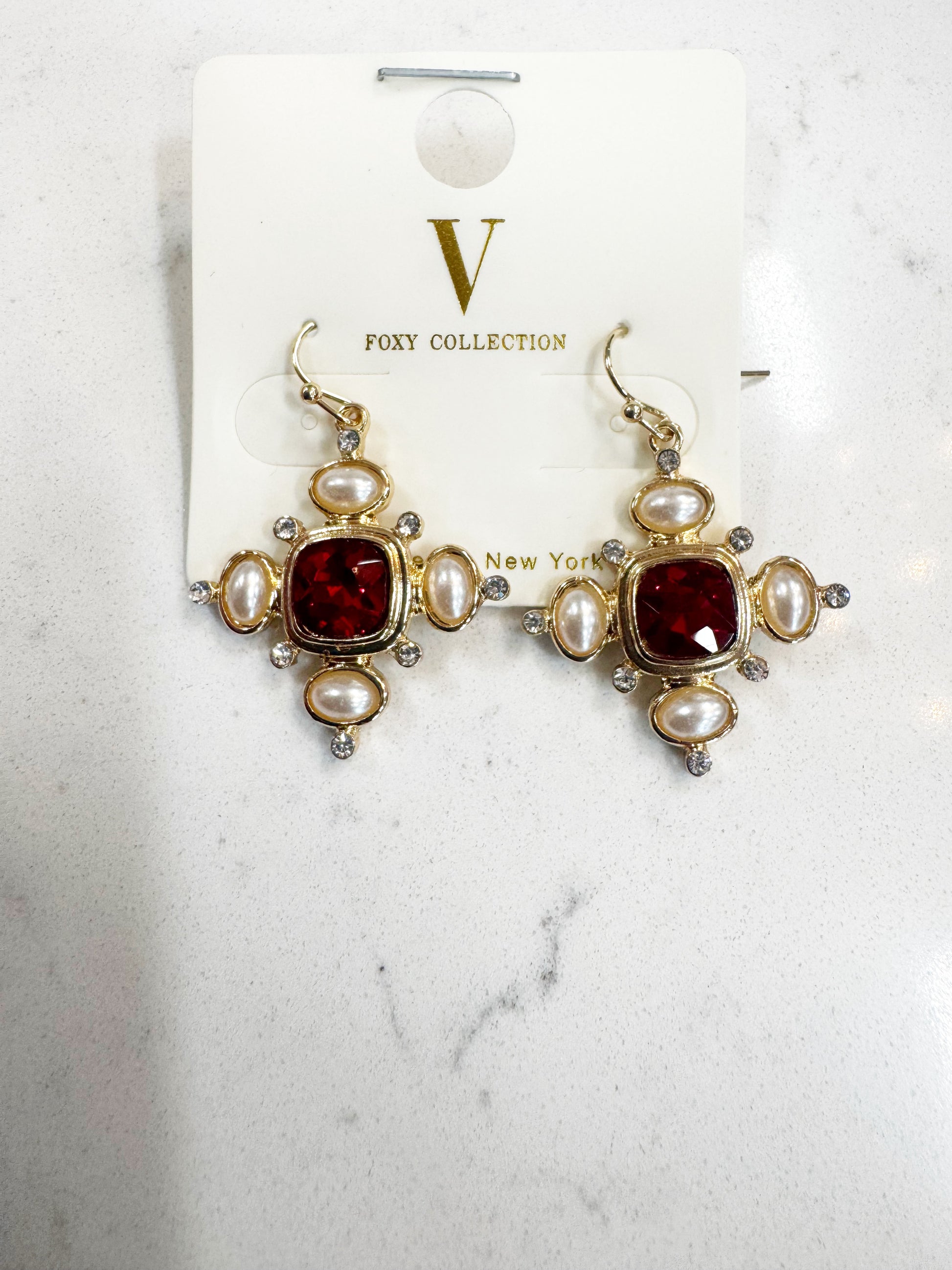 Add a touch of holiday sparkle with the Noel Gemstone Drop Earrings, a stunning statement piece designed to elevate any festive look. These 5-stone dangle earrings feature a captivating arrangement of round and cushion-cut glass stones in radiant red, deep emerald, and brilliant clear hues, capturing the spirit of the season with refined sophistication.